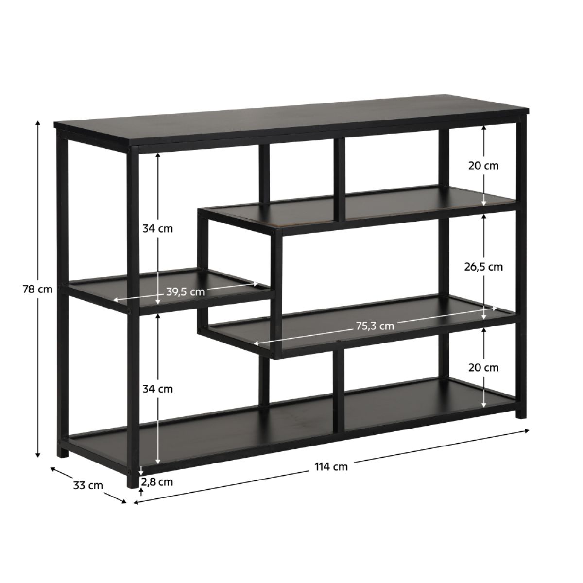 Material: metal/MDF laminat Culoare: neagră Dimensiuni (LxAxÎ): 114x33x78 cm Grosime placă MDF: 1,5 cm Înălţime picioare: 2,8 cm Capacitate de încărcare pe fiecare raft: 5 kg Spaţiu de depozitare deschis Cinci zone de depozitare Structură metalică Vă recomandăm să ataşaţi mobilierul de perete Livrată dezasamblată