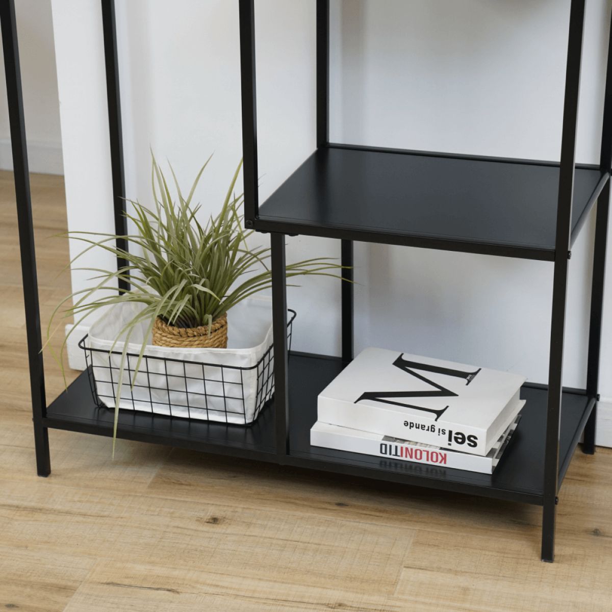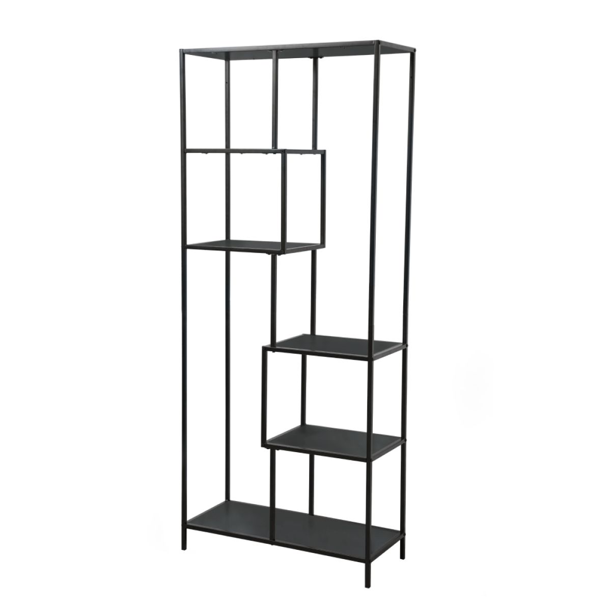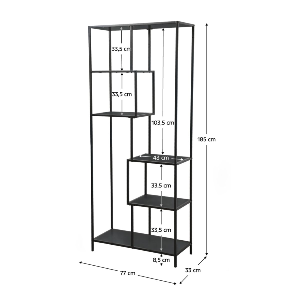 Material: metal Culoare: neagră Dimensiuni (LxAxÎ): 77x33x185 cm Înălţimea picioarelor: 8,5 cm Capacitate de încărcare pe fiecare raft: 8 kg Spaţiu de depozitare deschis şase zone de depozitare Structură metalică Vă recomandăm să ataşaţi mobilierul de perete Livrată dezasamblată