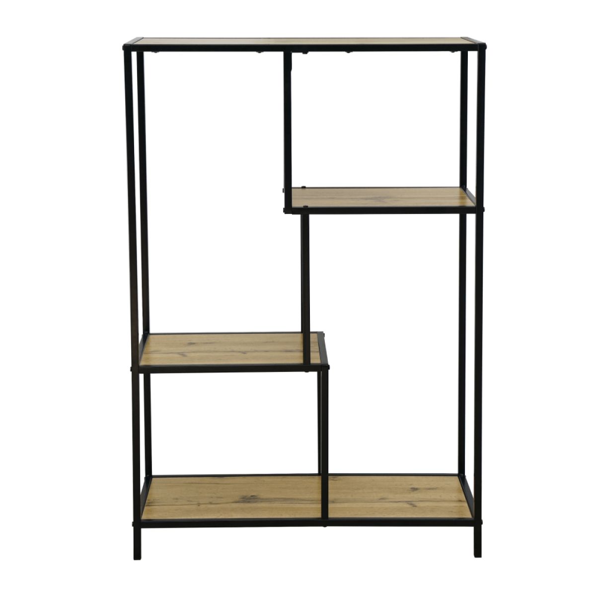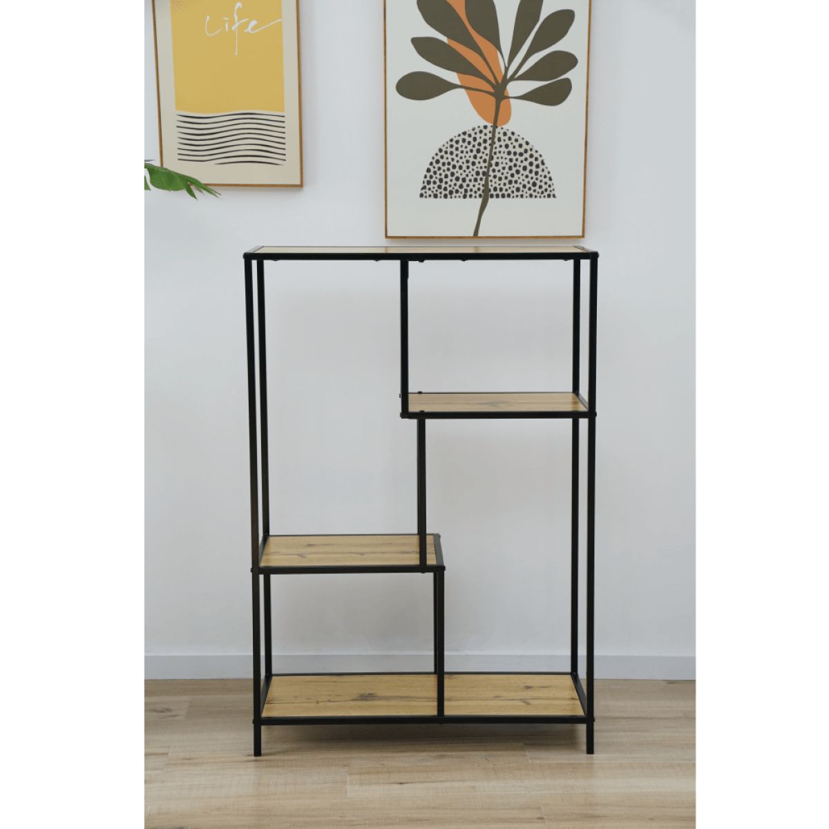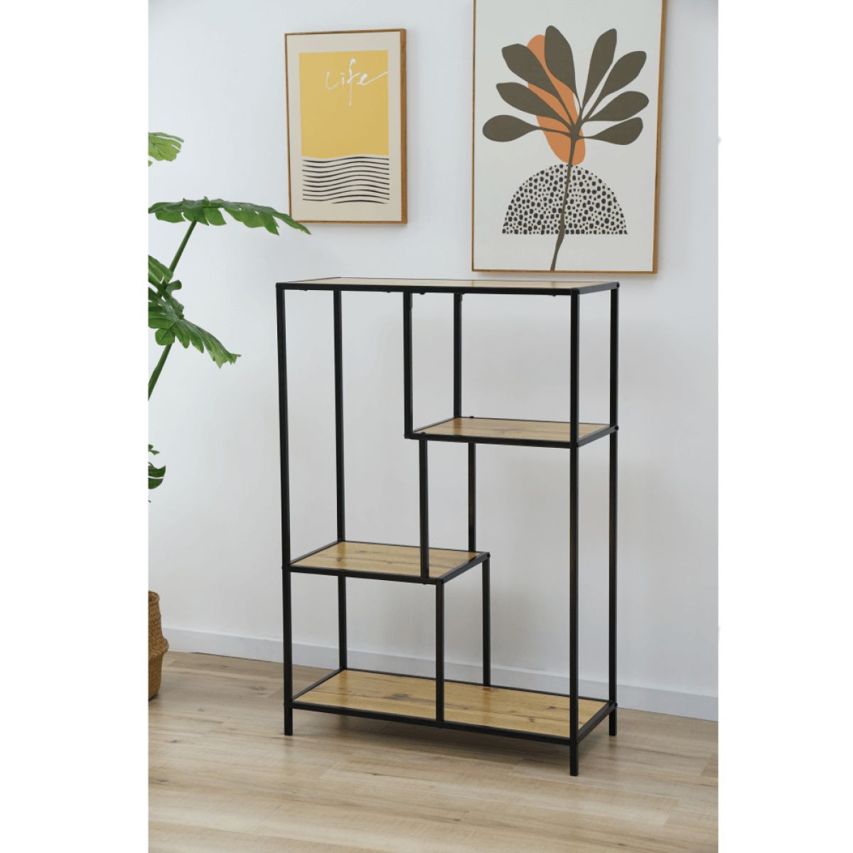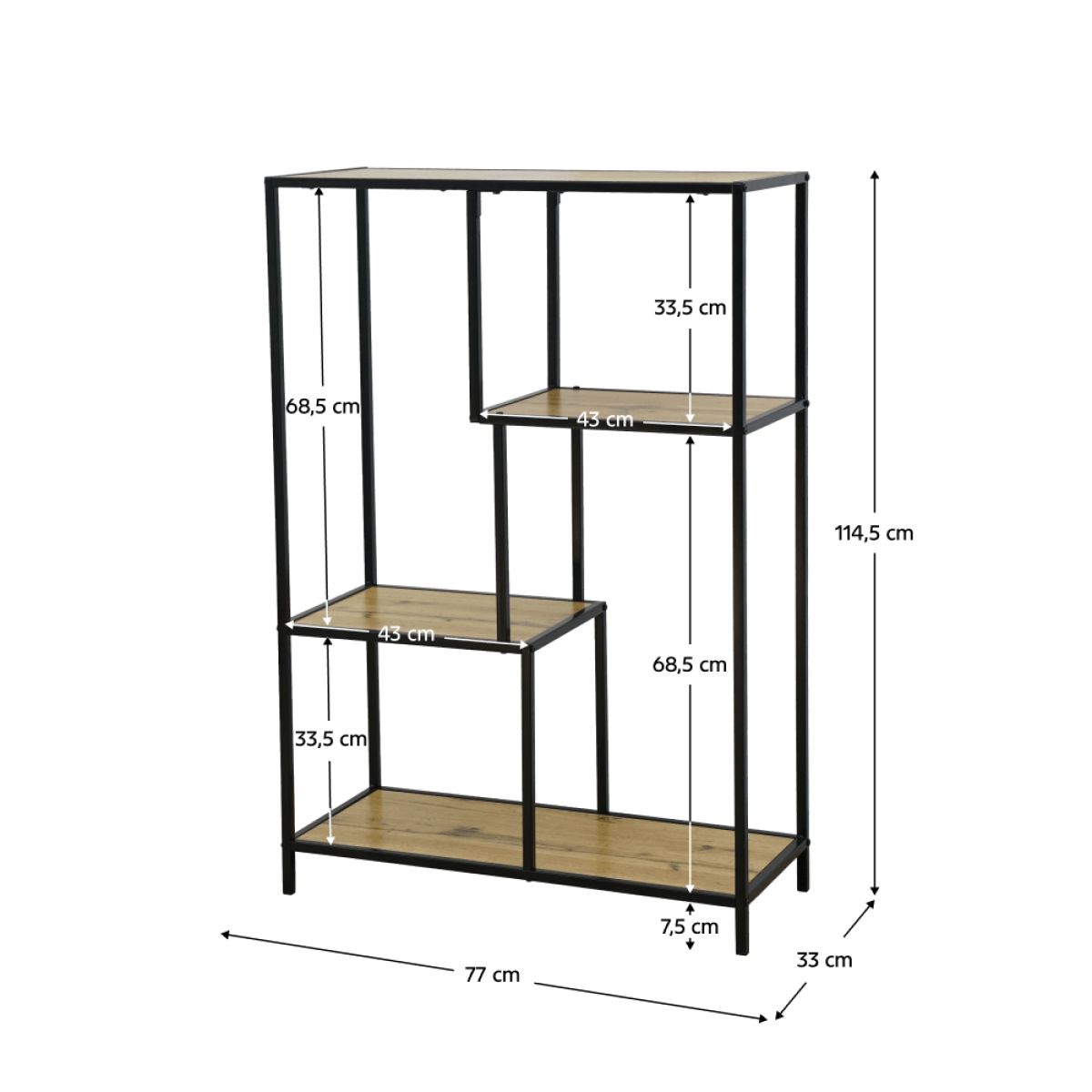 Material: metal / MDF laminat Culoare: neagră / stejar Dimensiuni (LxAxÎ): 77x33x114,5 cm Grosime MDF: 1,5 cm Înălţime picioare: 7,5 cm Capacitate de încărcare pe fiecare raft: 5 kg Spaţiu de depozitare deschis Patru zone de depozitare Structură metalică Vă recomandăm să ataşaţi mobilierul de perete Livrată dezasamblată