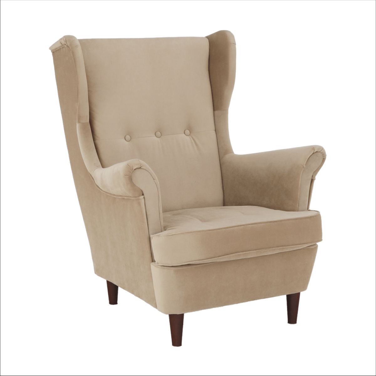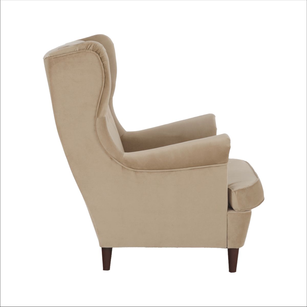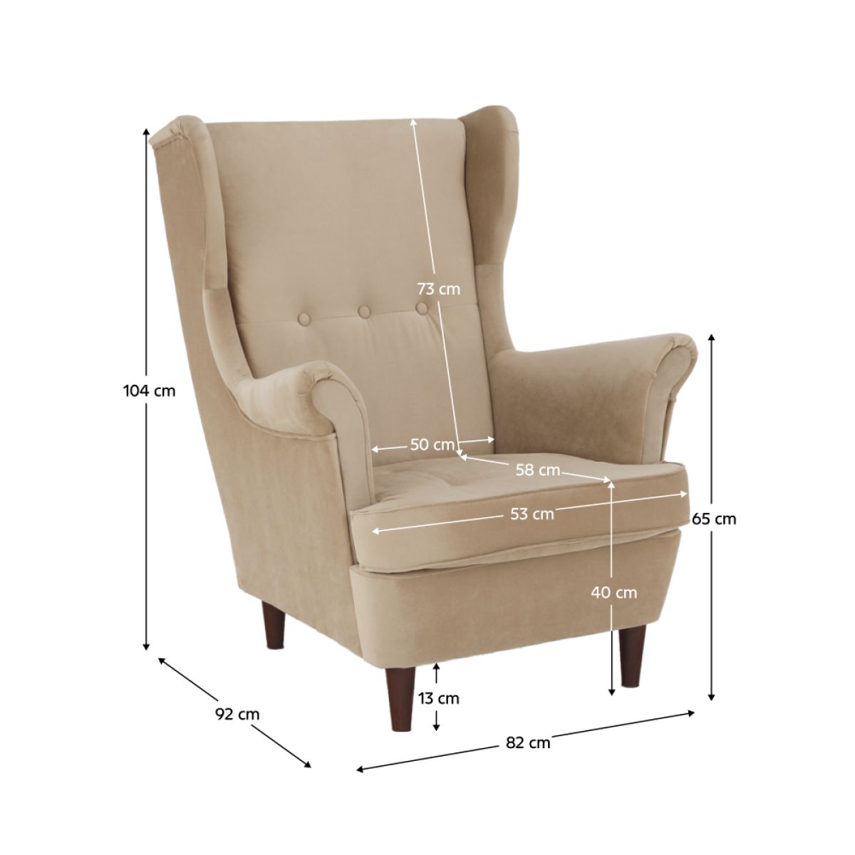 Material: material textil Kronos 35/lemn Rezistenţa materialului: 60 000 Martindale Culoare: bej auriu/nuc Dimensiuni fotoliu (lxhxA): 82x104x92 cm Înălţime şezut: 40 cm Adâncime şezut: 58 cm Înălţimea spaţiului inferior de la podea: 13 cm Înălţimea spătarului: 73 cm Înălţimea de la sol până la cotieră: 65 cm Lăţimea scaunului: 53 cm Picioare din lemn Culoarea picioarelor poate varia Livrat nemontat