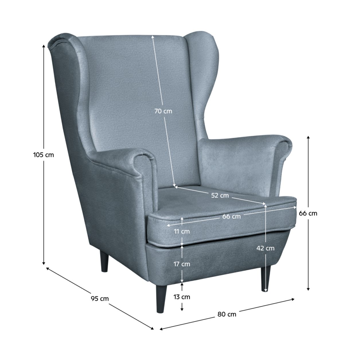 Material tapiţerie: ţesătură Element Rezistenţa ţesăturii la frecare conform testului Martindale: 50 000 de cicluri de frecare Culoarea tapiţeriei: gri albăstrui 23 Dimensiuni scaun (Lxlxh): 72x82x105 cm Adâncimea şederii: 54 cm Lăţime şezut: 66 cm Spătar înalt Înălţimea spătarului: 73 cm Înălţime de la sol până la cotieră: 66 cm Picioare din lemn Culoare picioare: wenge Înălţimea spaţiului inferior de la podea: 13 cm Tapiţat integral Portanţă: 120 kg Livrat dezasamblat