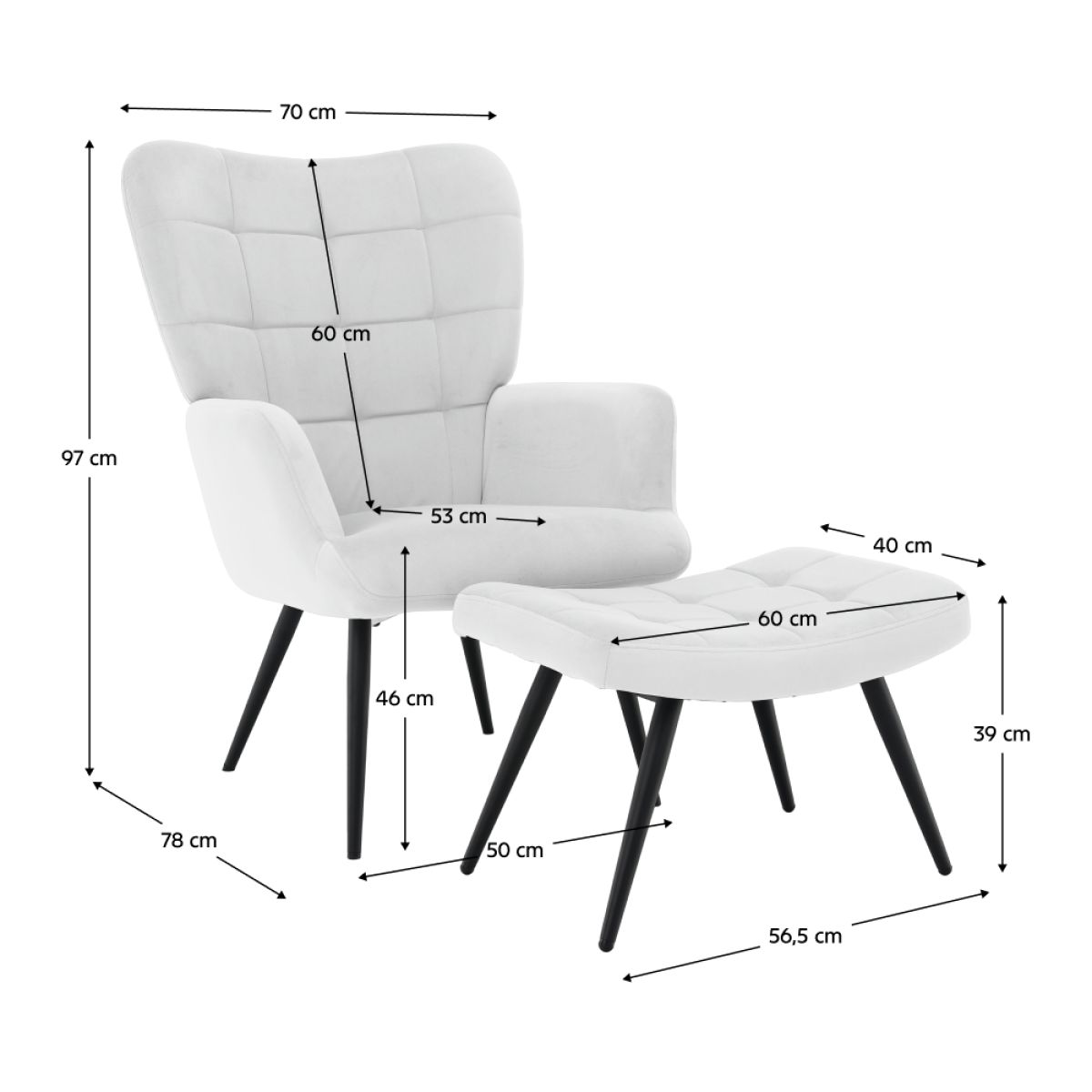 Material: ţesătură Velvet 46/ metal Rezistenţa ţesăturii la frecare conform testului Martindale: 95 000 de cicluri de frecare Culoare: gri deschis/negru Dimensiunile fotoliului (Lxlxh): 70x78x97 cm Înălţimea părţii de şezut: 46 cm Adâncimea părţii de şezut: 53 cm Dimensiunile bazei (Lxlxh): 56,5x40x39 cm Picioarele de la supportul de picioare sunt reglabile pe înălţime Portanţa fotoliului: 90 kg Portanţa suportului pentru picioare: 80 kg Livrat dezasamblat
