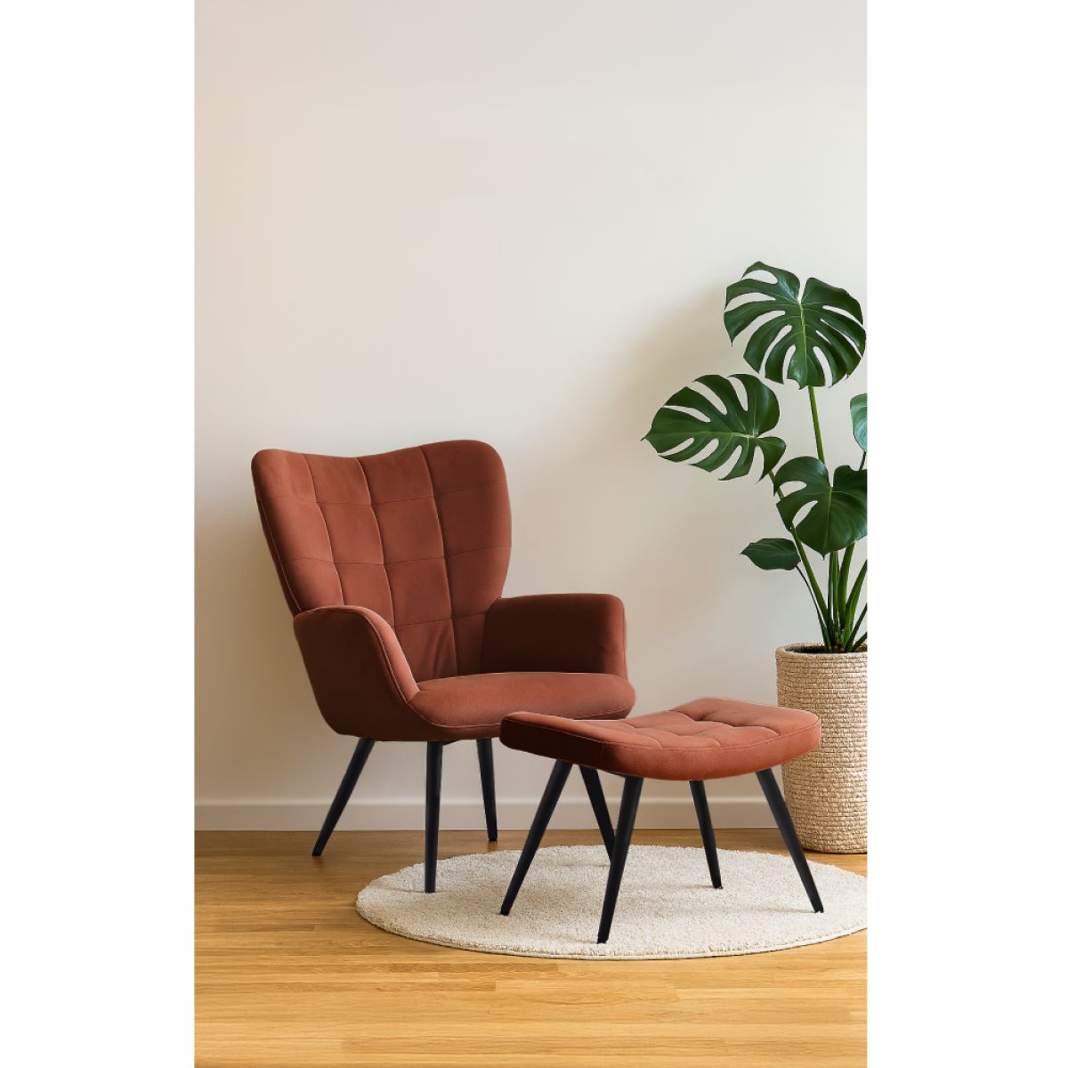 Material: ţesătură Velvet 15/ metal Rezistenţa ţesăturii la frecare conform testului Martindale: 95 000 de cicluri de frecare Culoare: maro/negru Dimensiunile fotoliului (Lxlxh): 70x78x97 cm Înălţimea părţii de şezut: 46 cm Adâncimea părţii de şezut: 53 cm Dimensiunile bazei (Lxlxh): 56,5x40x39 cm Picioarele de la supportul de picioare sunt reglabile pe înălţime Portanţa fotoliului: 90 kg Portanţa suportului pentru picioare: 80 kg Livrat dezasamblat