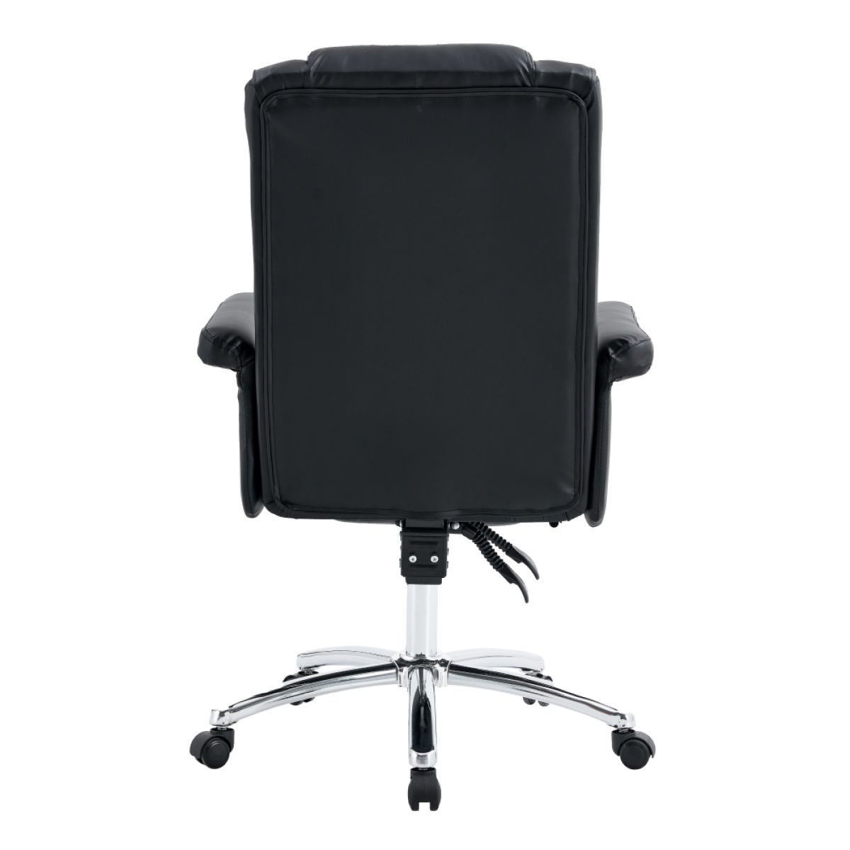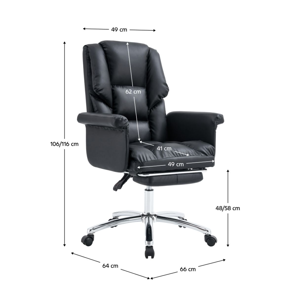 Material: piele ecologică / oţel Rezistenţa pielii ecologice conform testului Martindale: 100.000 de cicluri de frecare Culoare: neagră / crom Dimensiuni (LxAxÎ): 66x64x106-116 cm Înălţime scaun: 48-58 cm Adâncime scaun: 41 cm Lăţime scaun: 49 cm Înălţime spătar: 62 cm Lăţime spătar: 49 cm Capacitate de încărcare: 110 kg Suport extensibil pentru picioare Se roteşte 360° Reglarea înclinării spătarului 90° - 135° Contur ergonomic Înălţime reglabilă a scaunului Bază cromată cu cinci spiţe Rotile universale Potrivite atât pentru pardoseli dure, cât şi moi Mecanism de balansare Livrat dezasamblat