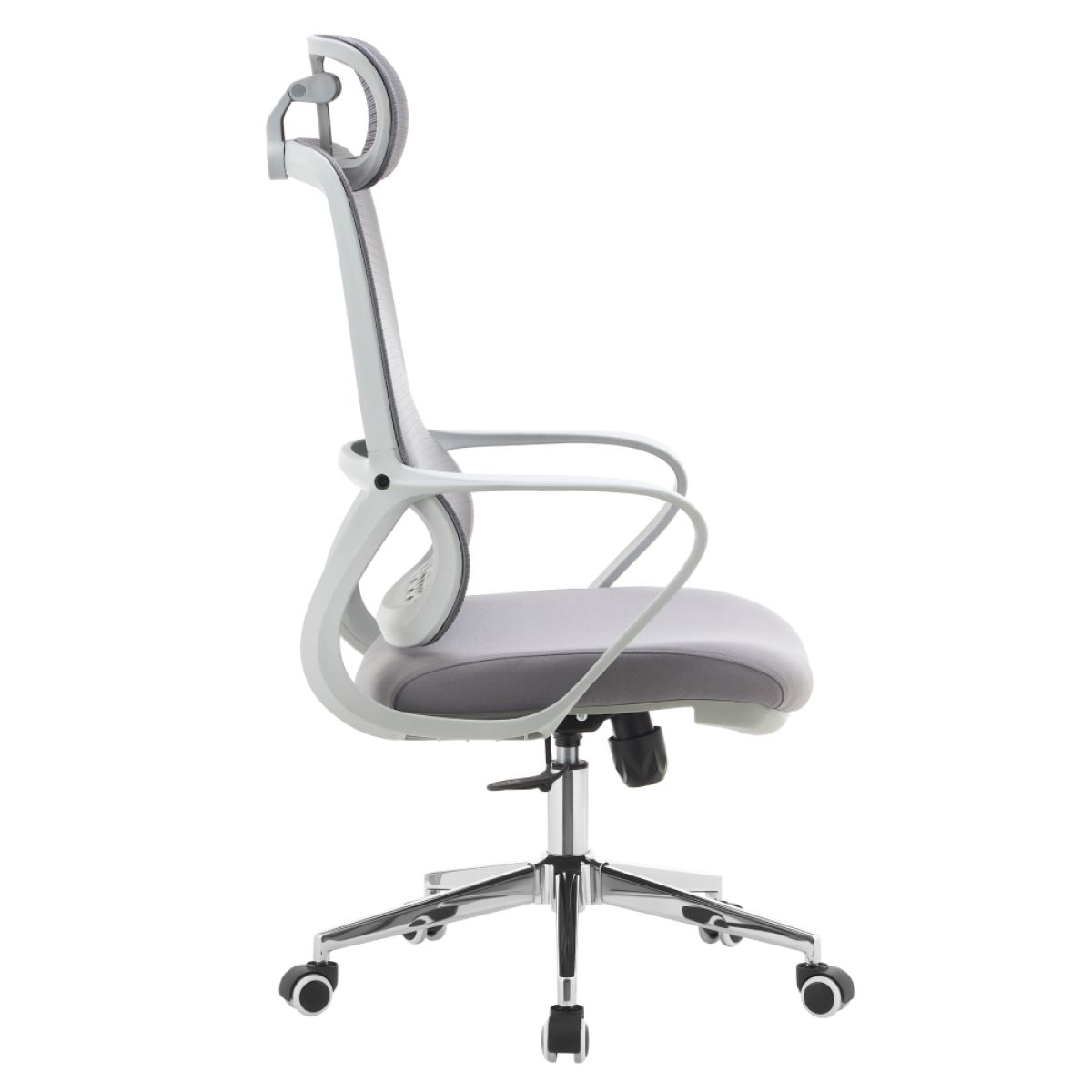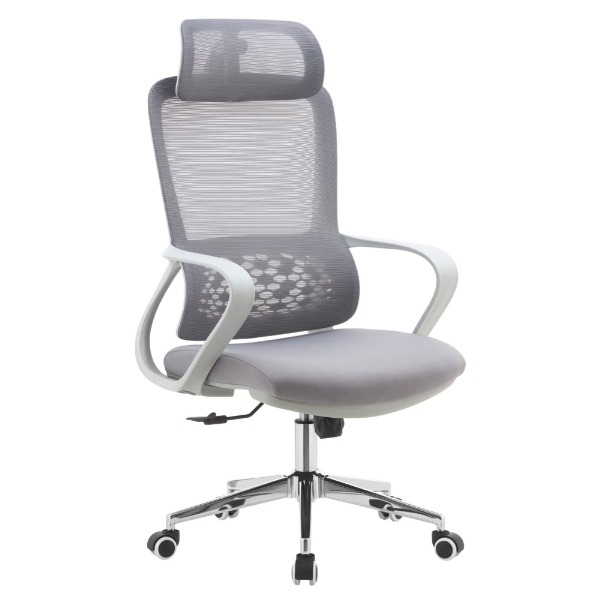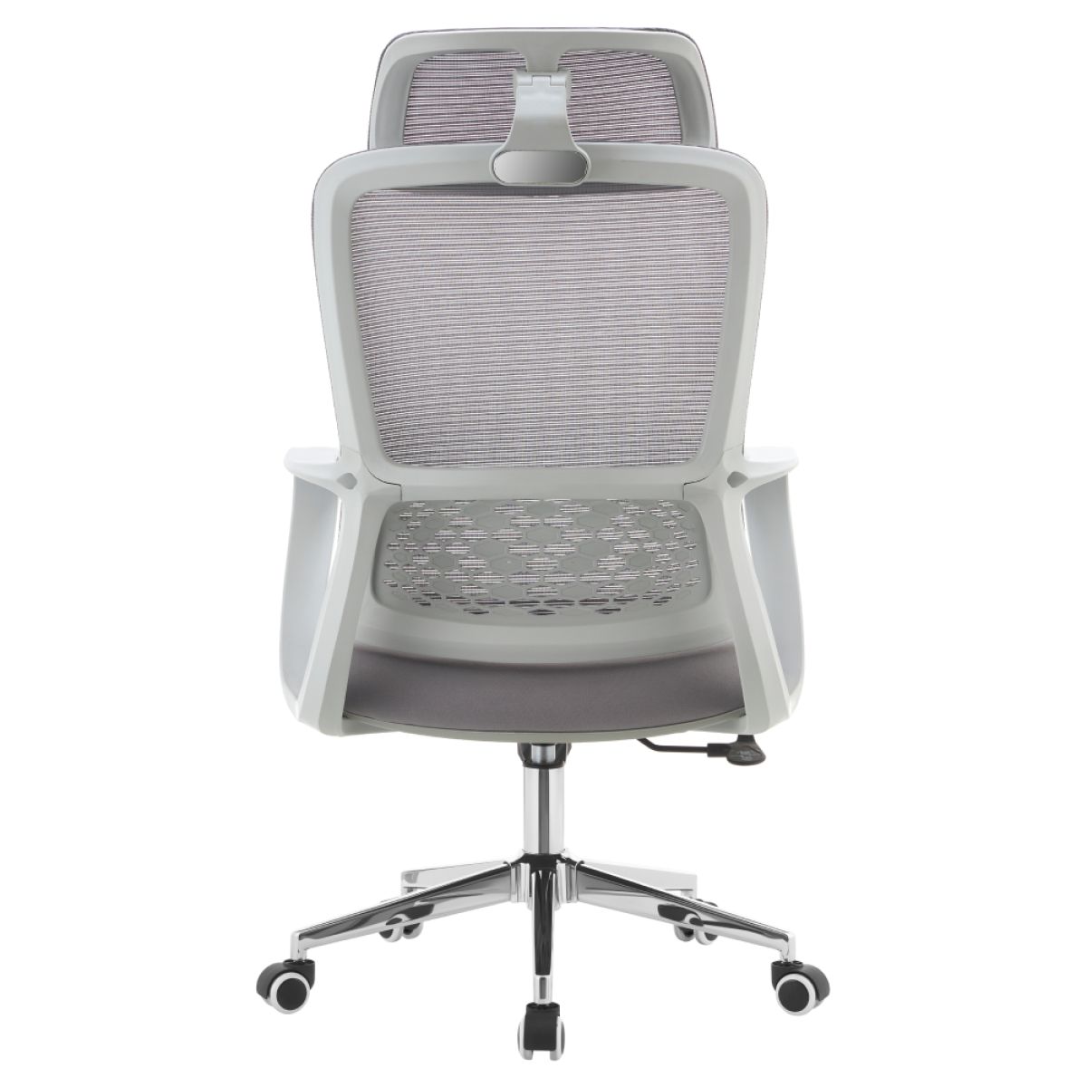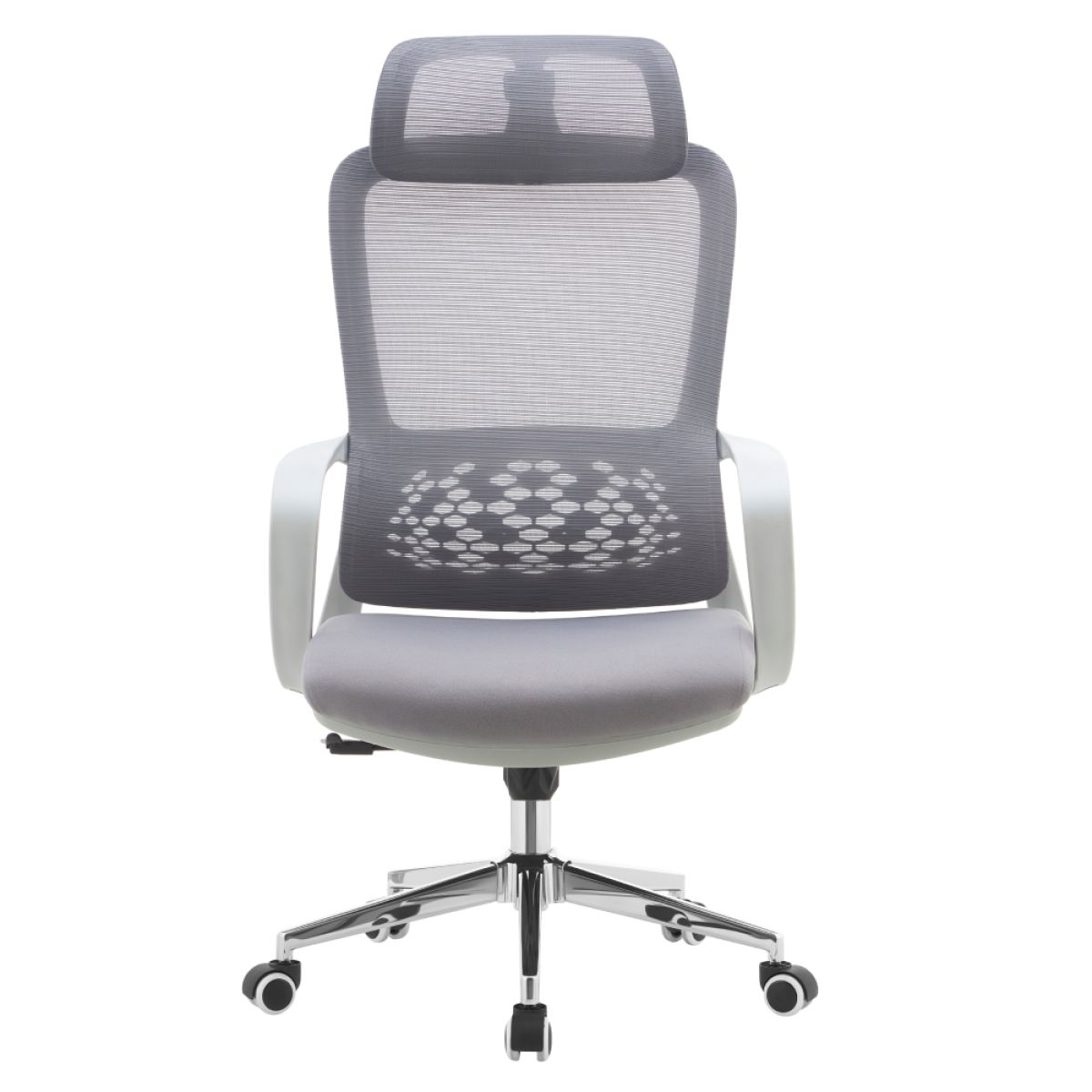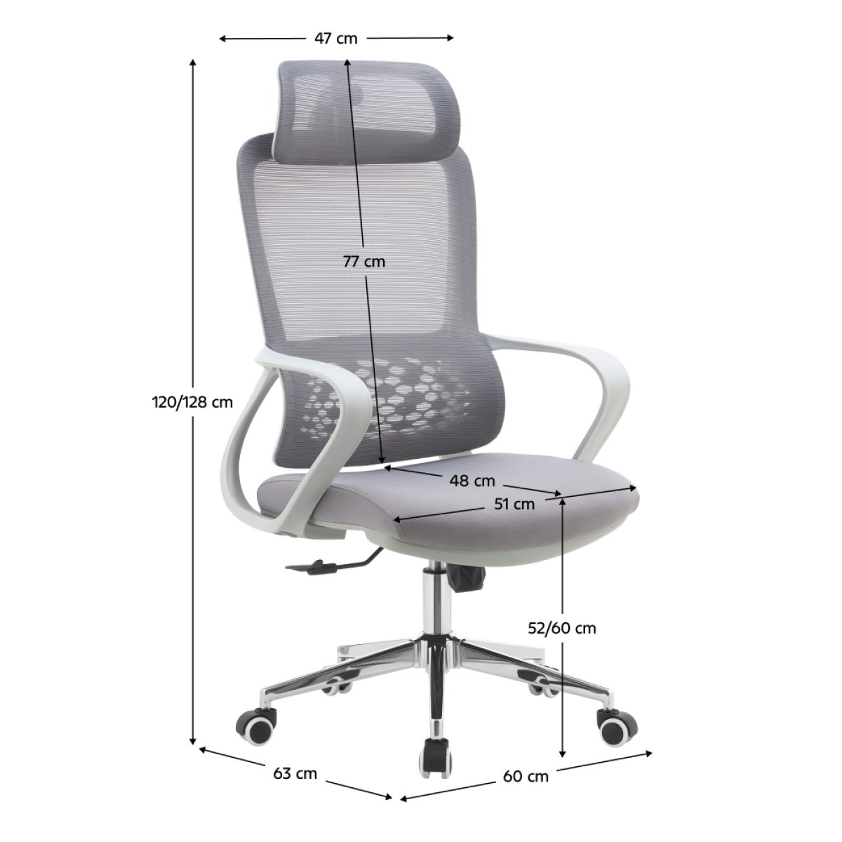 Material: plasă/plastic/metal Rezistenţa ţesăturii la frecare conform testului Martindale: 80 000 de cicluri de frecare Rezistenţa plasei la frecare conform testului Martindale: 90 000 de cicluri de frecare Culoare: gri/crom Dimensiuni (lxAxh): 60x63x120-128 cm Înălţime şezut: 52-60 cm Adâncimea părţii de şezut: 48 cm Lăţime părţii de şezut: 51 cm Lăţimea spătarului: 47 cm Înălţime spătar: 77 cm Portanţă: 110 kg Greutate: 10,9 kg Funcţie de balansare Înălţime reglabilă a scaunului Spătar lombar cu formă ergonomică Tetiera reglabilă Roţi universale Potrivit pentru podele moi şi dure Livrat dezasamblat