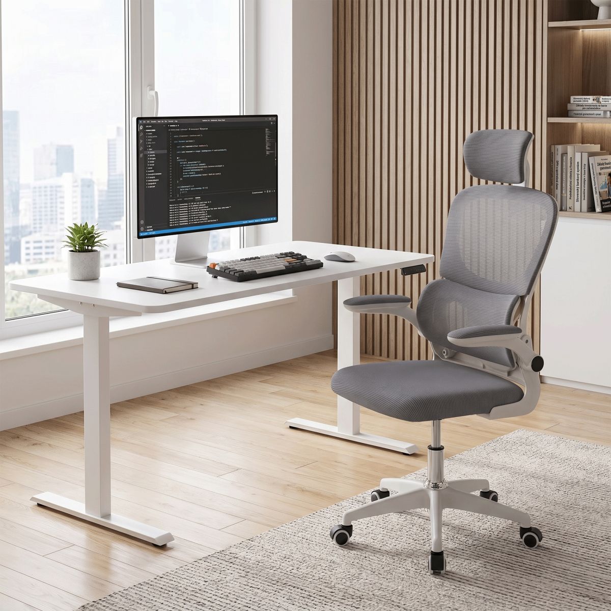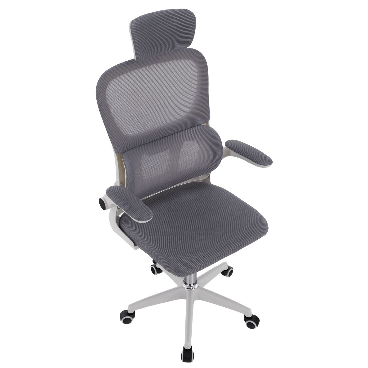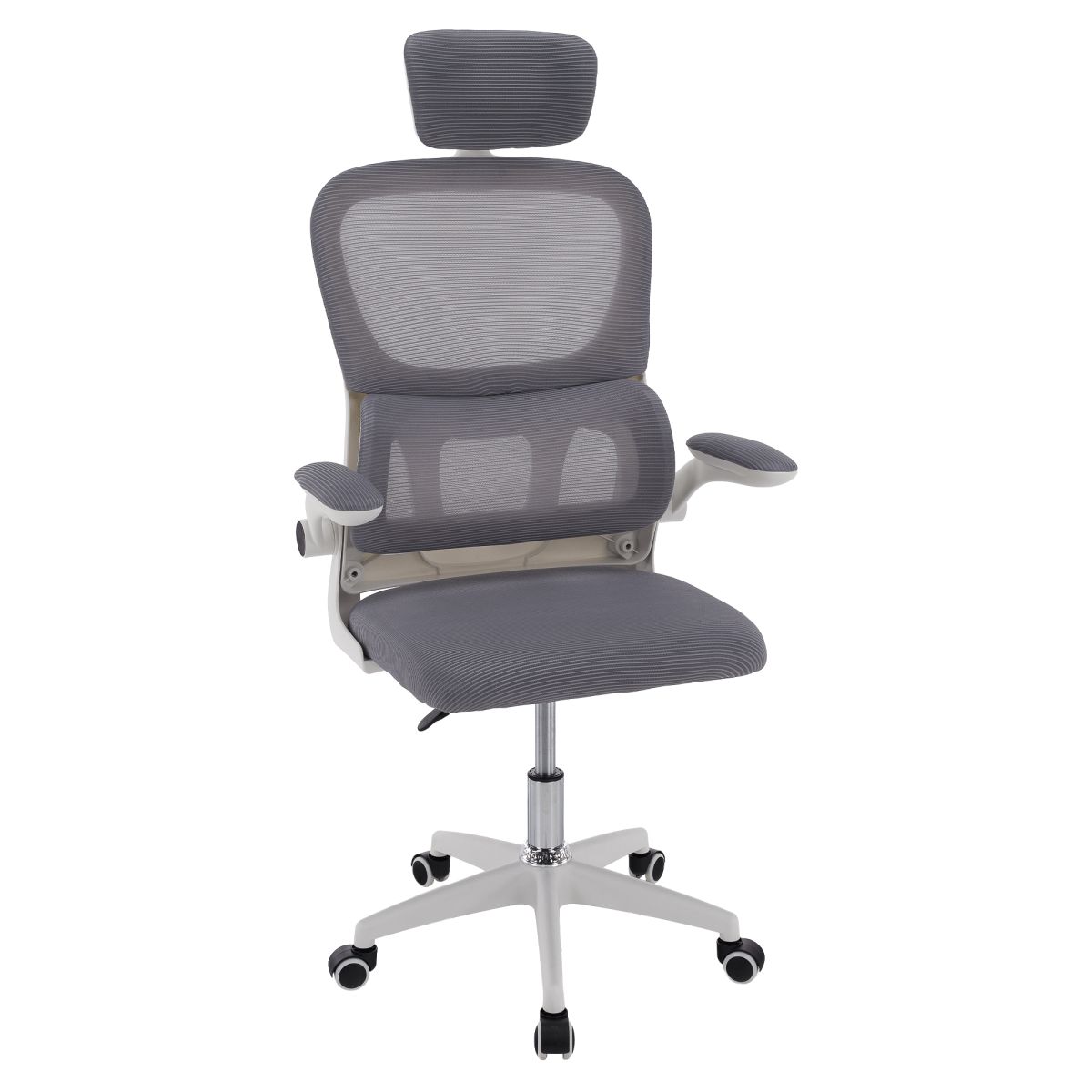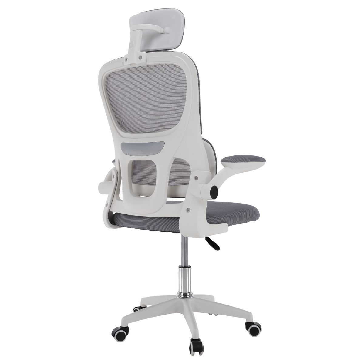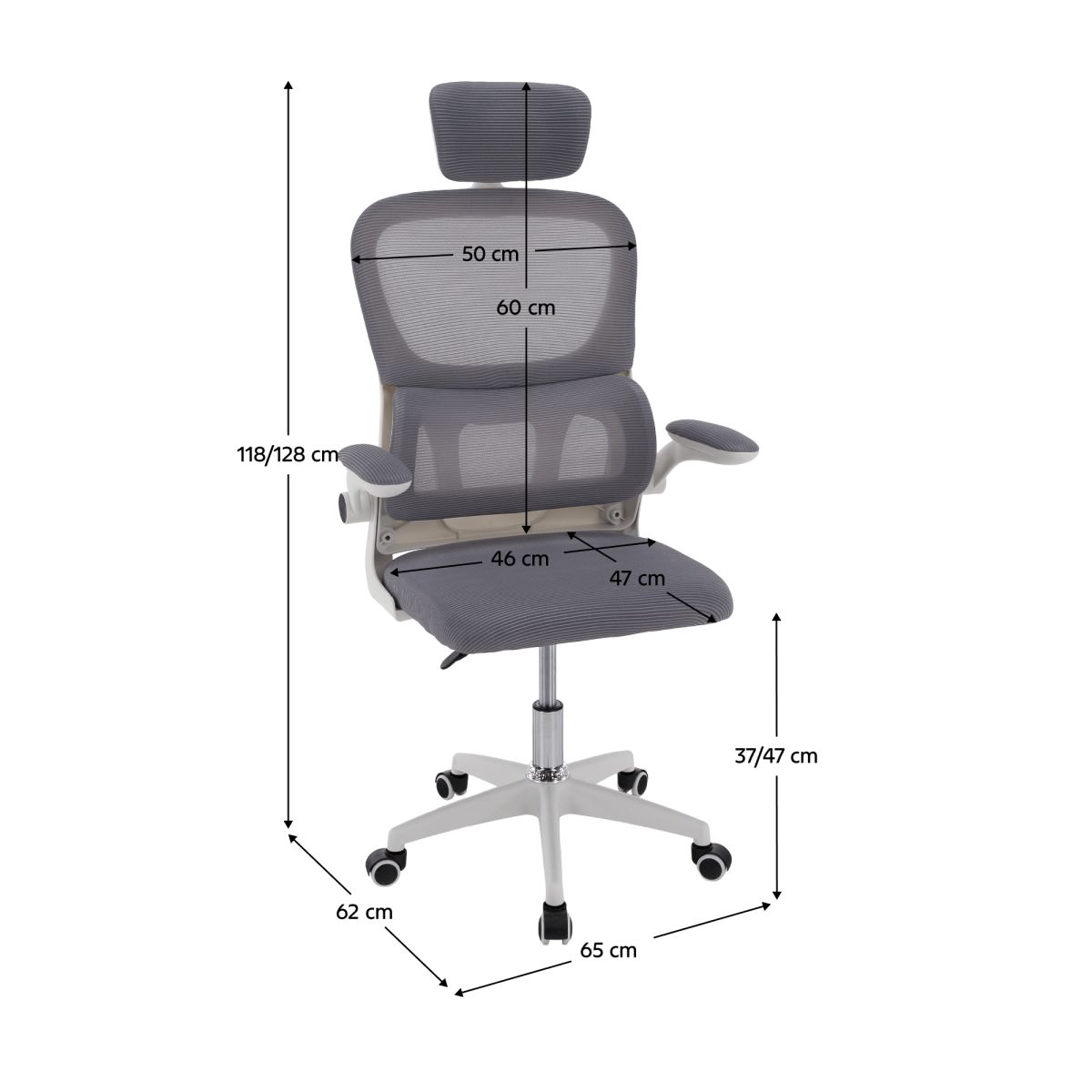 Material: plasă /plastic Rezistenţa ţesăturii la frecare conform testului Martindale: 90 000 de cicluri de frecare Culoare: gri/albă Dimensiuni (lxAxh): 65x62x118-128 cm, Înălţimea părţii de şezut: 37-47 cm Adâncimea părţii de şezut: 47 cm Lăţimea părţii de şezut: 46 cm Lăţime spătar: 50 cm Înălţime spătar: 60 cm Portanţă: 100 kg Rotaţie Funcţie de balansare Înălţime reglabilă a scaunului Înălţime reglabilă a tetierei Cu cotiere Cotiere rabatabile Bază cu cinci stele Roţi universale Potrivit pentru podele moi şi dure Livrat dezasamblat