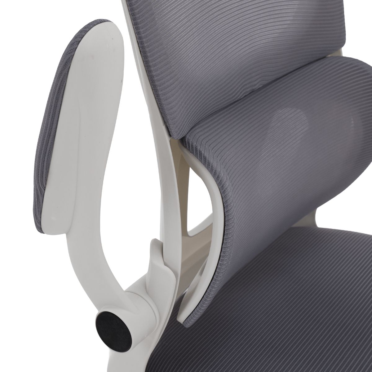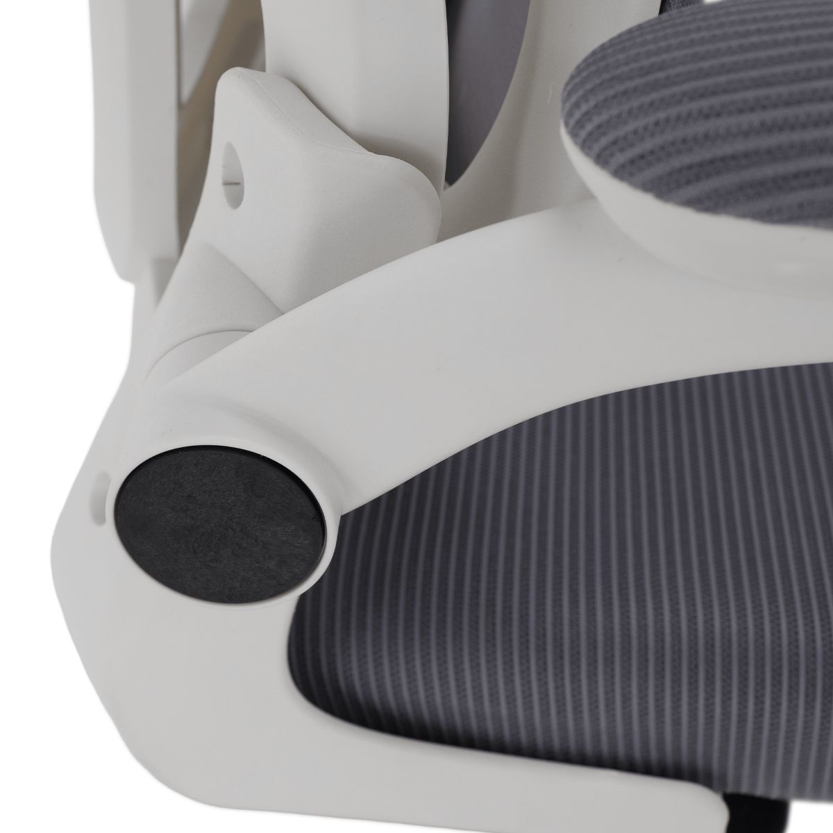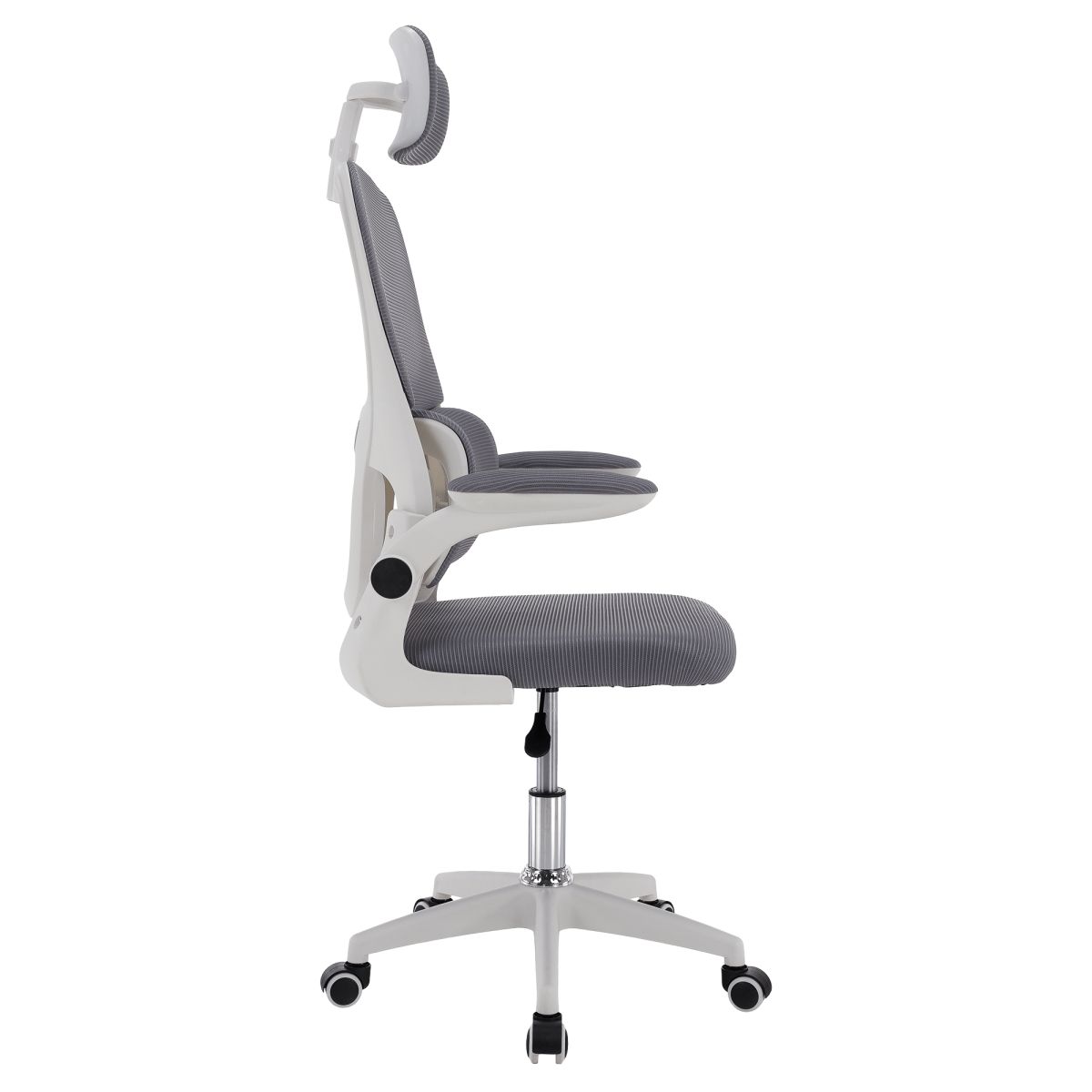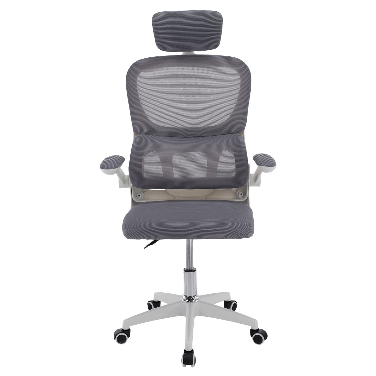 Material: plasă /plastic Rezistenţa ţesăturii la frecare conform testului Martindale: 90 000 de cicluri de frecare Culoare: gri/albă Dimensiuni (lxAxh): 65x62x118-128 cm, Înălţimea părţii de şezut: 37-47 cm Adâncimea părţii de şezut: 47 cm Lăţimea părţii de şezut: 46 cm Lăţime spătar: 50 cm Înălţime spătar: 60 cm Portanţă: 100 kg Rotaţie Funcţie de balansare Înălţime reglabilă a scaunului Înălţime reglabilă a tetierei Cu cotiere Cotiere rabatabile Bază cu cinci stele Roţi universale Potrivit pentru podele moi şi dure Livrat dezasamblat