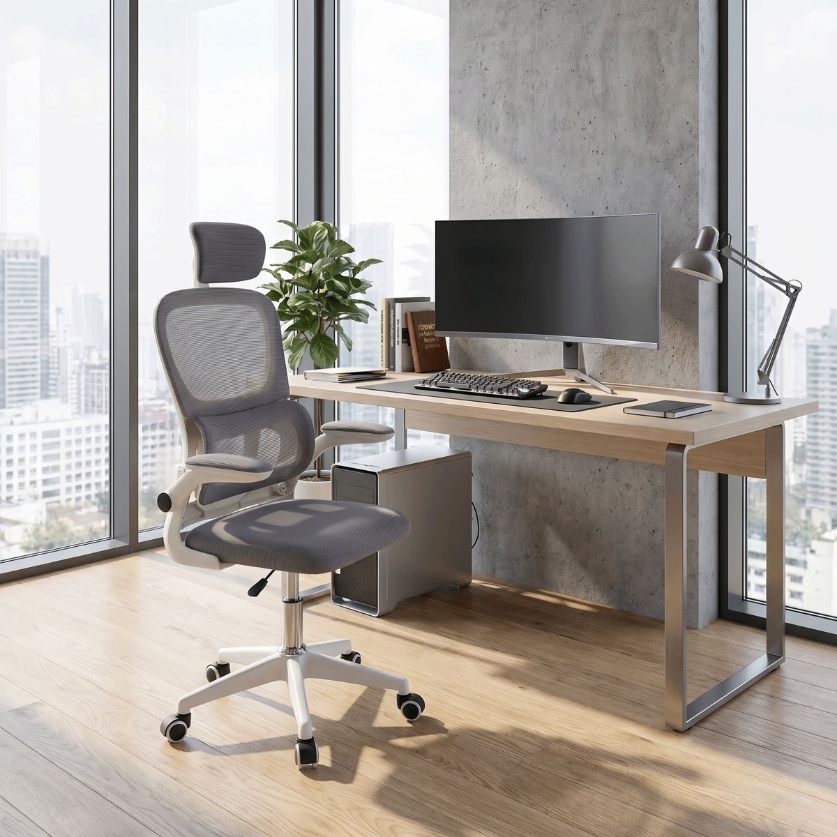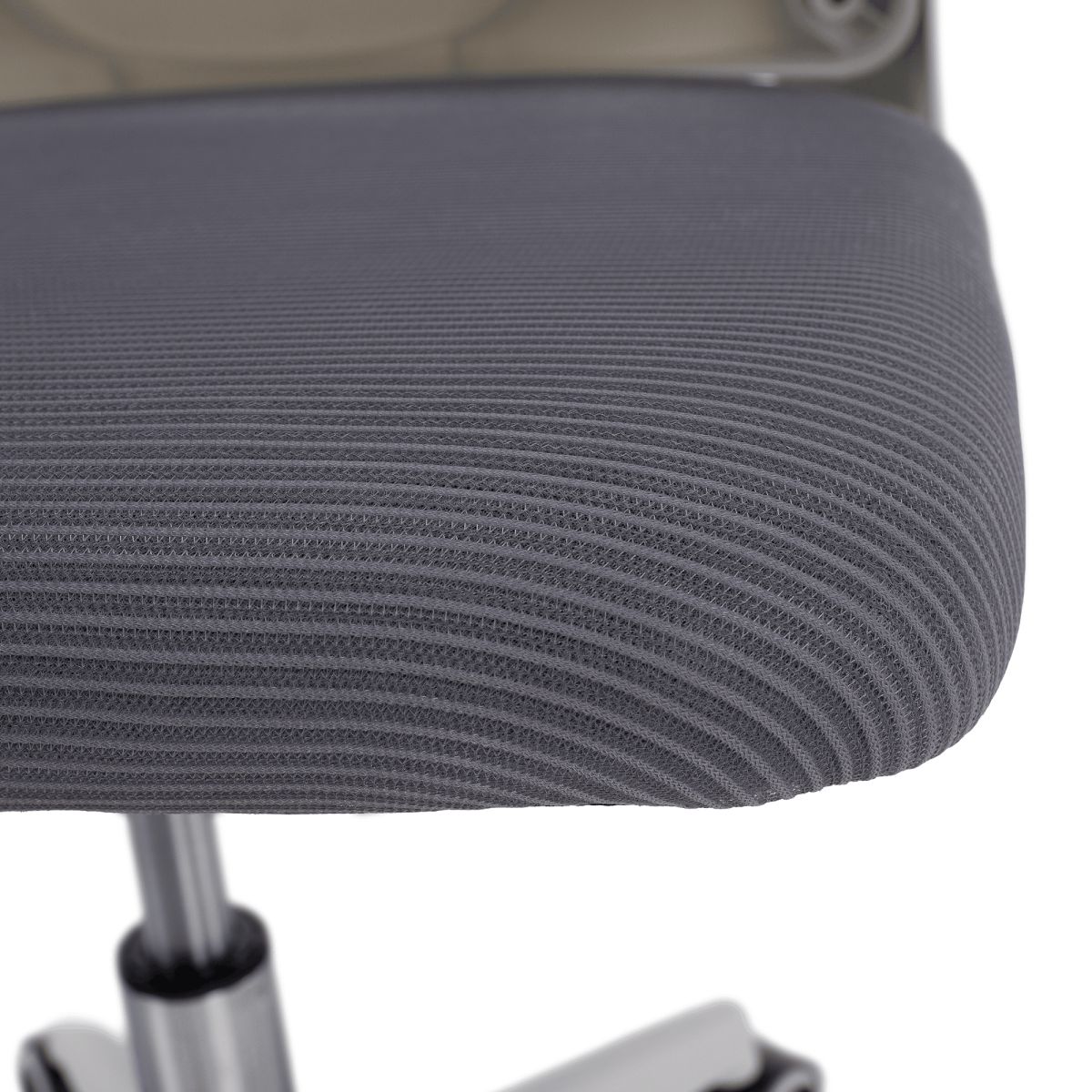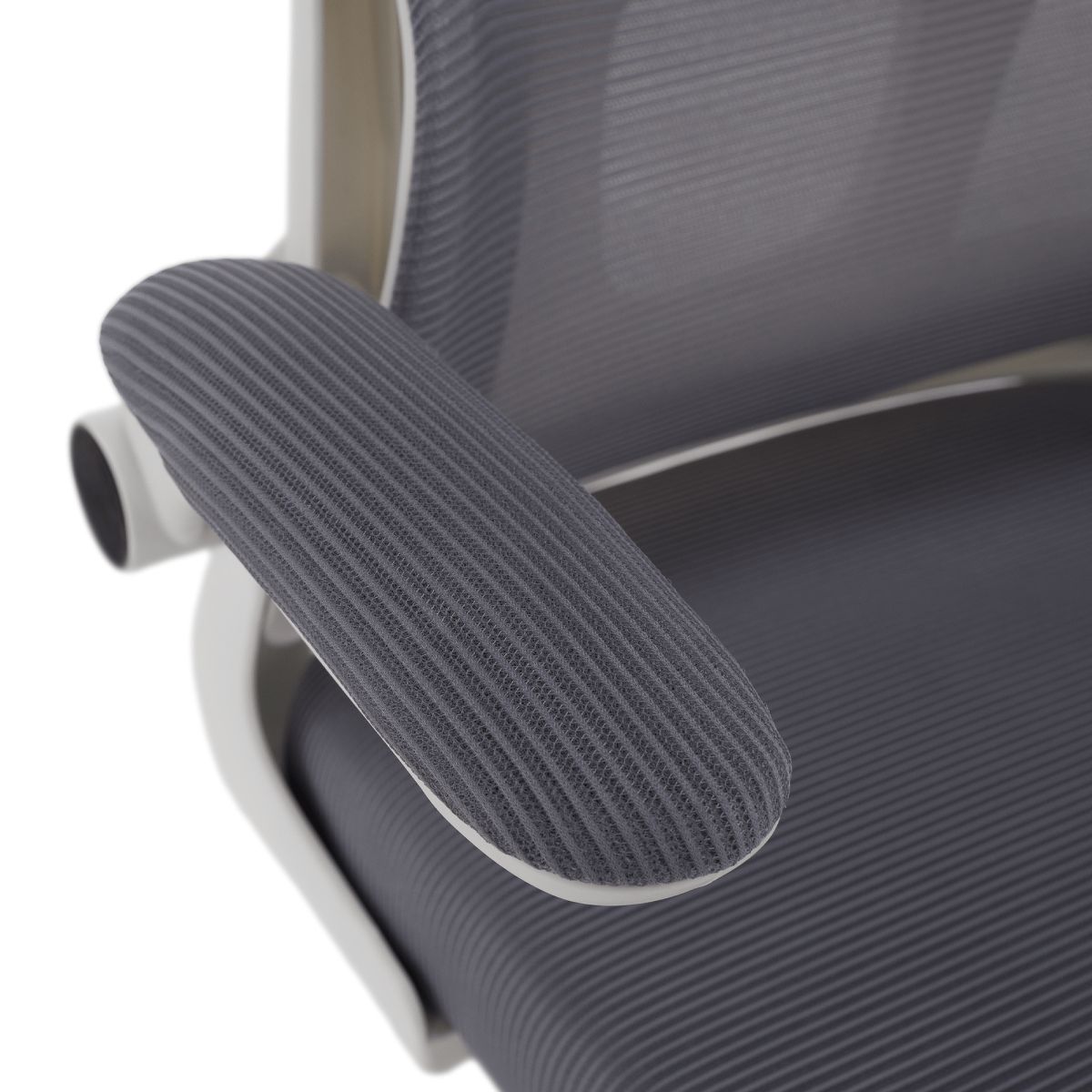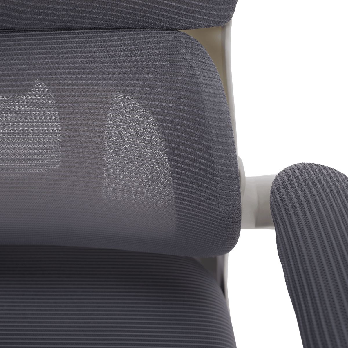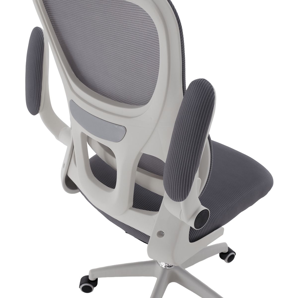 Material: plasă /plastic Rezistenţa ţesăturii la frecare conform testului Martindale: 90 000 de cicluri de frecare Culoare: gri/albă Dimensiuni (lxAxh): 65x62x118-128 cm, Înălţimea părţii de şezut: 37-47 cm Adâncimea părţii de şezut: 47 cm Lăţimea părţii de şezut: 46 cm Lăţime spătar: 50 cm Înălţime spătar: 60 cm Portanţă: 100 kg Rotaţie Funcţie de balansare Înălţime reglabilă a scaunului Înălţime reglabilă a tetierei Cu cotiere Cotiere rabatabile Bază cu cinci stele Roţi universale Potrivit pentru podele moi şi dure Livrat dezasamblat