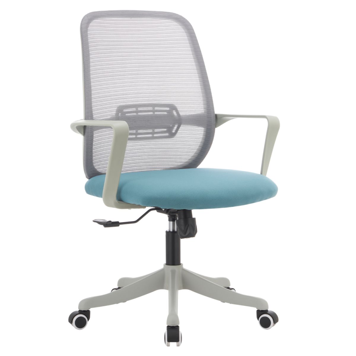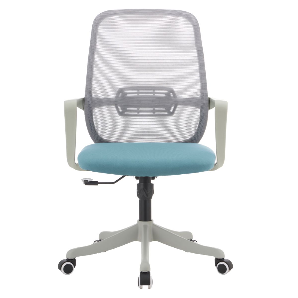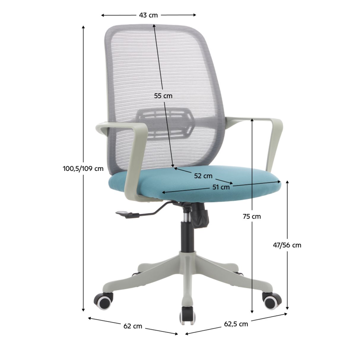 Material: plasă/ţesătură/plastic/ Culoare: gri/albastru Dimensiuni (lxAxh): 62,5x62x100,5-109 cm Înălţimea părţii de şezut: 47-56 cm Lăţimea părţii de şezut: 51 cm Adâncimea părţii de şezut: 52 cm Înălţime spătar: 55 cm Lăţime spătar: 43 cm Portanţă: 100 kg Greutate: 8,75 kg Înălţime reglabilă a scaunului Cotiere tapiţate Mecanism pivotant de balansare Roţi universale Potrivit atât pentru podele dure, cât şi moi Bază cu cinci braţe Detaliu albastru pe spate Livrat demontat