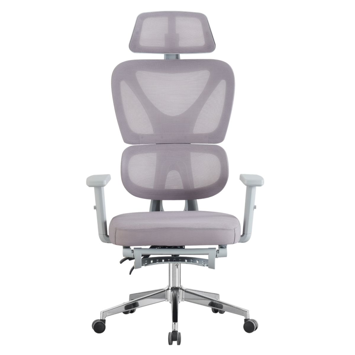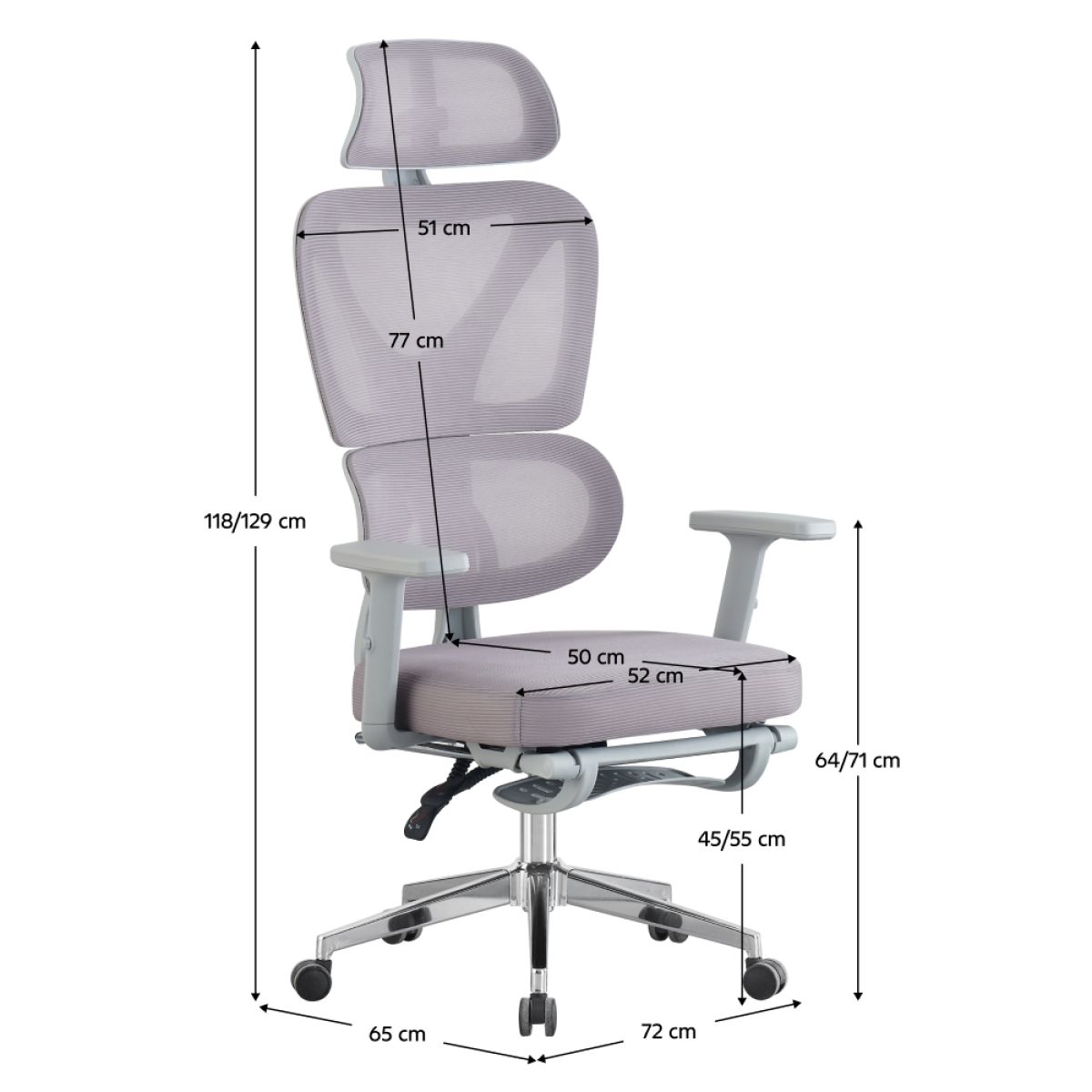 Material: plasă/plastic/metal Rezistenţa ţesăturii la frecare conform testului Martindale: 90 000 de cicluri de frecare Culoare: gri/crom Dimensiuni (lxAxh): 72x65x118-129 cm Înălţimea părţii de şezut: 45-55 cm Adâncimea părţii de şezut: 50 cm Lăţimea părţii de şezut: 52 cm Lăţime spătar: 51 cm Înălţime spătar: 77 cm Portanţa: 130 kg Greutate: 14,1 kg Funcţie de balansare Înălţime reglabilă a părţii de şezut Suport telescopic extensibil pentru picioare Înălţimea cotierei reglabilă Suport lombar cu formă anatomică Tetieră ajustabilă Roţi universale Potrivit atât pentru pardoseli moi, cât şi pentru pardoseli dure Livrată dezasamblată