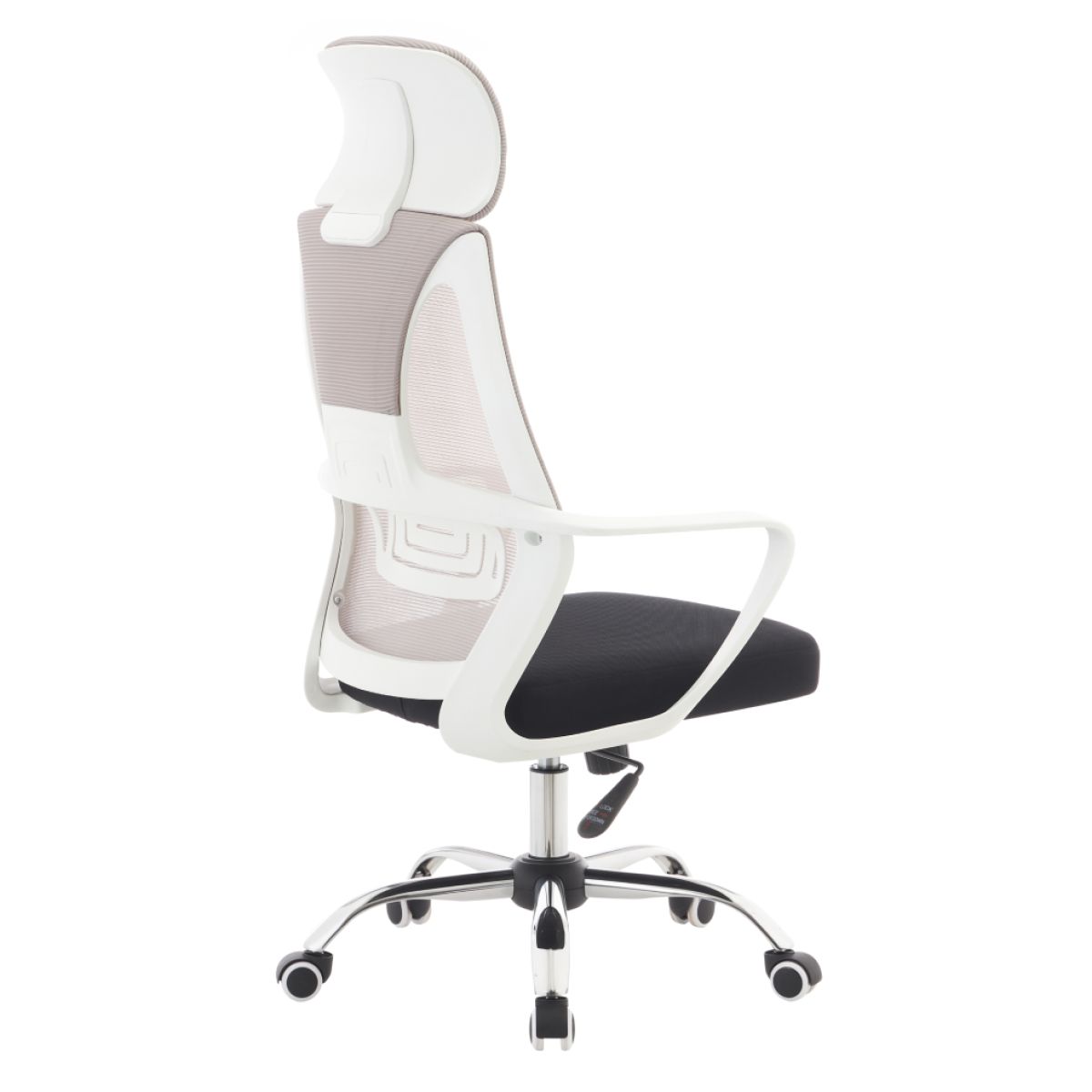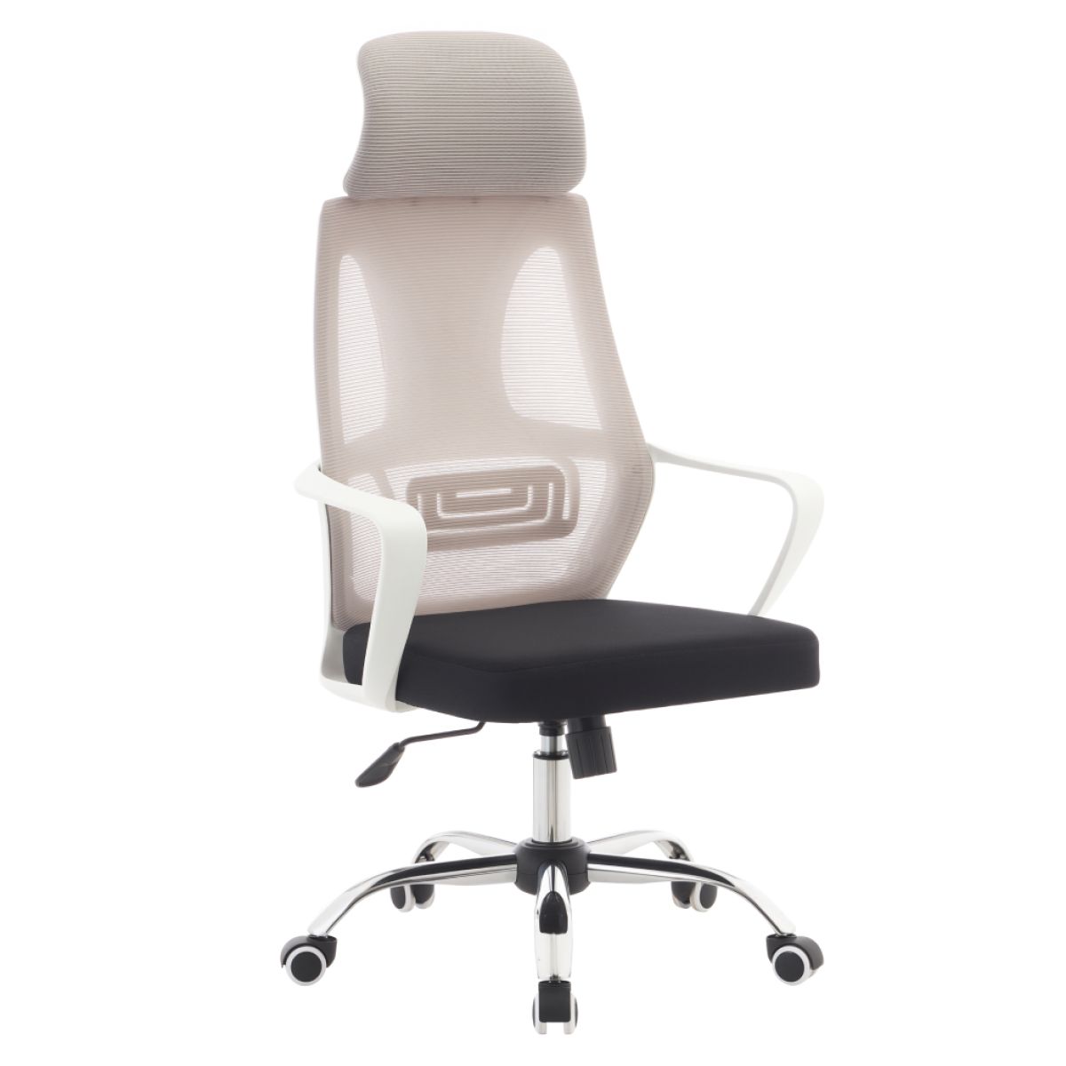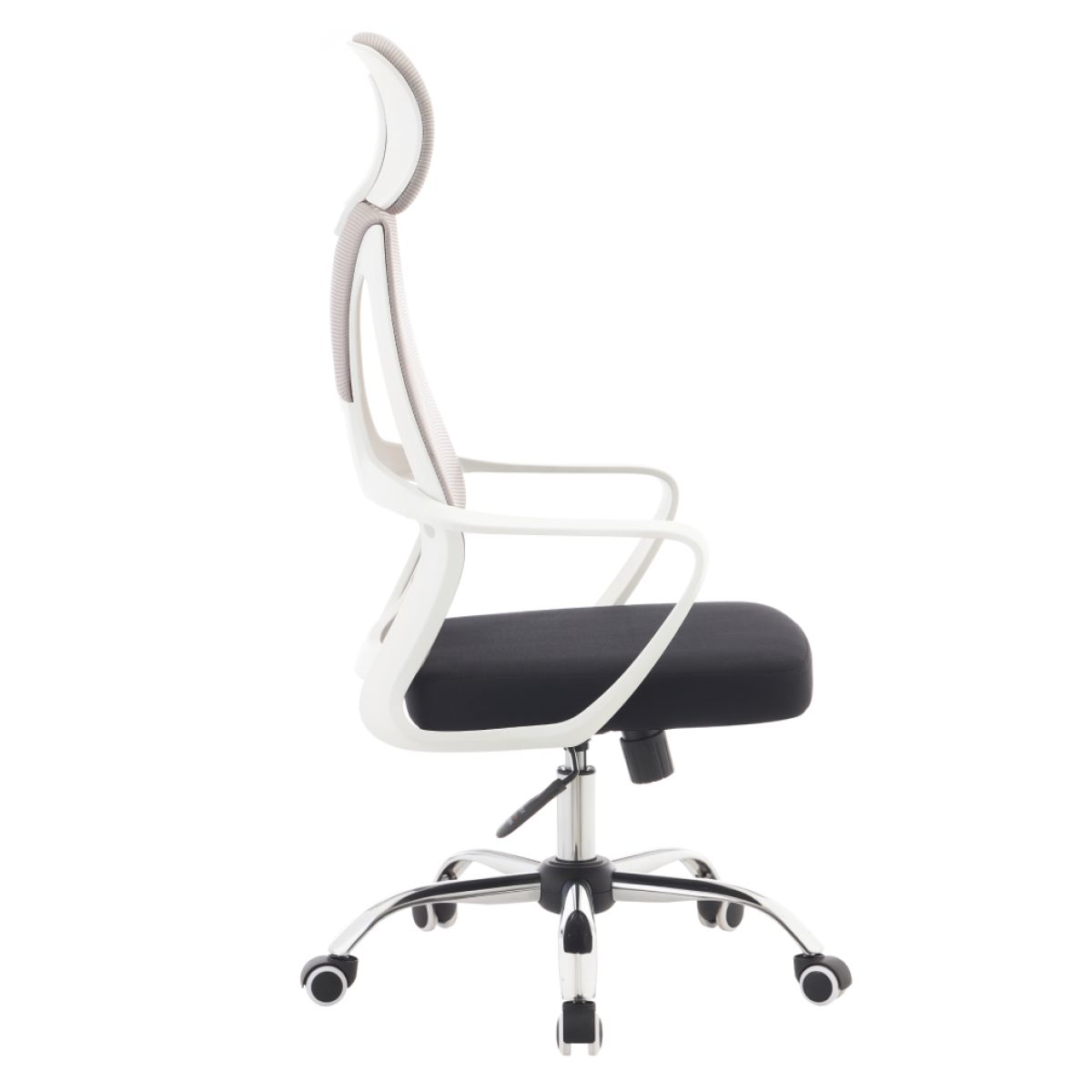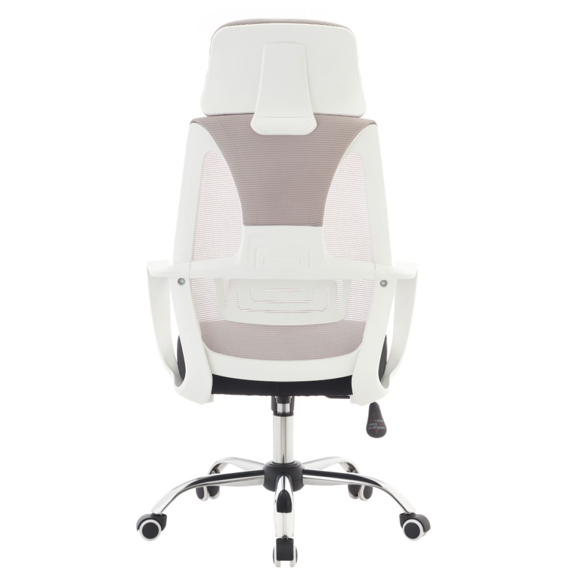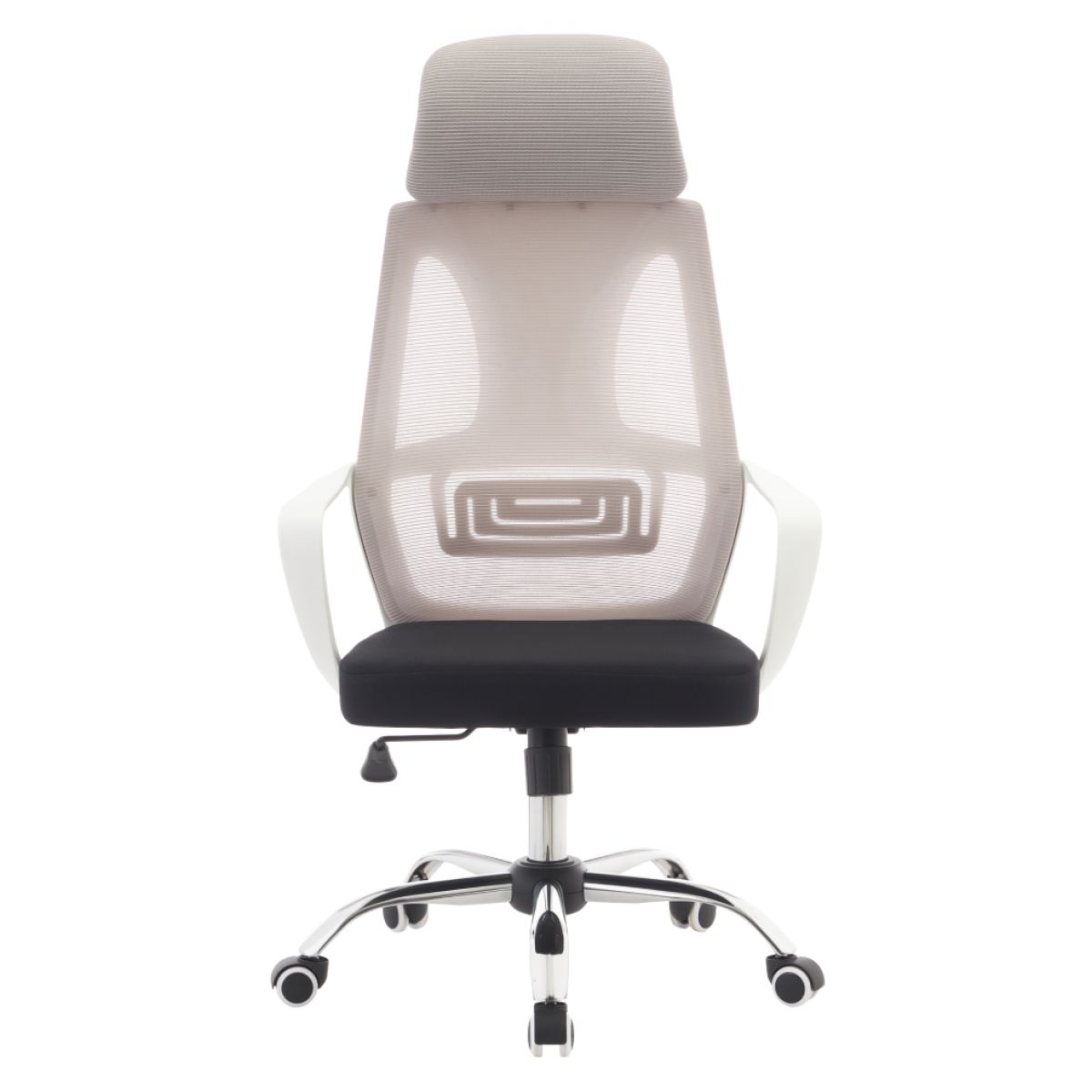 Material: plasă/ţesătură/plastic/metal Rezistenţa plasă: 90 000 Martindale Rezistenţa ţesătură: 80 000 Martindale Culoare: gri/negru/alb Dimensiuni (lxAxh):64x59x116-126 cm Înălţimea reglabilă a şezutului:45-55 cm Adâncime şezut: 49 cm Lăţime şezut: 49 cm Înălţime spătar: 74 cm Lăţime spătar: 49 cm Greutate susţinută 110 kg Cu tetieră Cu mânere Mecanism de balansare Baza stea de crom Roţi universale Potrivite pentru orice tip de podele Se livrează demontat