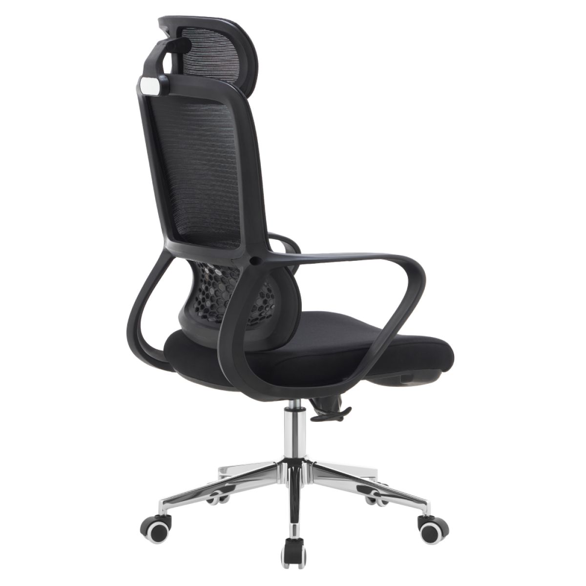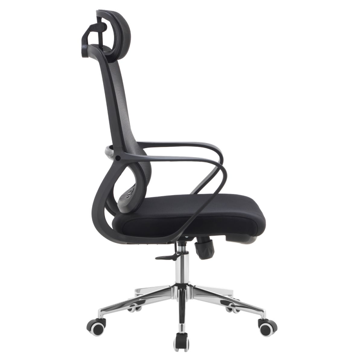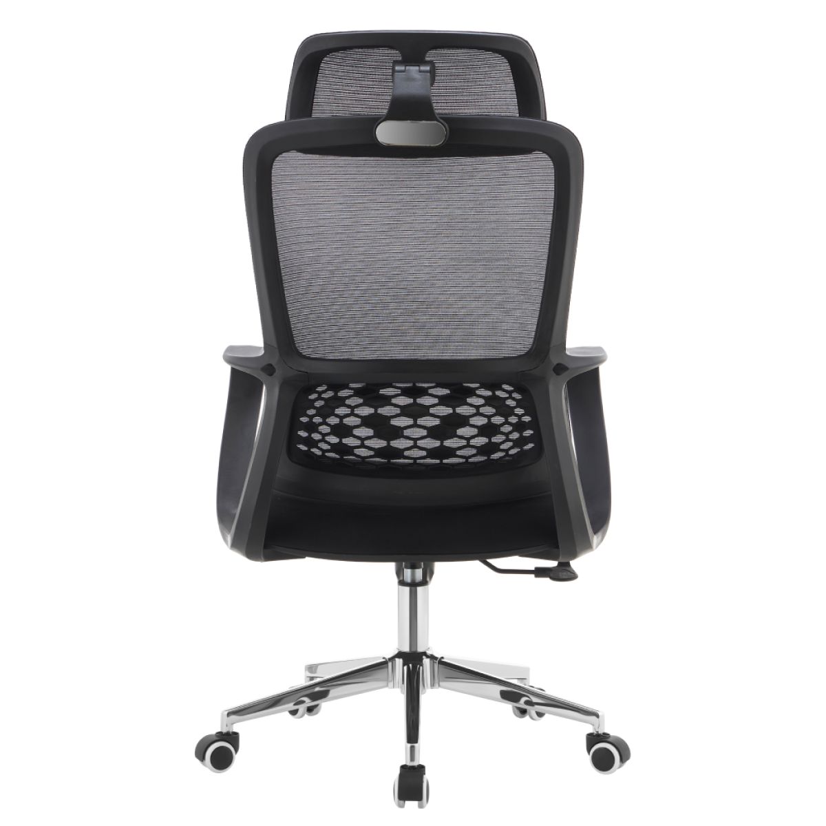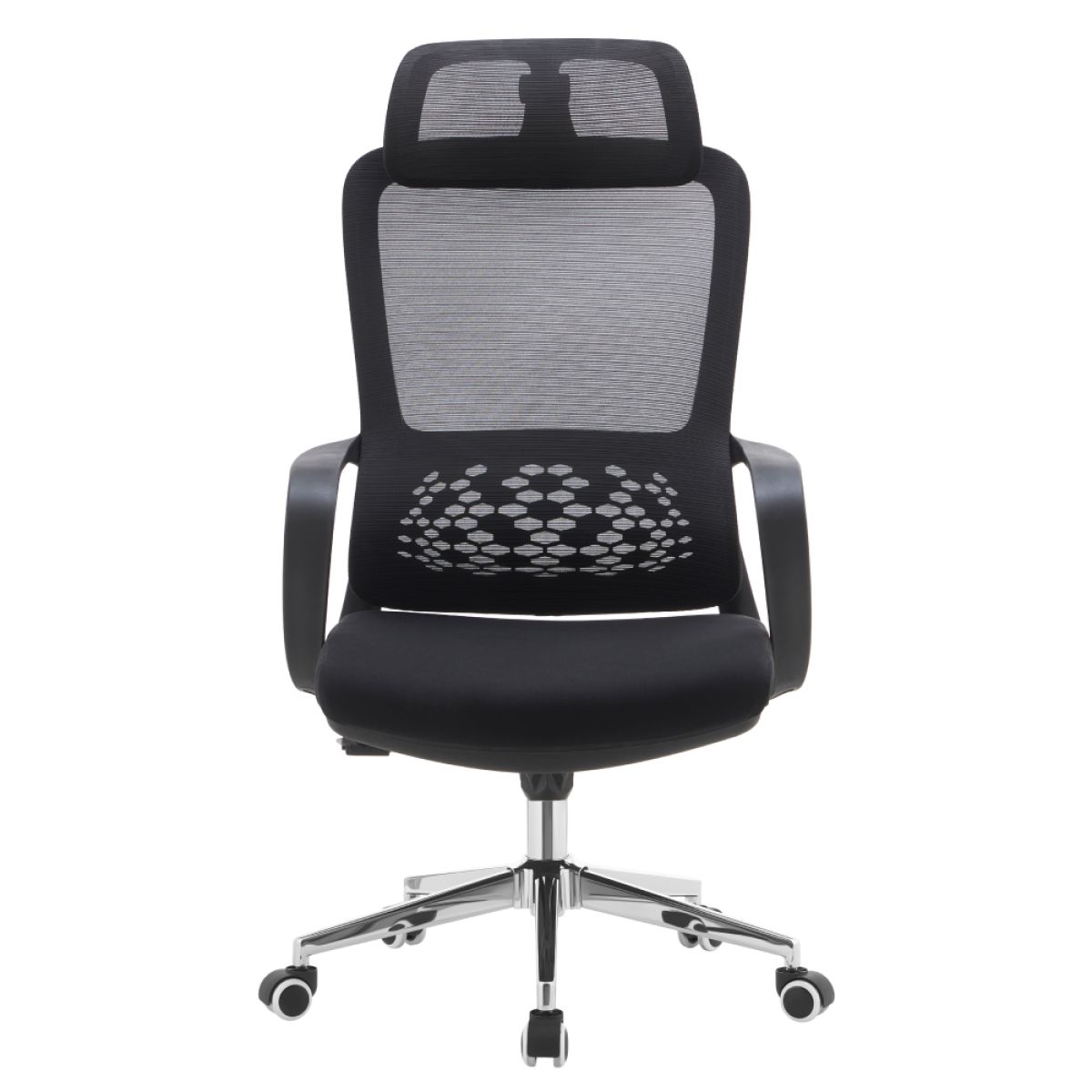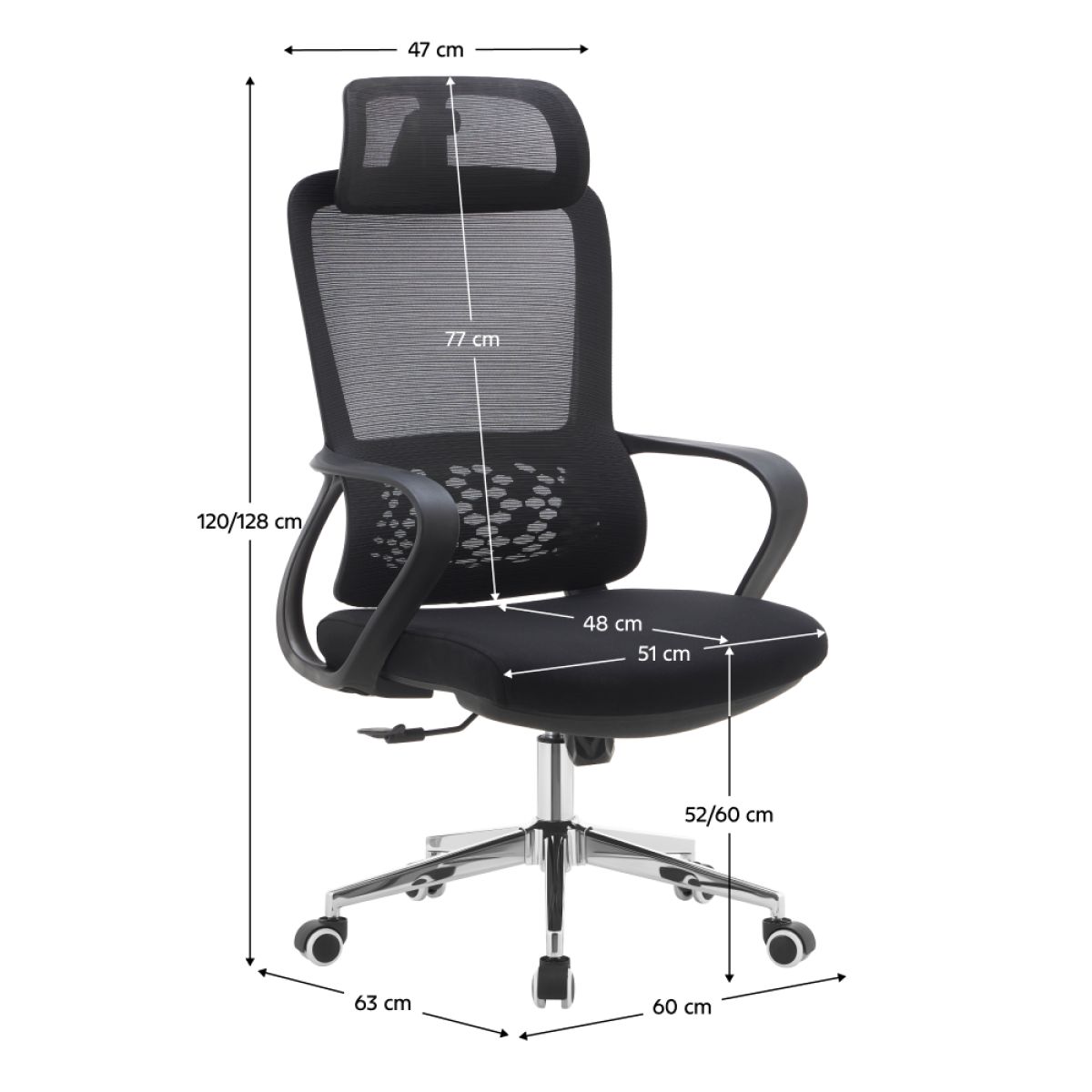 Material: plasă/plastic/metal Rezistenţa ţesăturii la frecare conform testului Martindale: 80 000 de cicluri de frecare Rezistenţa plasei la frecare conform testului Martindale: 90 000 de cicluri de frecare Culoare: neagră/crom Dimensiuni (lxAxh): 60x63x120-128 cm Înălţime şezut: 52-60 cm Adâncimea părţii de şezut: 48 cm Lăţime părţii de şezut: 51 cm Lăţimea spătarului: 47 cm Înălţime spătar: 77 cm Portanţă: 110 kg Greutate: 10,9 kg Funcţie de balansare Înălţime reglabilă a scaunului Spătar lombar cu formă ergonomică Tetiera reglabilă Roţi universale Potrivit pentru podele moi şi dure Livrat dezasamblat