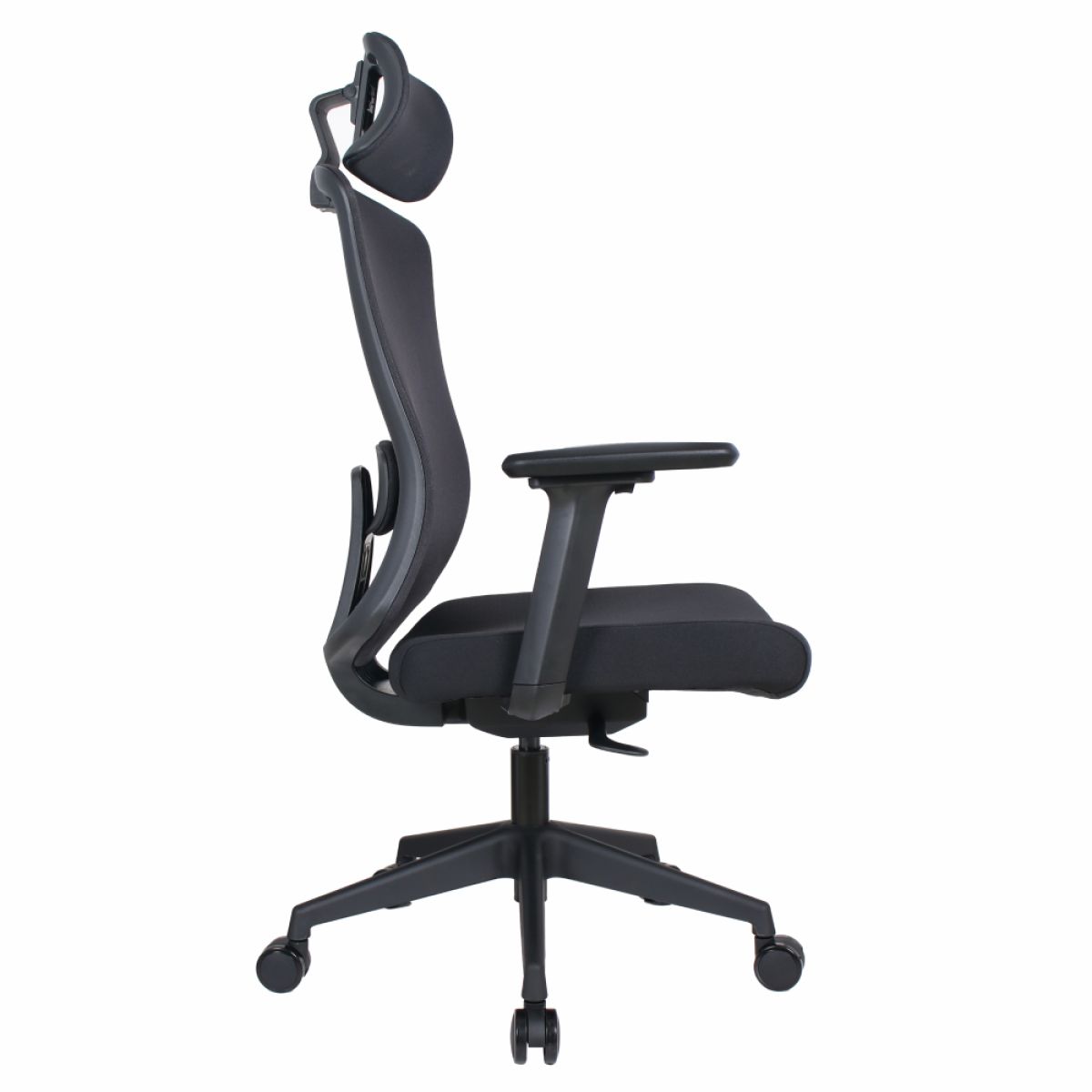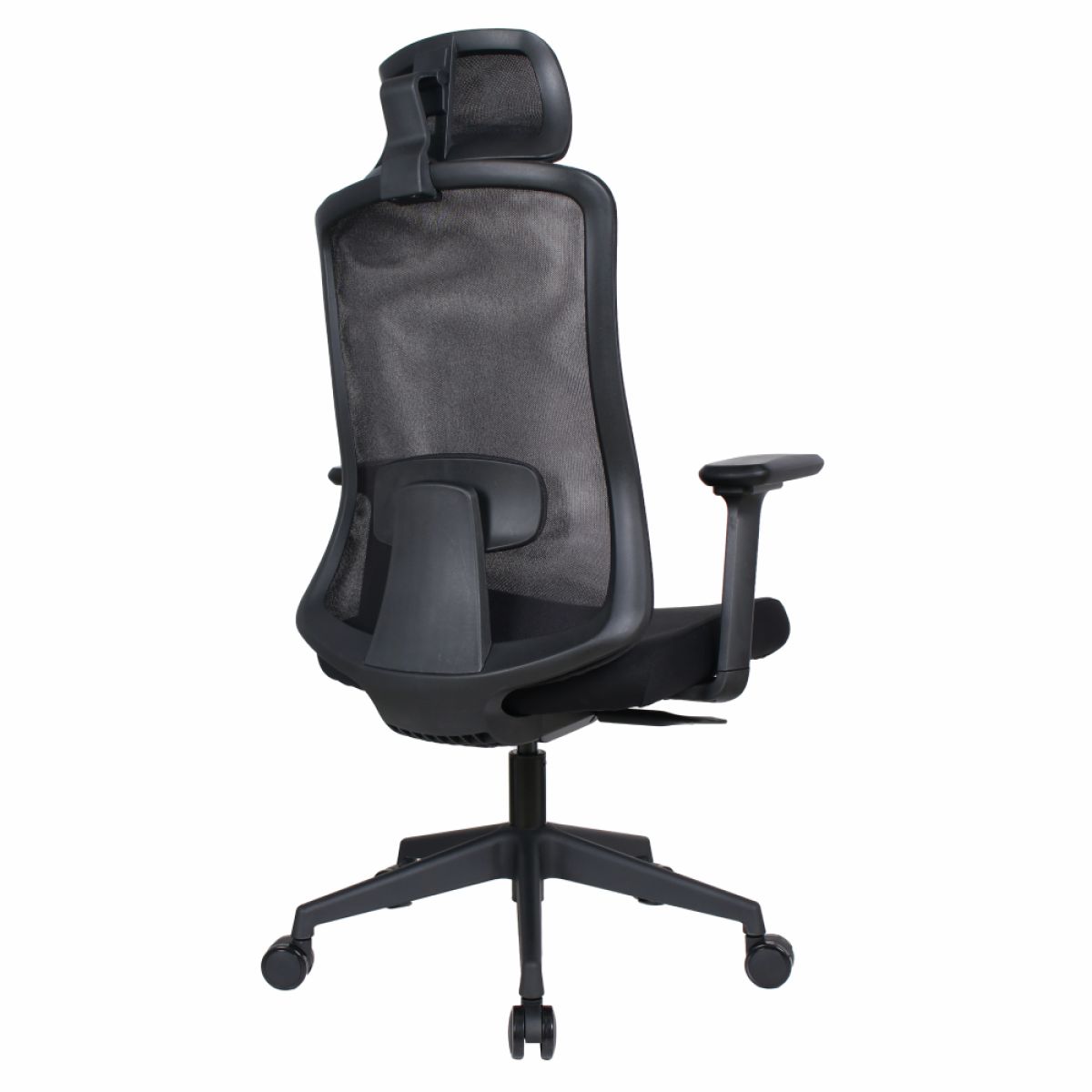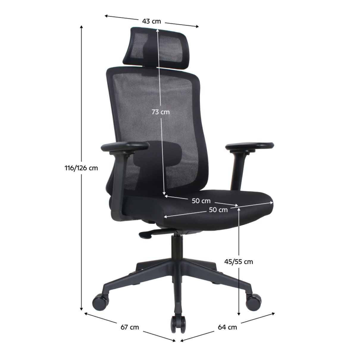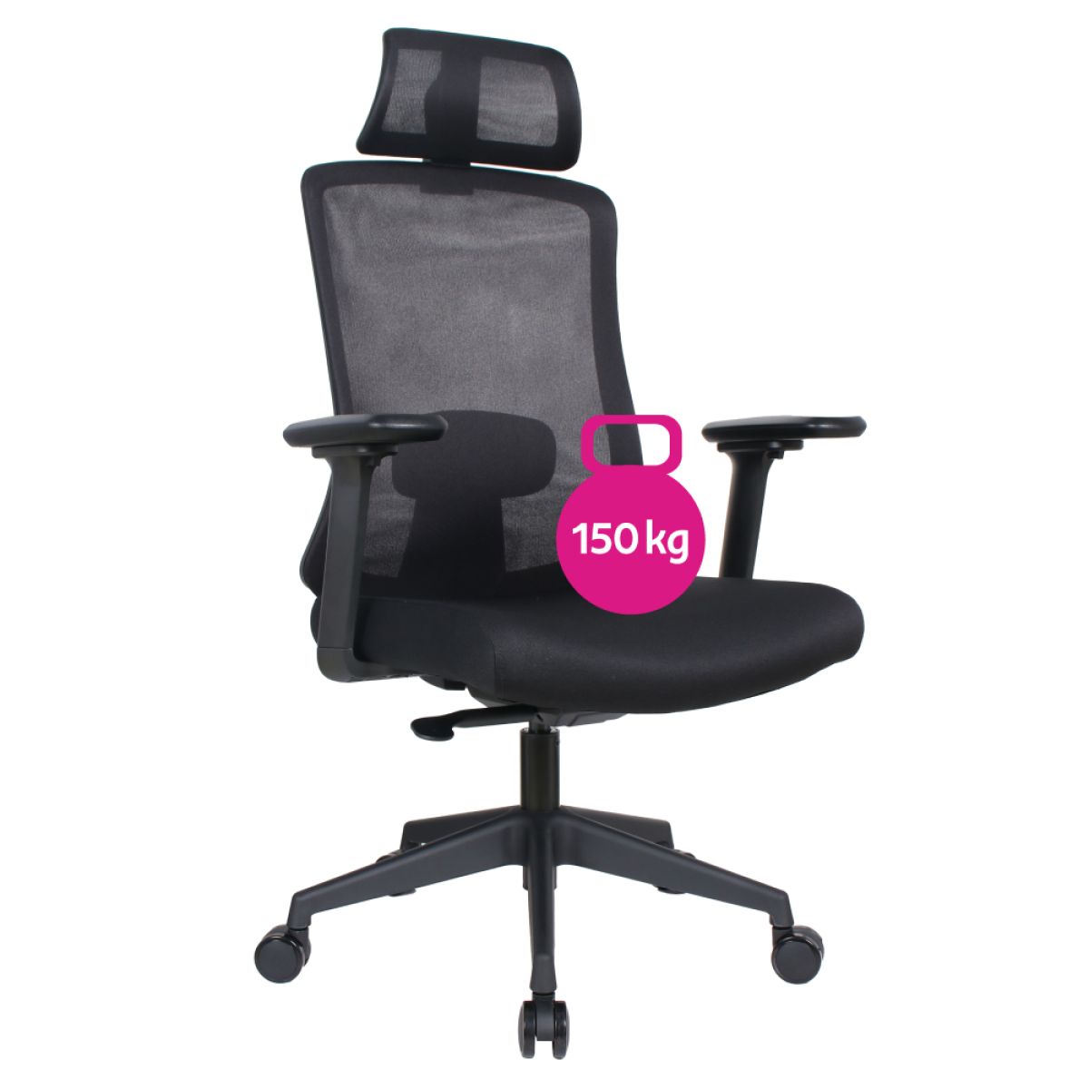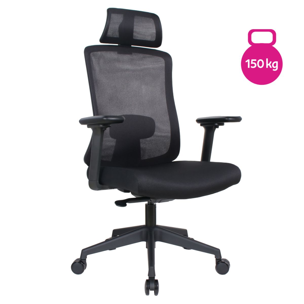 Material: plasă /plastic Rezistenţa ţesăturii la frecare conform testului Martindale: 90 000 de cicluri de frecare Culoare: neagră Dimensiuni (lxAxh): 63x64x115-125 cm Înălţime părţii de şezut: 44-54 cm Adâncimea părţii de şezut: 49 cm Lăţimea părţii de şezut: 49 cm Lăţime spătar: 50 cm Înălţime spătar: 66 cm Portanţa: 150 kg Scaun pivotant Mecanism balansoar Tetieră reglabilă Înălţime reglabilă a părţii de şezut Cu cotiere Cotierele pot fi reglate pe înălţime şi rotite la dreapta/stânga Suport lombar ergonomic Roţi universale Potrivit pentru podele moi şi dure Livrat dezasamblat