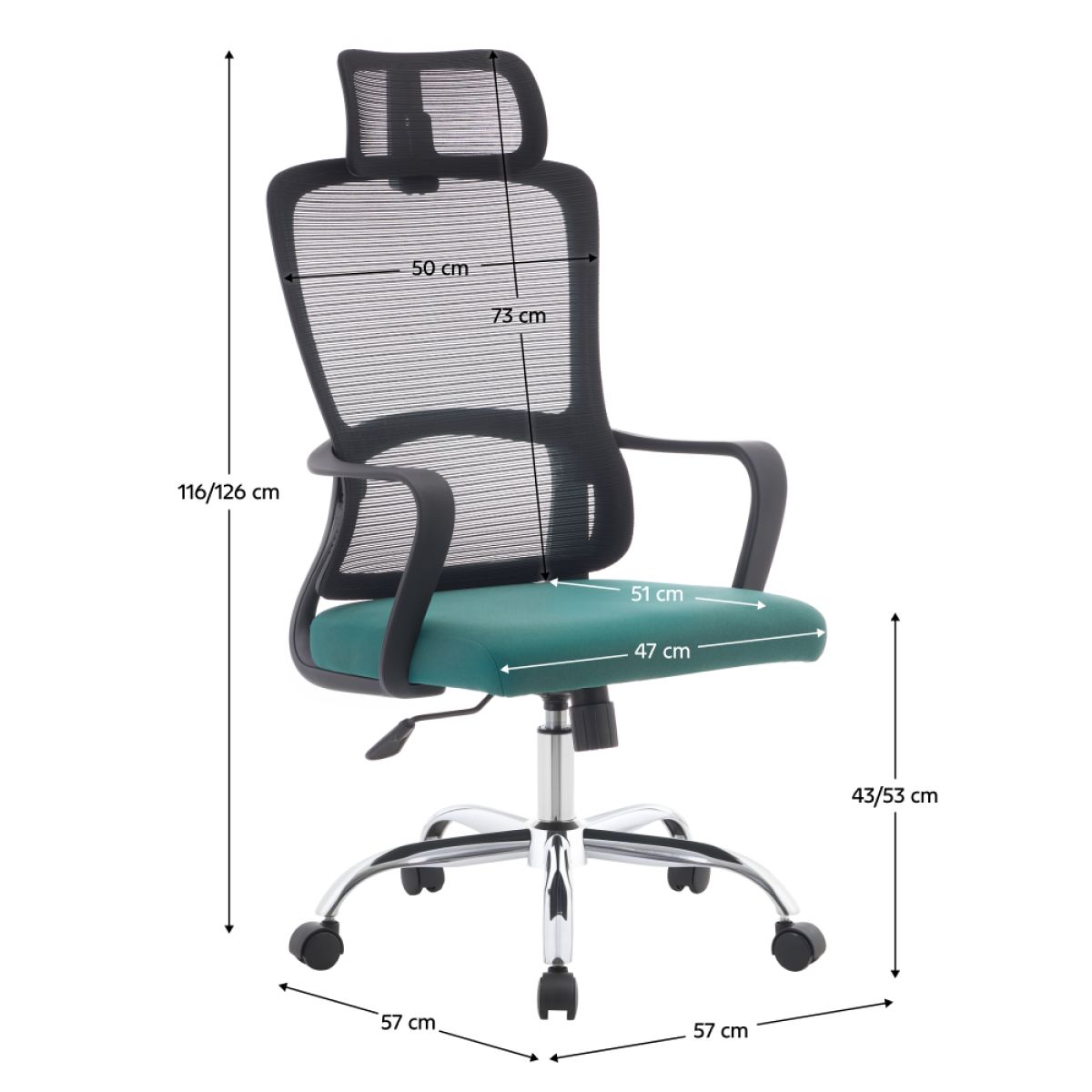 Material: plasă/ţesătură/plastic/metal Rezistenţa plasei conform testului Martindale: 90 000 de cicluri de frecare Rezistenţa ţesăturii la frecare conform testului Martindale: 80 000 de cicluri de frecare Culoare: negru/verde/crom Dimensiuni (lxAxh): 57x57x116-126 cm Înălţimea părţii de şezut: 43-53 cm Adâncimea părţii de şezut: 51 cm Lăţimea părţii de şezut: 47 cm Lăţime spătar: 50 cm Înălţime spătar: 73 cm Portanţă: 150 kg Scaun pivotant Mecanism de legănare Înălţime reglabilă a scaunului Cu cotiere Cu tetieră Roţi universale Potrivit atât pentru podele moi, cât şi pentru podele dure Livrat dezasamblat