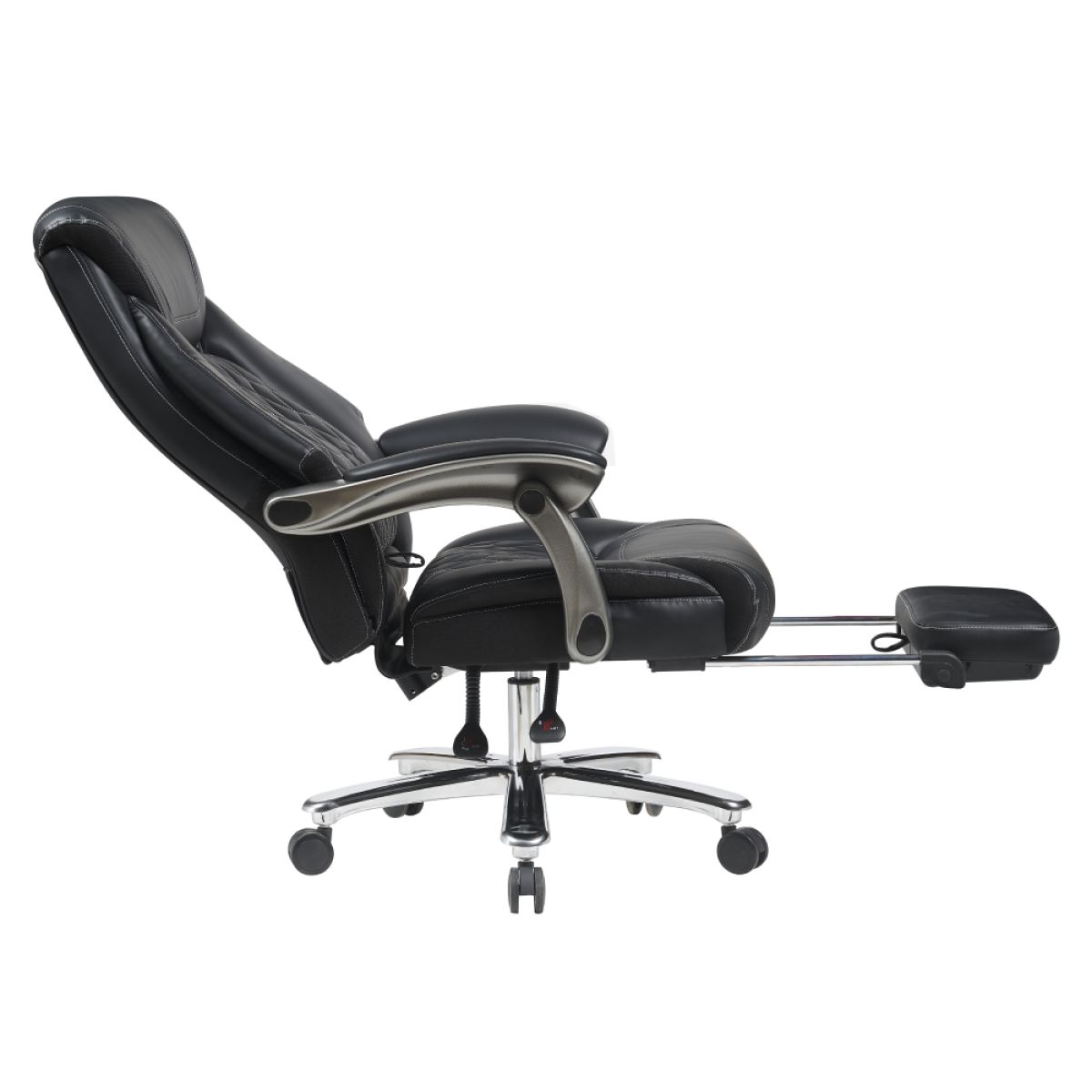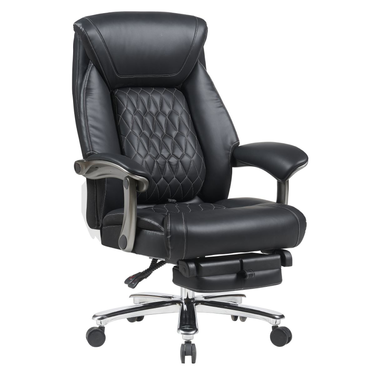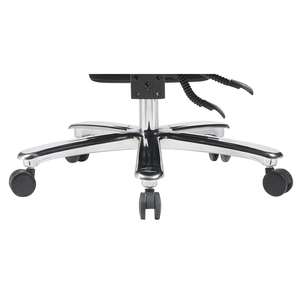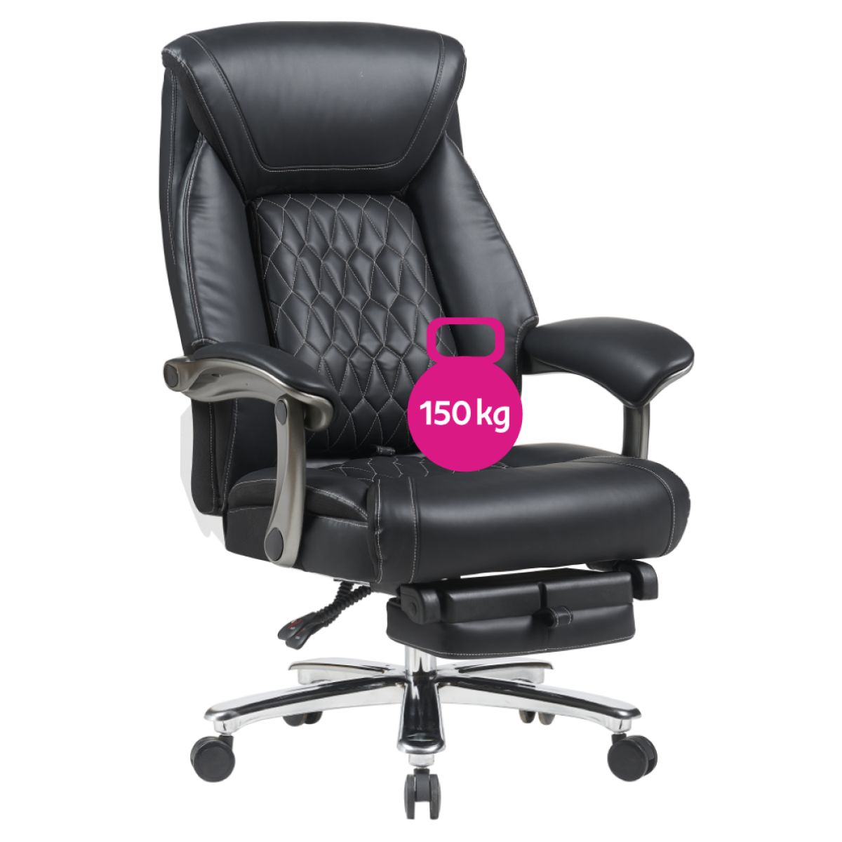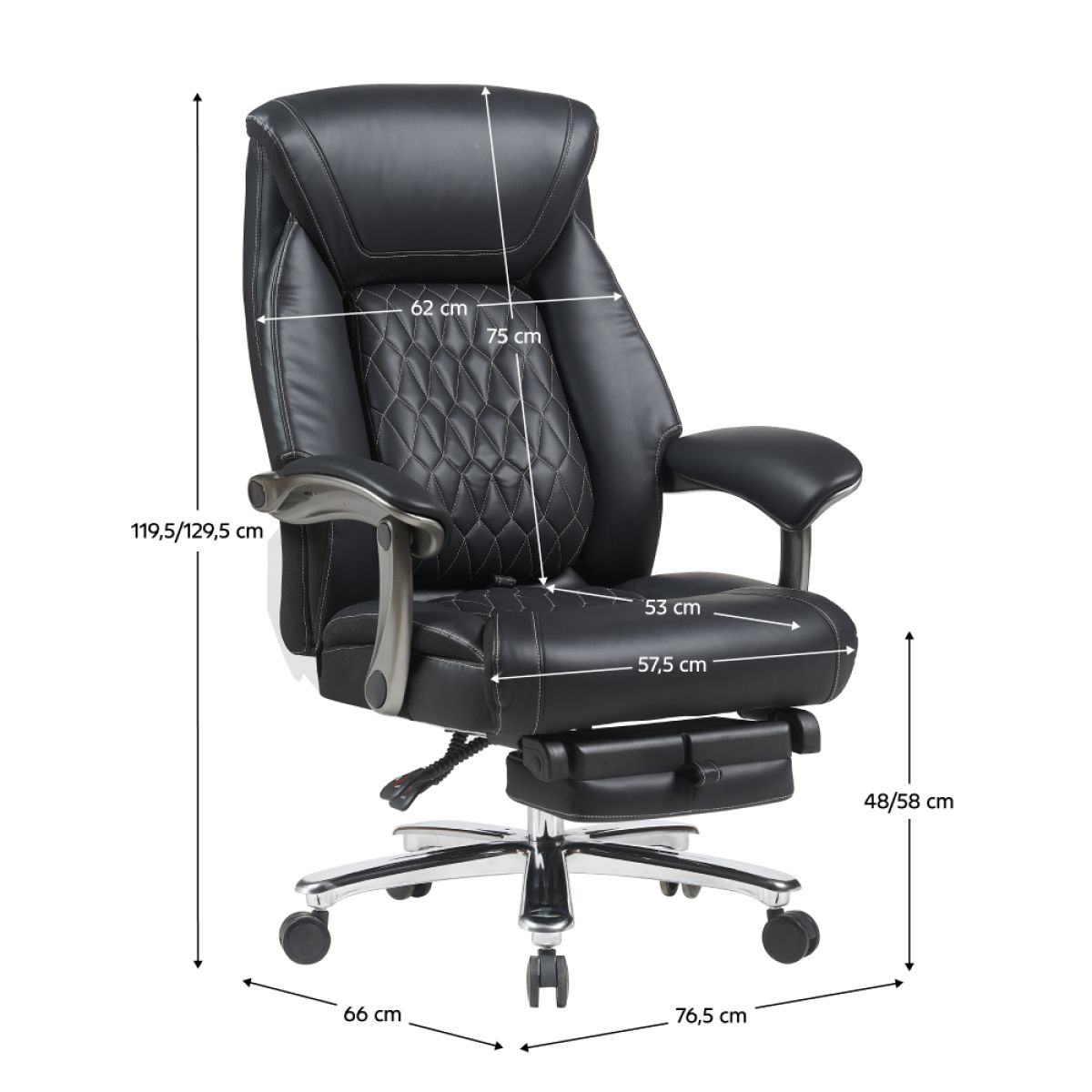 Material: piele ecologică/metal Rezistenţa la frecare a pielii ecologice conform testului Martindale: 100 000 de cicluri de frecare Culoare: neagră/crom Dimensiuni (lxAxh): 76,5x66x119,5-129,5 cm Înălţimea părţii de şezut: 48-58 cm Adâncimea părţii de şezut: 53 cm Lăţimea părţii de şezut: 57,5 cm Înălţime spătar: 75 cm Lăţime spătar: 62 cm Portanţă: 150 kg Scaun pivotant Înălţime reglabilă a şezutului Înălţime reglabilă a spătarului Suport lombar ergonomic Cotiere tapiţate Suport pentru picioare extensibil Roţi universale Roţile sunt potrivite atât pentru podele moi, cât şi dure Caracteristici ergonomice practice Livrat dezasamblat