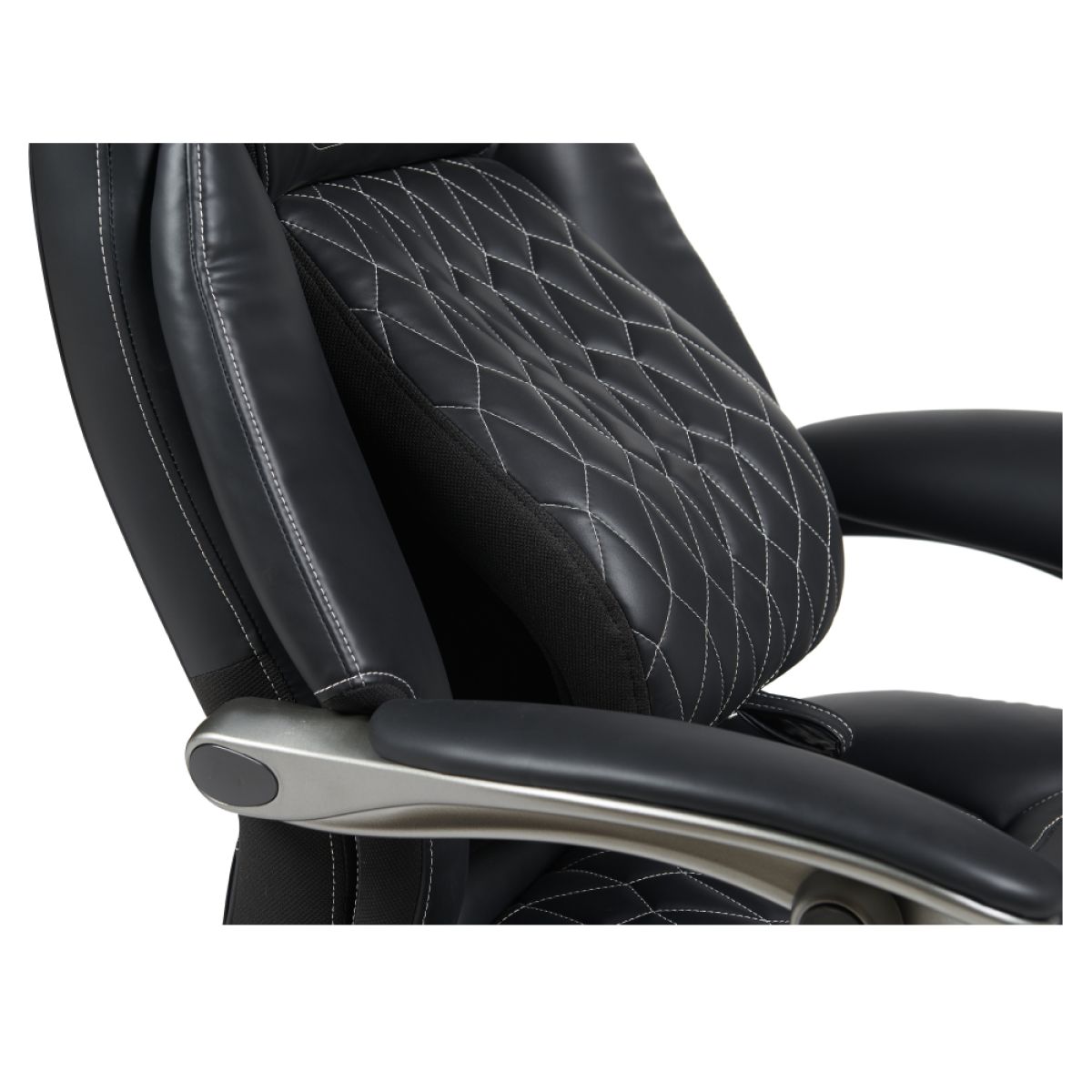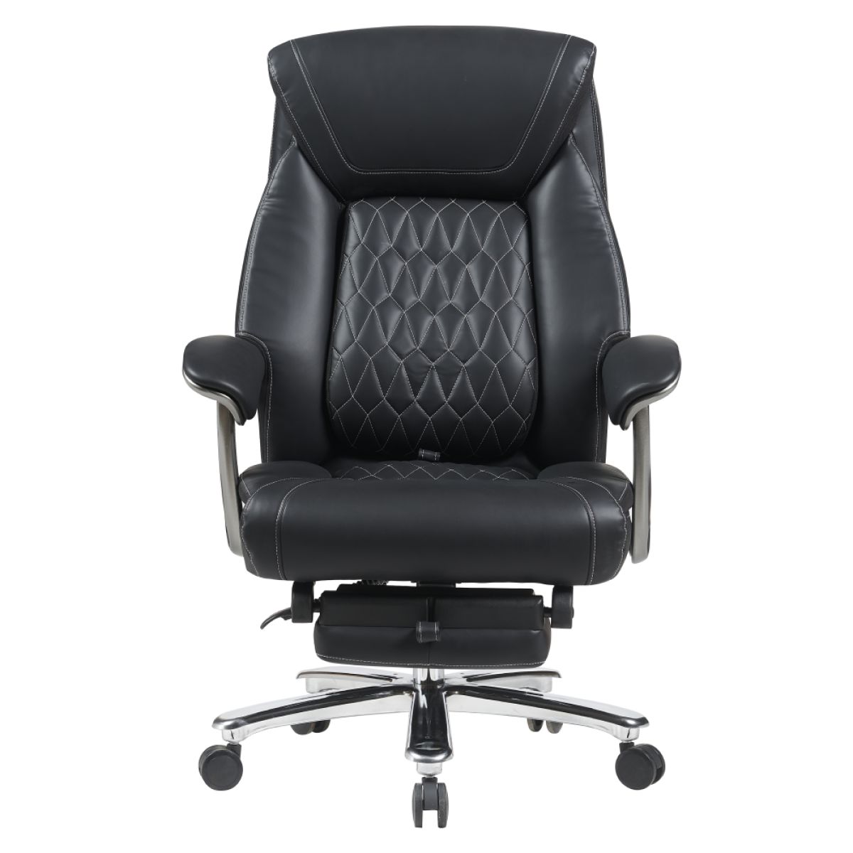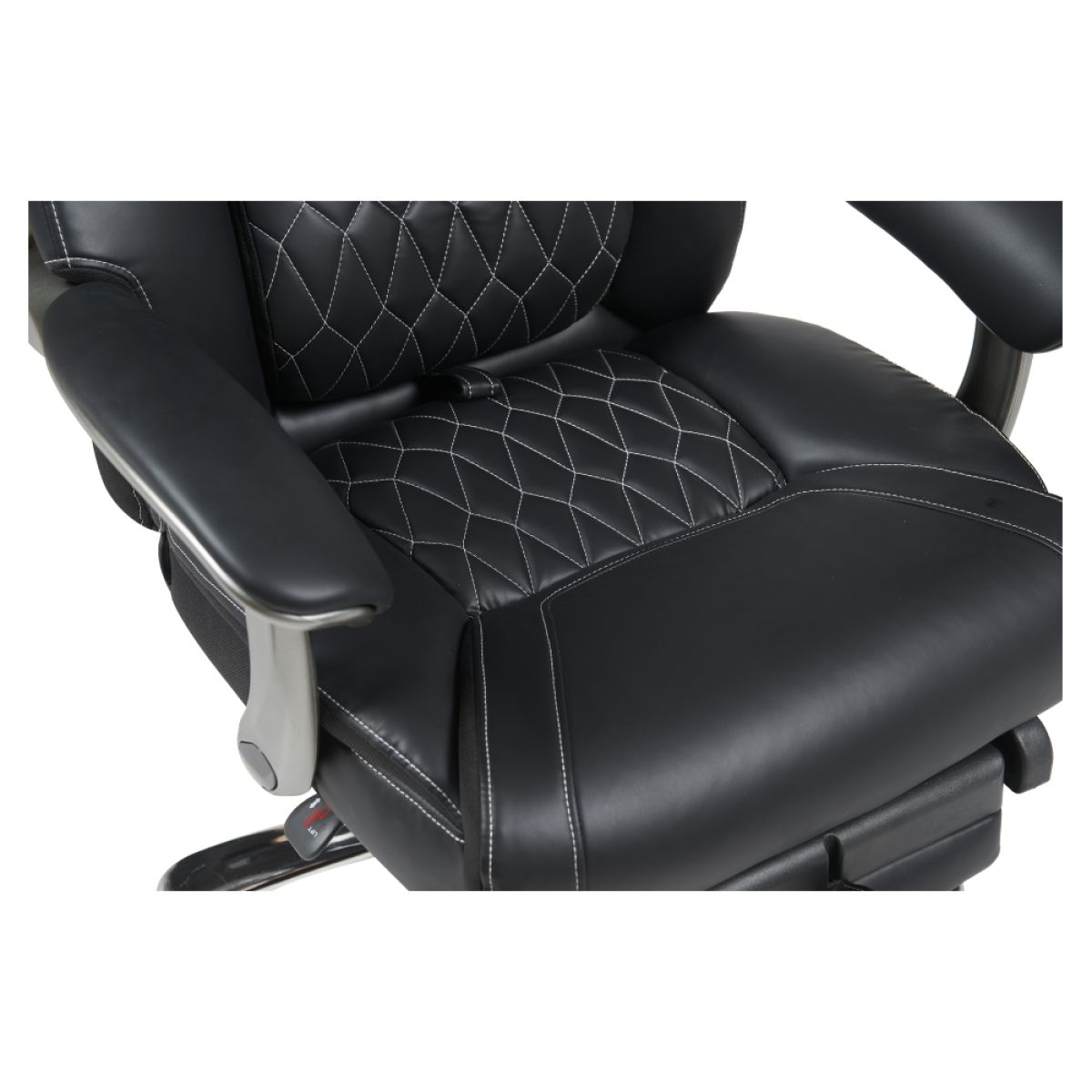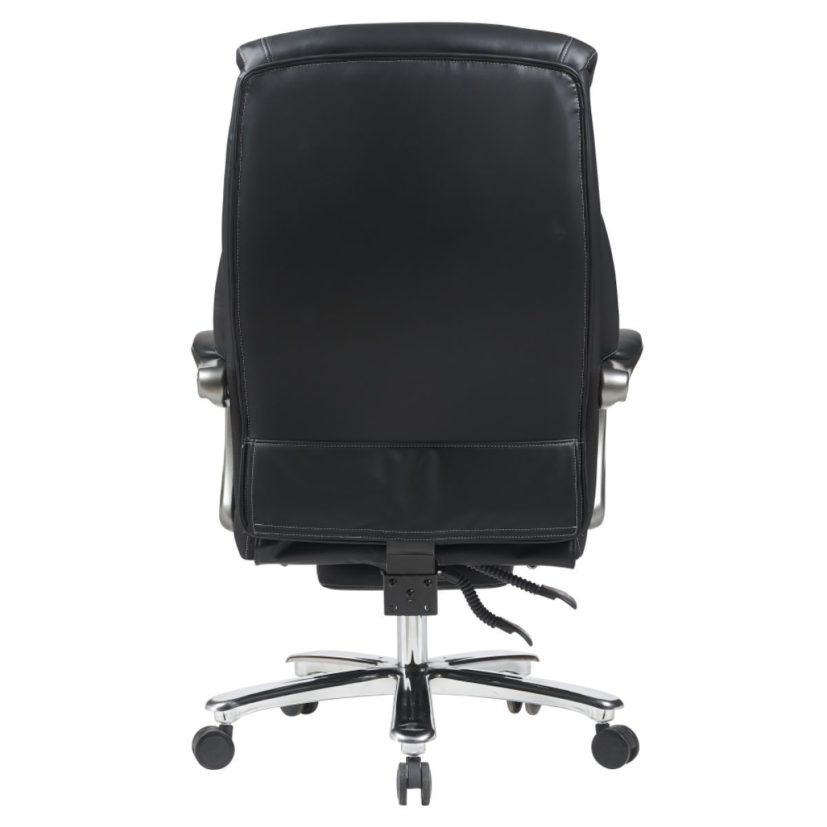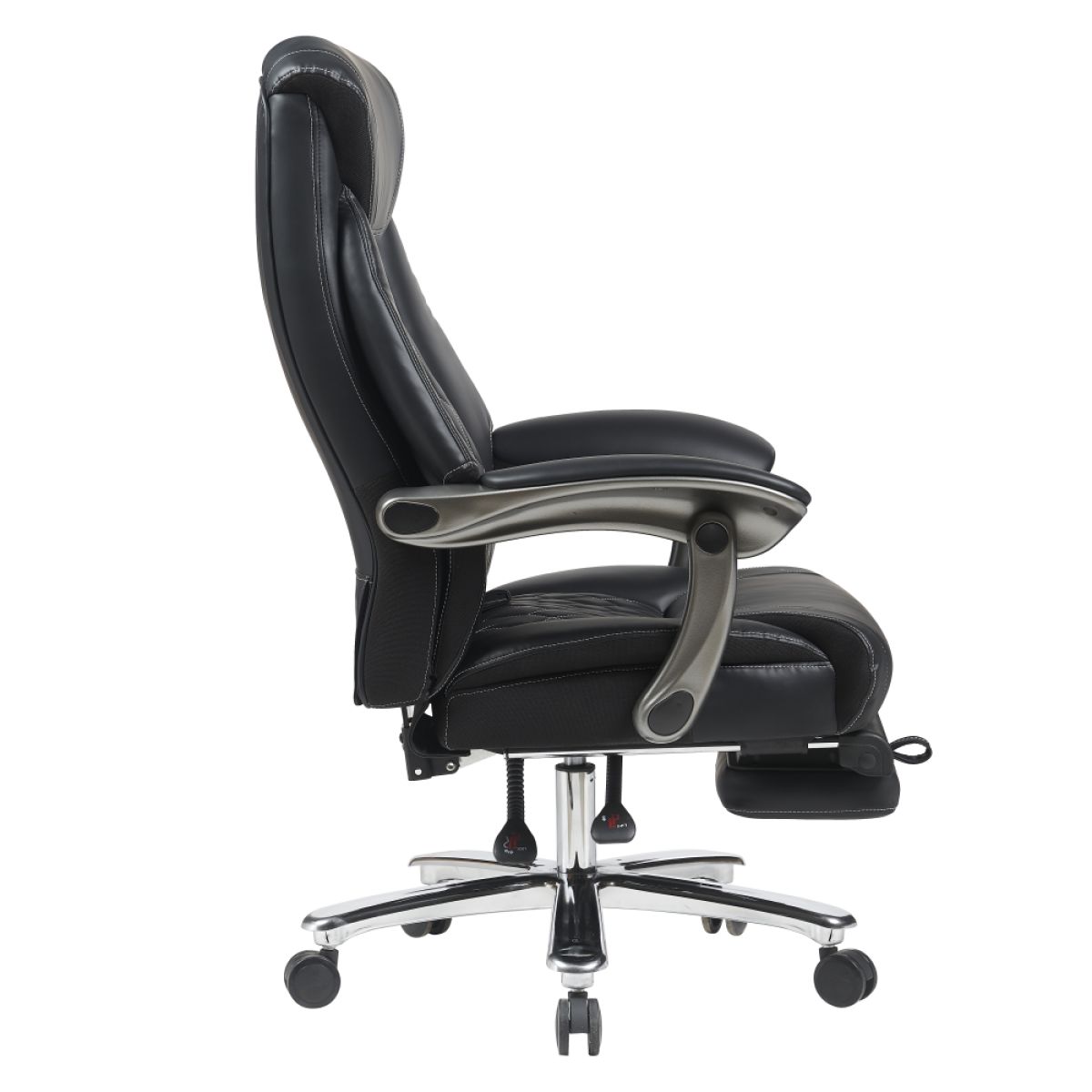 Material: piele ecologică/metal Rezistenţa la frecare a pielii ecologice conform testului Martindale: 100 000 de cicluri de frecare Culoare: neagră/crom Dimensiuni (lxAxh): 76,5x66x119,5-129,5 cm Înălţimea părţii de şezut: 48-58 cm Adâncimea părţii de şezut: 53 cm Lăţimea părţii de şezut: 57,5 cm Înălţime spătar: 75 cm Lăţime spătar: 62 cm Portanţă: 150 kg Scaun pivotant Înălţime reglabilă a şezutului Înălţime reglabilă a spătarului Suport lombar ergonomic Cotiere tapiţate Suport pentru picioare extensibil Roţi universale Roţile sunt potrivite atât pentru podele moi, cât şi dure Caracteristici ergonomice practice Livrat dezasamblat