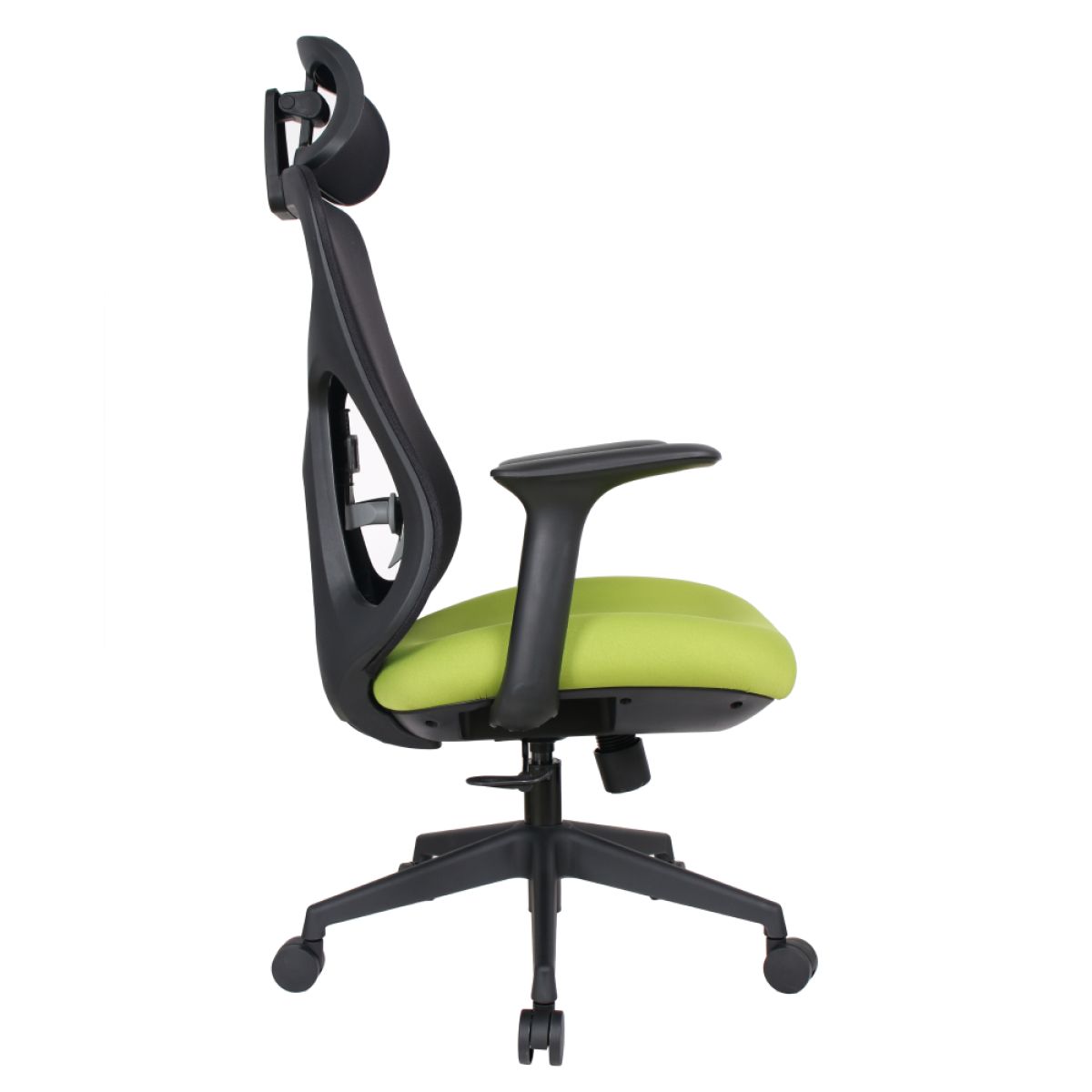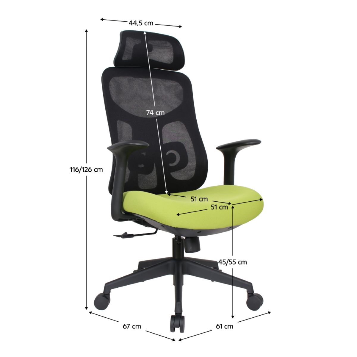 Material: plasă /plastic Rezistenţa ţesăturii la frecare conform testului Martindale: 90 000 de cicluri de frecare Culoare: verde/neagră Dimensiuni (lxAxh): 64x64x118-126 cm, Înălţimea părţii de şezut: 41-49 cm Adâncimea părţii de şezut: 51 cm Lăţimea părţii de şezut: 51 cm Lăţime spătar: 47 cm Înălţime spătar: 67 cm Portanţă: 150 kg Scaun rotativ Mecanism balansare Tetieră reglabilă Înălţime reglabilă părţii de şezut Cu cotiere Suport lombar ergonomic cu posibilitatea de reglare a înălţimii şezut modelat Livrat dezasamblat
