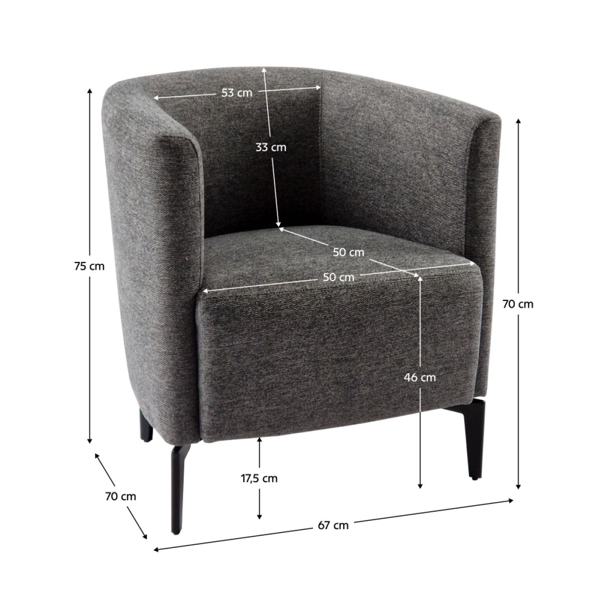 Material: ţesătură Matana 04 Rezistenţa ţesăturii conform testului Martindale: 57.000 cicluri de frecare Dimensiuni (LxAxÎ): 67x70x75 cm Culoarea tapiţeriei: gri Umplutură: arcuri ondulate + spumă PUR T30 Material picioare: metal Culoarea picioarelor: neagră Înălţimea compartimentului inferior faţă de podea: 17,5 cm Înălţime spătar: 33 cm Lăţime spătar: 53 cm Înălţime scaun: 46 cm Adâncime scaun: 50 cm Lăţime scaun: 50 cm Înălţime cotieră: 70 cm Capacitate de încărcare: 120 kg De design Tapiţat integral Livrat dezasamblat Posibilitatea de a alege dintre 6 nuanţe ale ţesăturii Matana la preţul de 835 Lei. Pentru comenzi personalizate este necesară plata unui avans de 10% din suma totală. După achitarea avansului, comanda dumneavoastră va intra în producţie. Termenul de livrare este de 6-8 săptămâni.