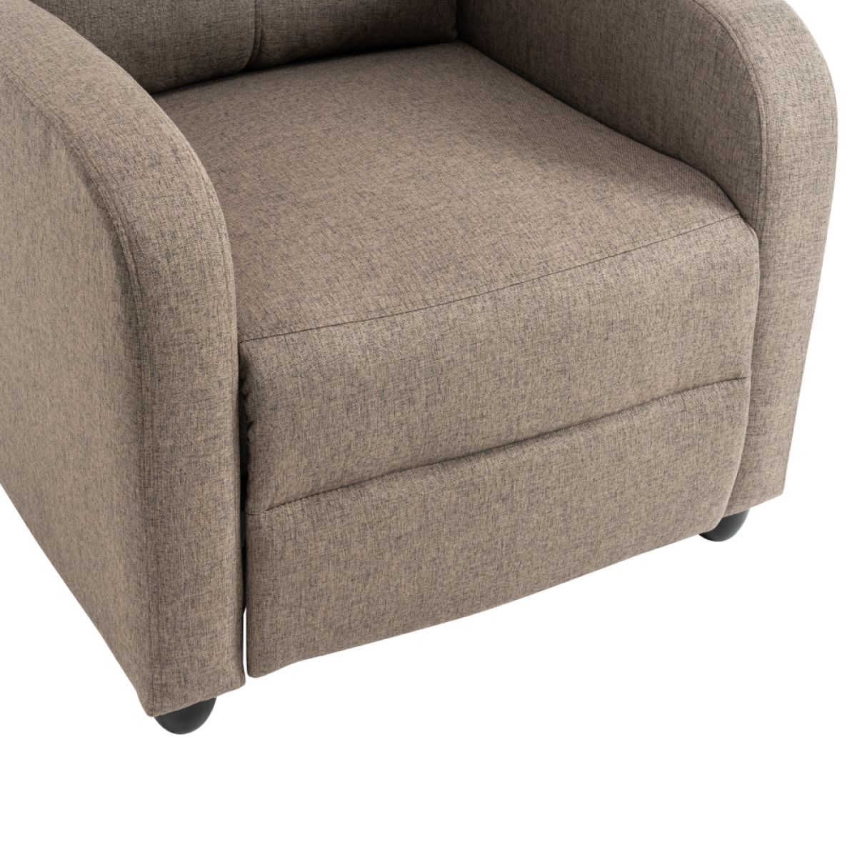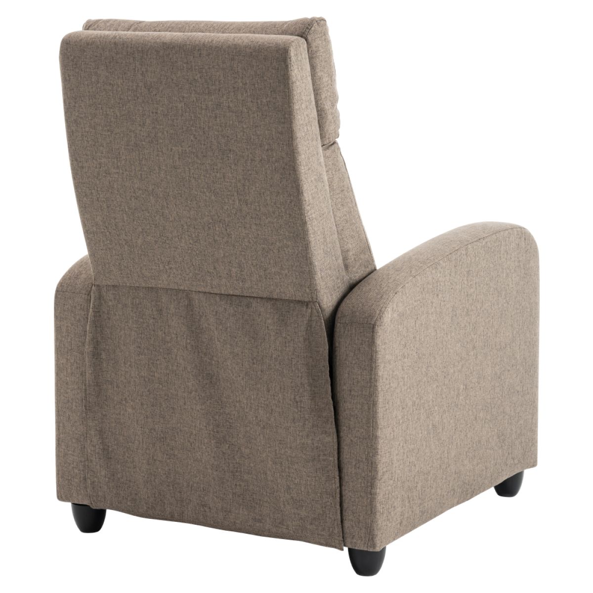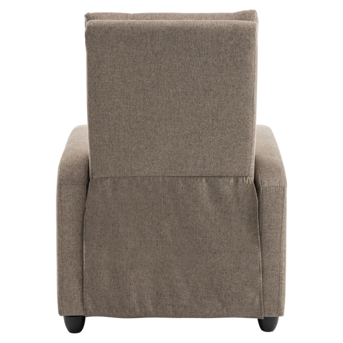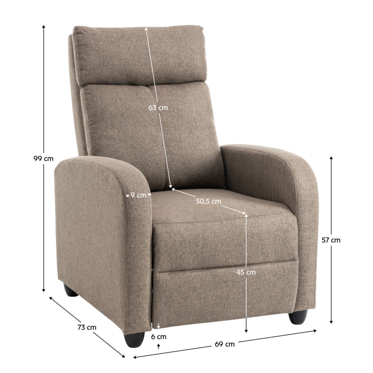 Material: ţesătură / plastic Culoare: maro Dimensiunile fotoliului (LxAxÎ): 69x73x99 cm Înălţime scaun: 45 cm Adâncime scaun: 50,5 cm Înălţime spătar: 63 cm Înălţime cotieră: 57 cm Lăţime cotieră: 9 cm Înălţime picioare: 6 cm Capacitate de încărcare: 120 kg Cu funcţie de ajustare Reglabil mecanic Relaxant Picioare din plastic Livrat dezasamblat