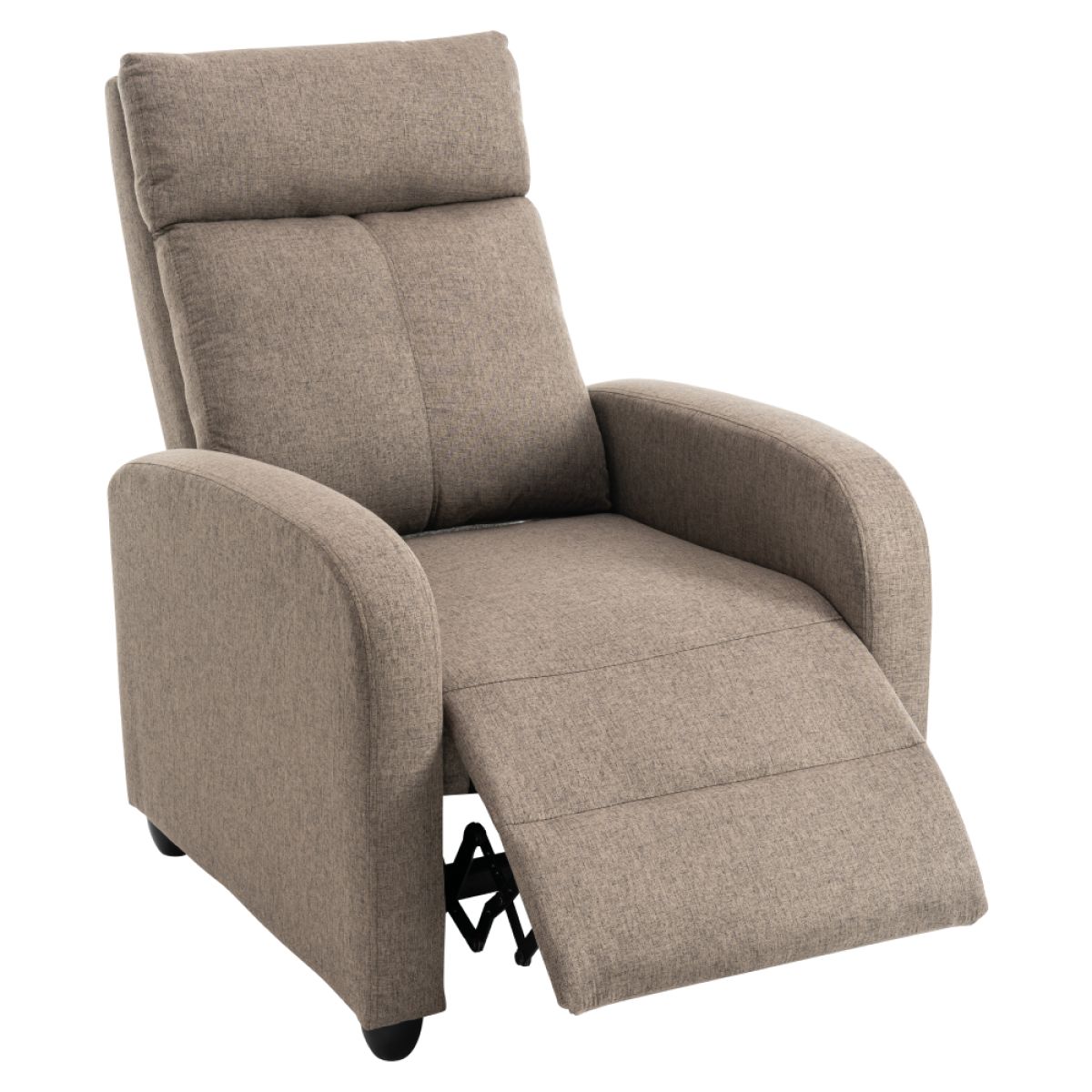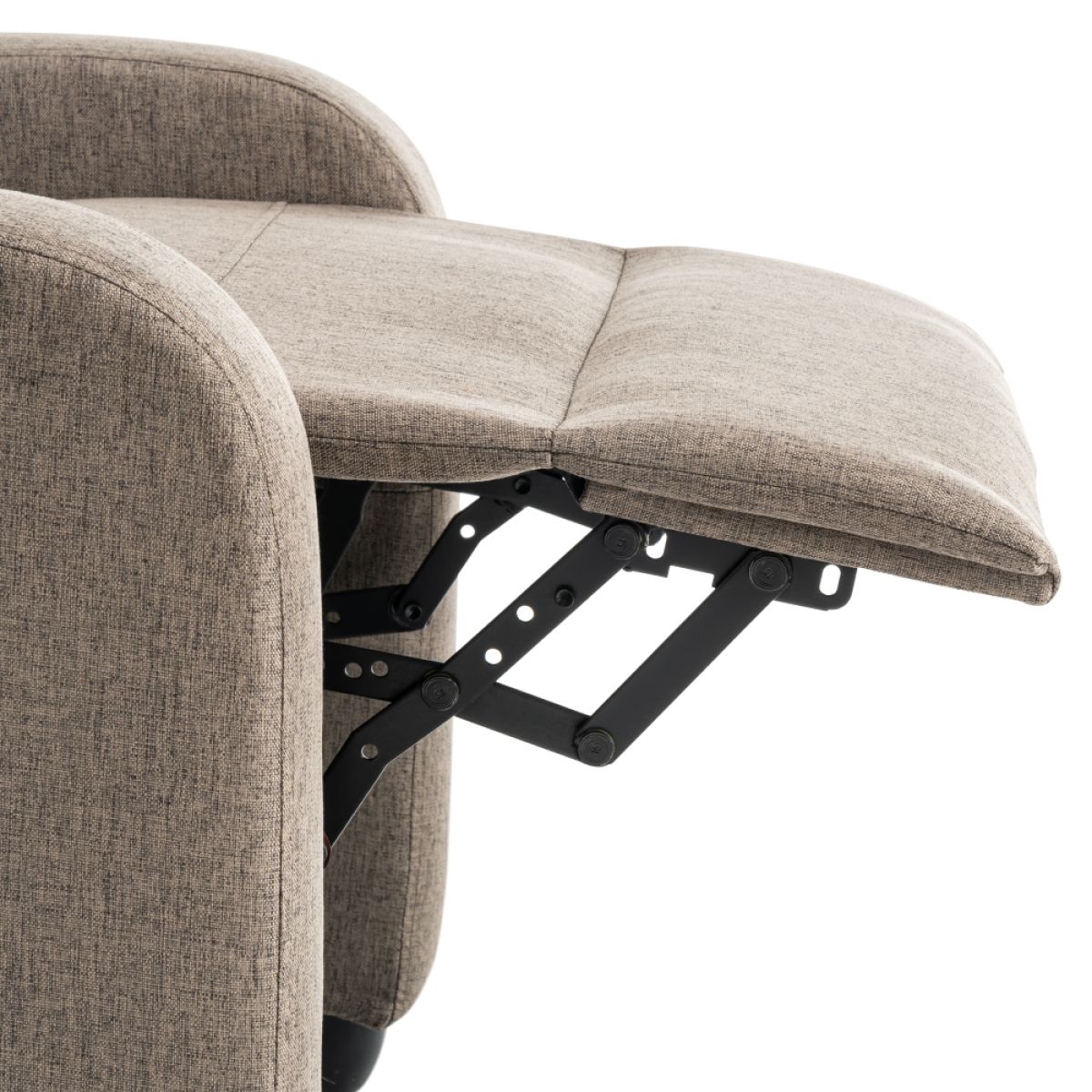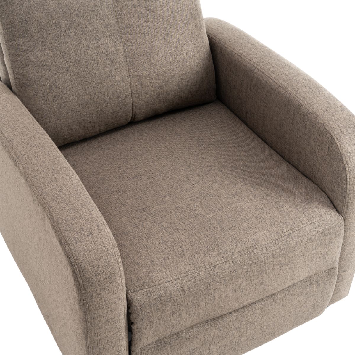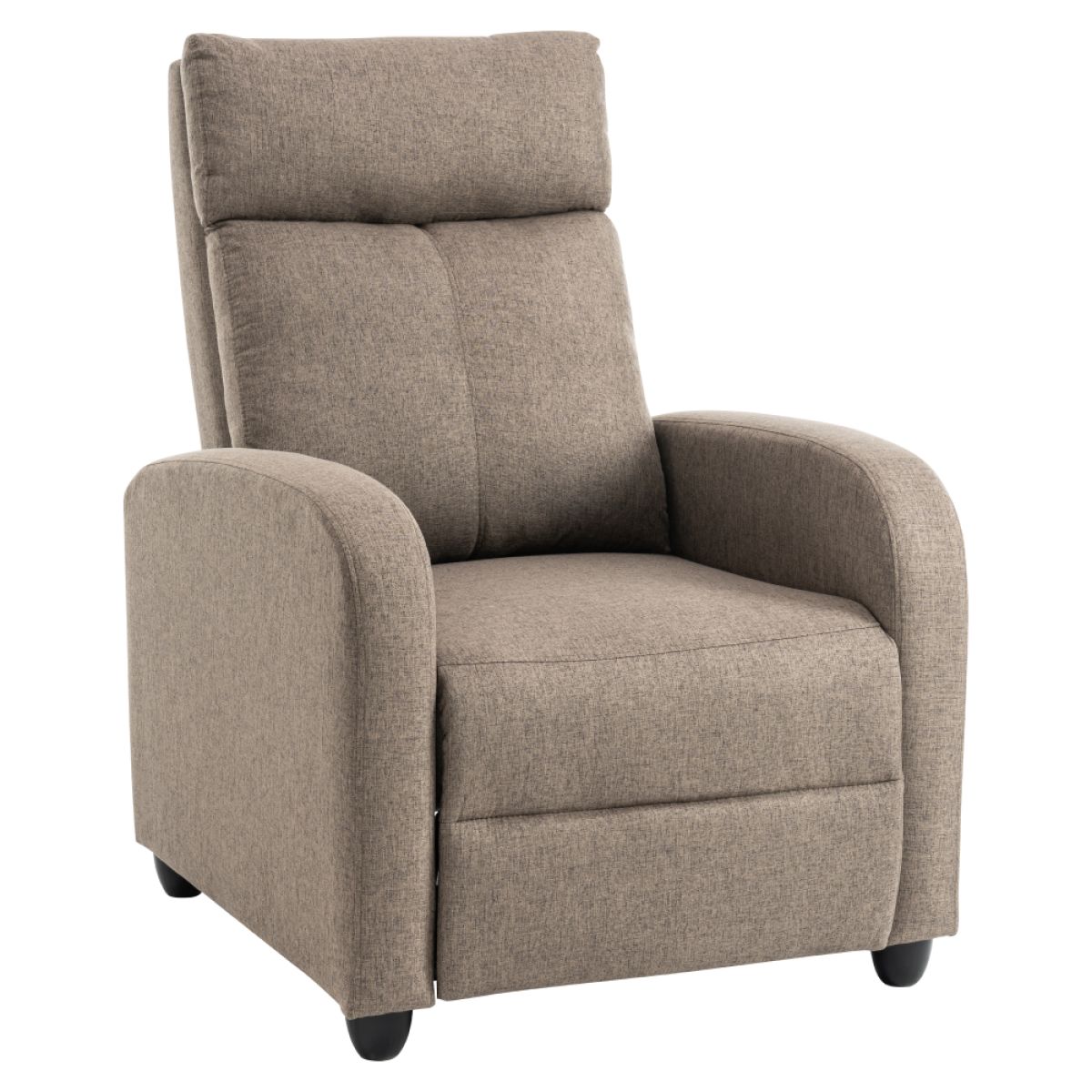 Material: ţesătură / plastic Culoare: maro Dimensiunile fotoliului (LxAxÎ): 69x73x99 cm Înălţime scaun: 45 cm Adâncime scaun: 50,5 cm Înălţime spătar: 63 cm Înălţime cotieră: 57 cm Lăţime cotieră: 9 cm Înălţime picioare: 6 cm Capacitate de încărcare: 120 kg Cu funcţie de ajustare Reglabil mecanic Relaxant Picioare din plastic Livrat dezasamblat