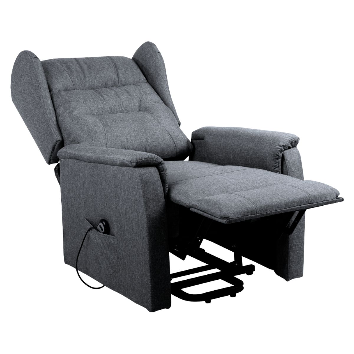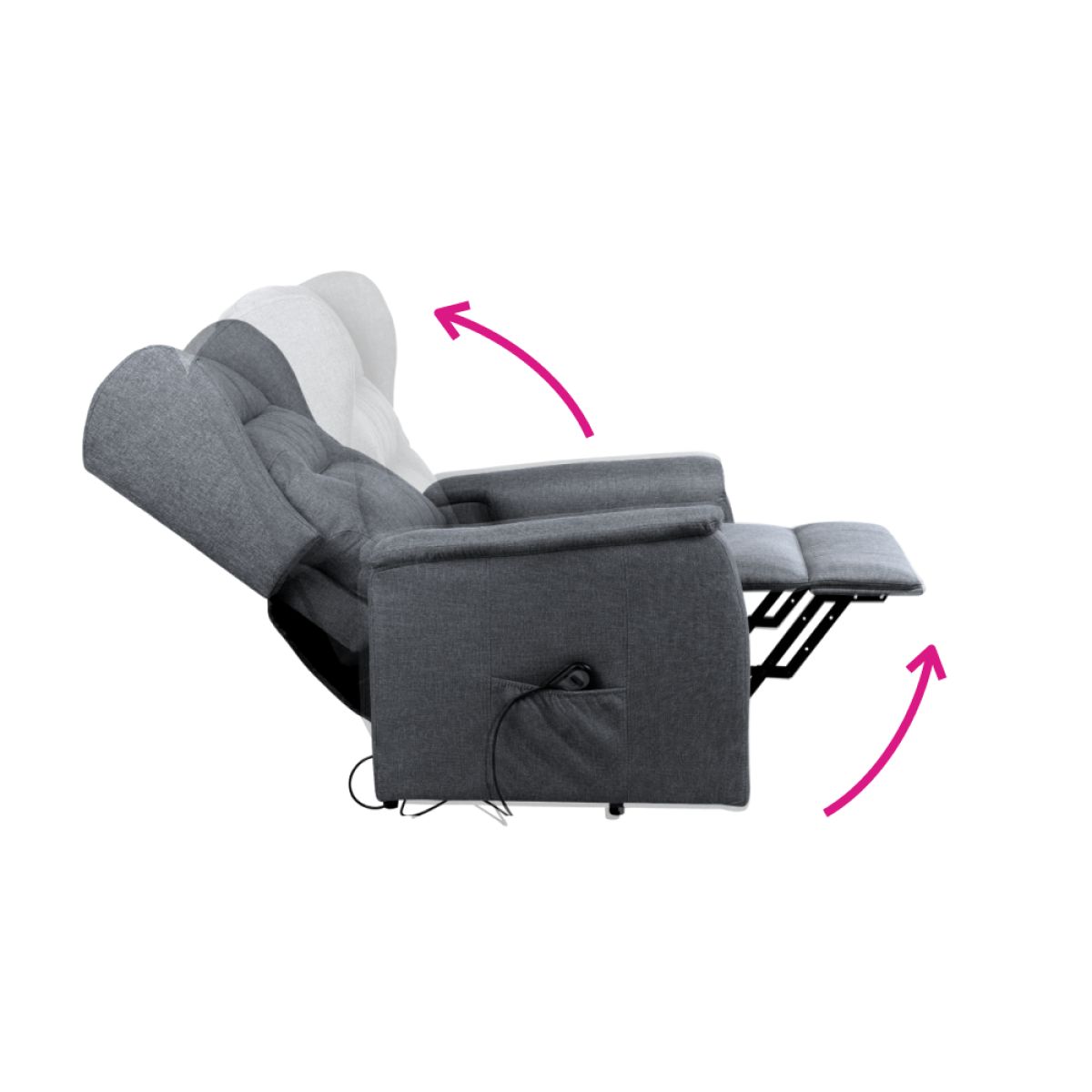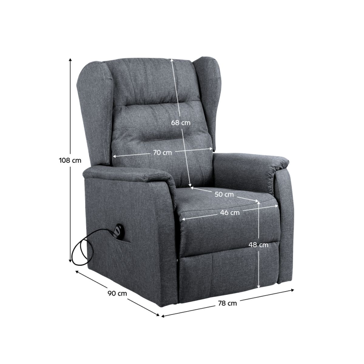 Material:oţel/ţesătură Rezistenţa ţesăturii la frecare conform testului Martindale: 50.000 Umplutură: spumă de înaltă densitate 240D Culoare: gri deschis Dimensiuni (Lxlxh): 78x90-162x86-108 cm Înălţimea scaunului: 48 cm Adâncimea părţii de şezut: 50 cm Lăţime părţii de şezut: 46 cm Lăţime spătar: 70 cm Înălţime spătar: 68 cm Portanţă: 150 kg Poziţionare Relaxare Mecanism pentru înclinarea bazei şi a spatelui Livrat cu telecomandă Lungime cablu de alimentare: 2,5 cm Tensiune: 100-240V Se livrează dezasamblat