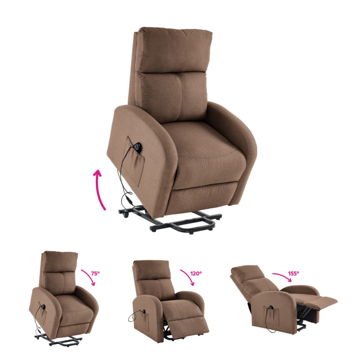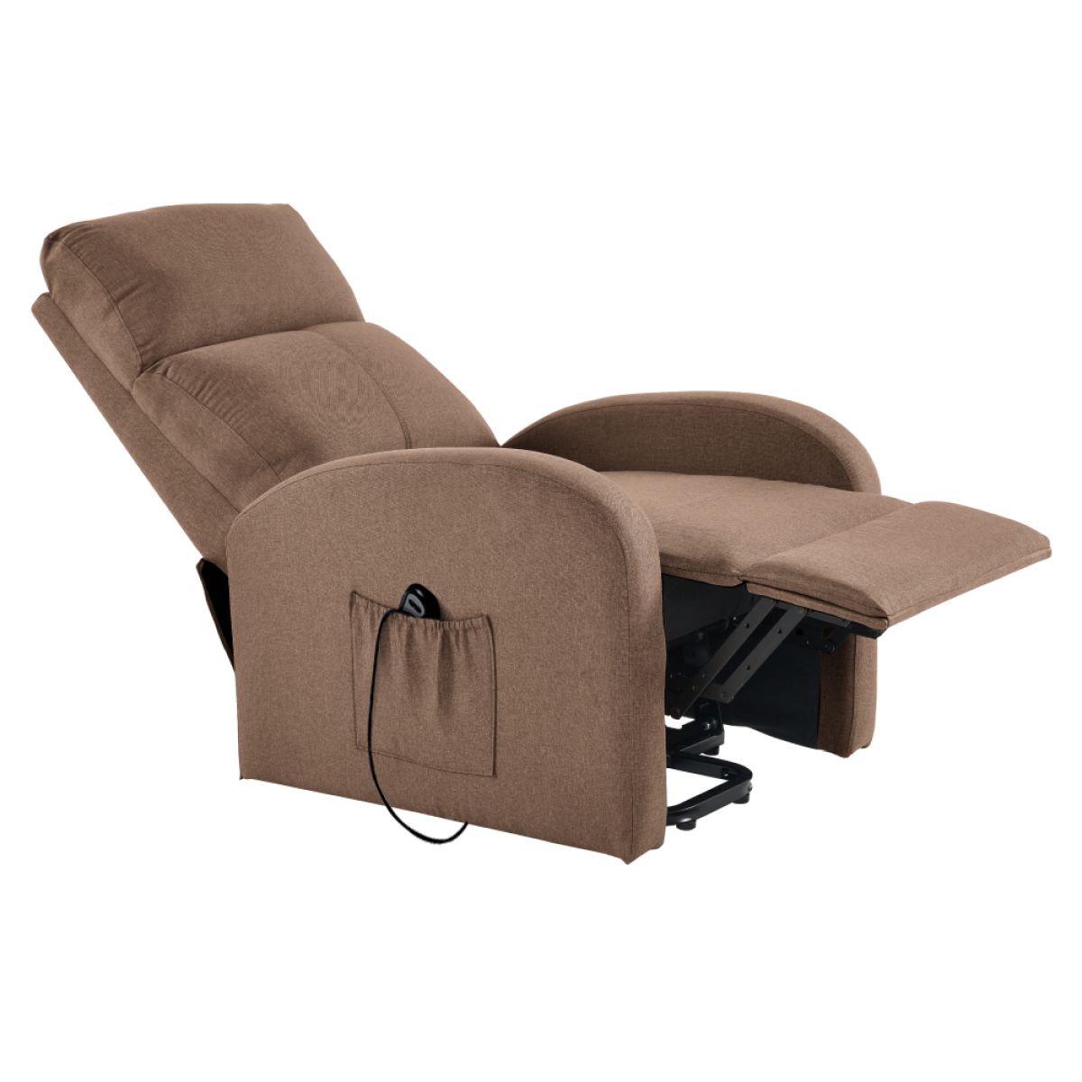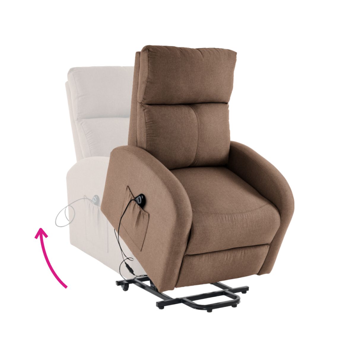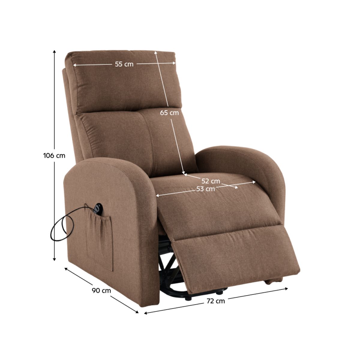 Material:oţel/ţesătură Rezistenţa ţesăturii la frecare conform testului Martindale: 50.000 cicluri de frecare Umplutură: spumă de înaltă densitate 240D Culoare: maro deschis Dimensiuni (Lxlxh): 72x90-161x86-105 cm Înălţimea scaunului: 49 cm Adâncime scaun: 52 cm Lăţimea părţii de şezut: 53 cm Lăţime spătar: 55 cm Înălţime spătar: 65 cm Portanţă: 150 kg Poziţionare Relaxare Mecanism pentru înclinarea bazei şi a spatelui Livrat cu telecomandă Lungime cablu de alimentare: 2,5 cm Tensiune: 100-240V Se livrează dezasamblat