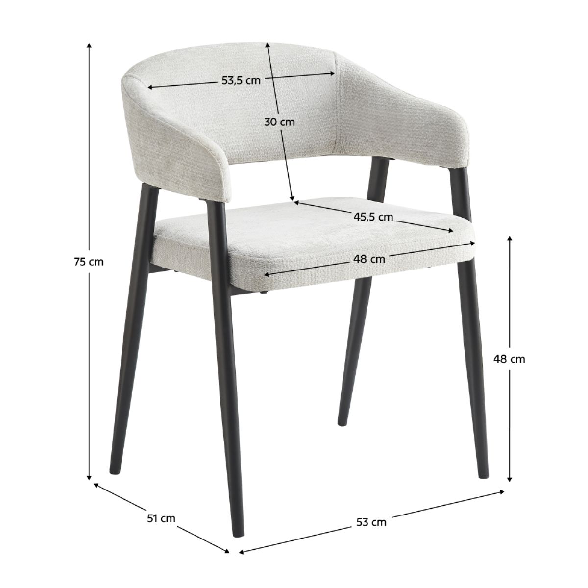 Material: ţesătură/metal Rezistenţa ţesăturii la frecare conform testului Martindale: 80 000 de cicluri de frecare Culoare: gri deschis/negru Dimensiuni (lxAxh): 53x51x75 cm Înălţimea părţii de şezut: 48 cm Adâncimea părţii de şezut: 45,5 cm Lăţimea părţii de şezut: 48 cm Lăţime spătar: 53,5 cm Înălţime spătar: 30 cm Portanţă: 100 kg Construcţie metalică De design Livrat dezasamblat