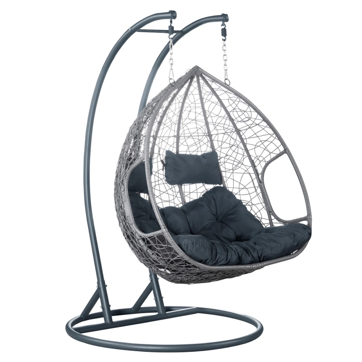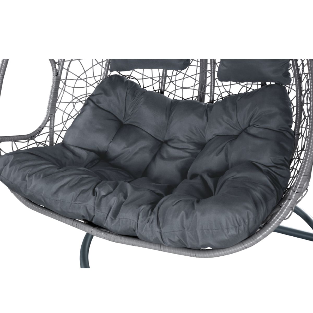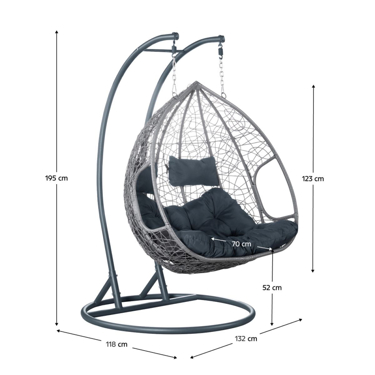 Material: oţel/ratan tehnic/ţesătură Rezistenţa ţesăturii la frecare conform testului Martindale: 95.000 de cicluri de frecare Culoare: gri Dimensiuni (Lxlxh): 132x118x195 cm Dimensiuni fotoliu (Lxlxh): 132x70x123 cm Portanţă: 180 cm Înălţimea părţii de şezut: 52 cm Adâncimea părţii de şezut: 70 cm În exterior vă recomandăm să protejaţi fotoliul cu o husă de protecţie sau prelată Potrivit atât pentru interior, cât şi pentru exterior Cu pernă Fotoliu dublu Suport inclus Livrat dezasamblat