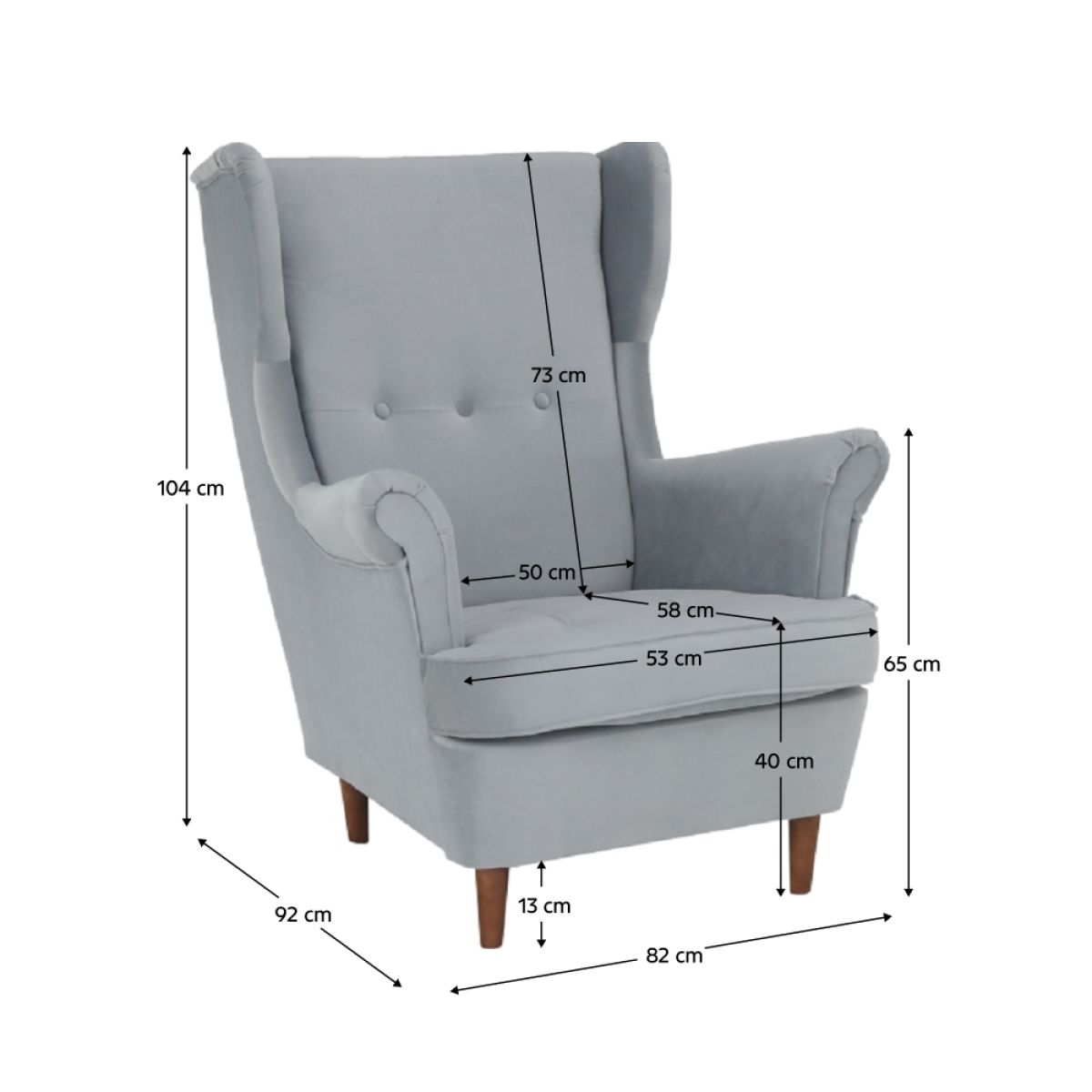 Material: material textil Paros 5/lemn Rezistenţa materialului: 55 000 Martindale Culoare: gri deschis/nuc Dimensiuni fotoliu (lxhxA): 82x104x92 cm Înălţime şezut: 40 cm Adâncime şezut: 58 cm Înălţimea spaţiului inferior de la podea: 13 cm Înălţimea spătarului: 73 cm Înălţimea de la sol până la cotieră: 65 cm Lăţimea scaunului: 53 cm Picioare din lemn Culoarea picioarelor poate varia Livrat nemontat