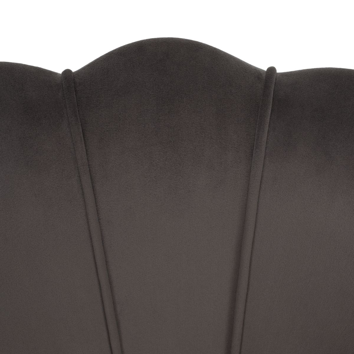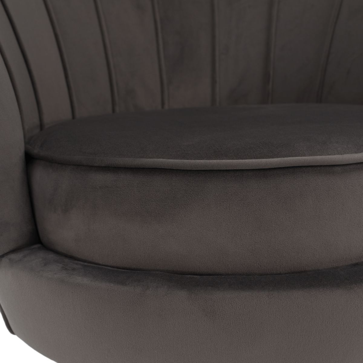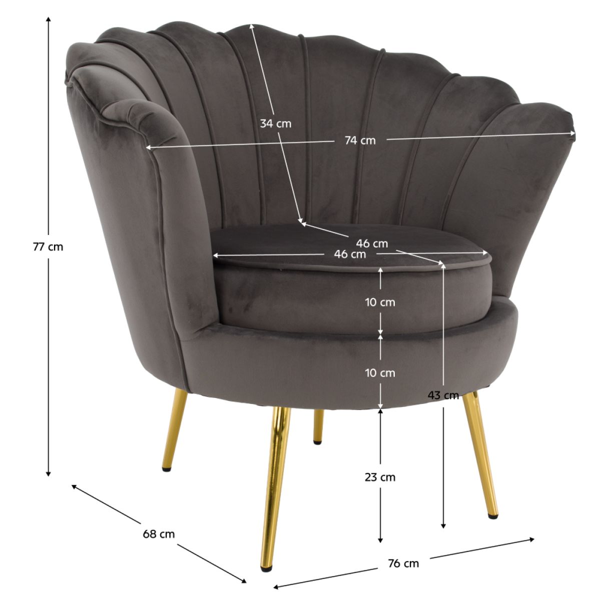 Material: ţesătură Velvet/metal Rezistenţa ţesăturii la frecare conform testului Martindale: 80 000 de cicluri de frecare Culoare: gri-maronie/gold crom auriu Dimensiuni (lxAxh): 76x71x76 cm Înălţimea părţii de şezut: 44 cm Adâncimea părţii de şezut: 46 cm Lăţimea părţii de şezut: 46 cm Înălţime spătar: 34 cm Lăţime spătar: 73 cm Portanţa: 100 kg Greutate: 11 kg Umplutură: spumă Design În stilul Art-deco În formă de coajă Complet tapiţat Cusături decorative Livrat asamblat
