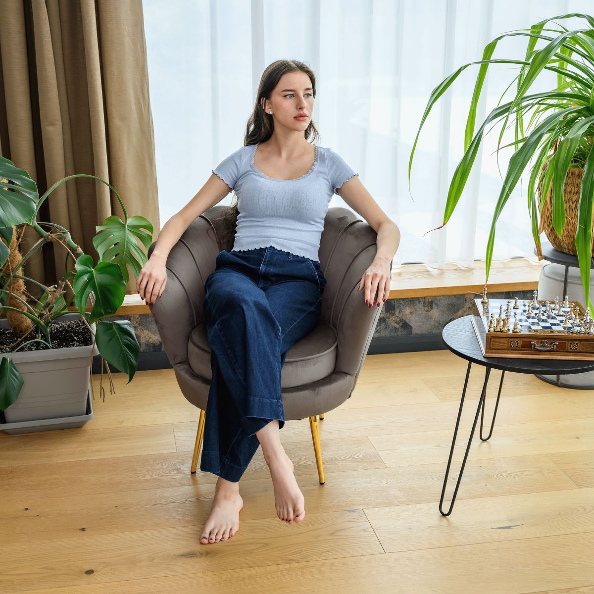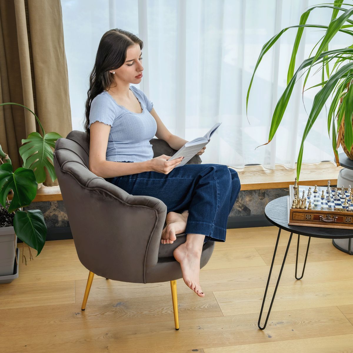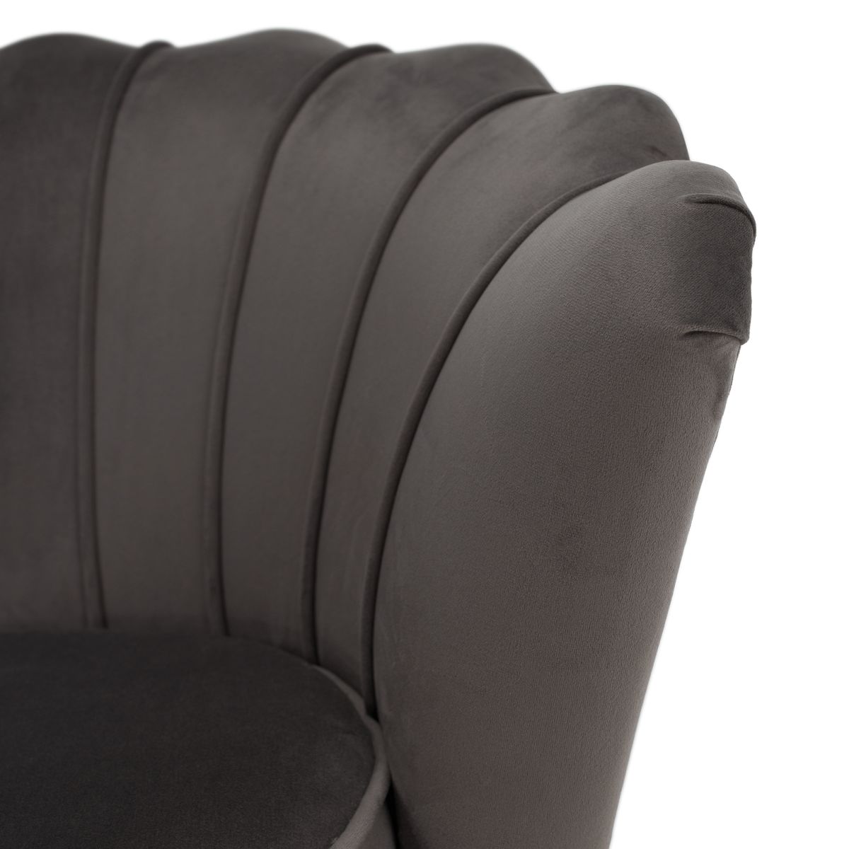 Material: ţesătură Velvet/metal Rezistenţa ţesăturii la frecare conform testului Martindale: 80 000 de cicluri de frecare Culoare: gri-maronie/gold crom auriu Dimensiuni (lxAxh): 76x71x76 cm Înălţimea părţii de şezut: 44 cm Adâncimea părţii de şezut: 46 cm Lăţimea părţii de şezut: 46 cm Înălţime spătar: 34 cm Lăţime spătar: 73 cm Portanţa: 100 kg Greutate: 11 kg Umplutură: spumă Design În stilul Art-deco În formă de coajă Complet tapiţat Cusături decorative Livrat asamblat