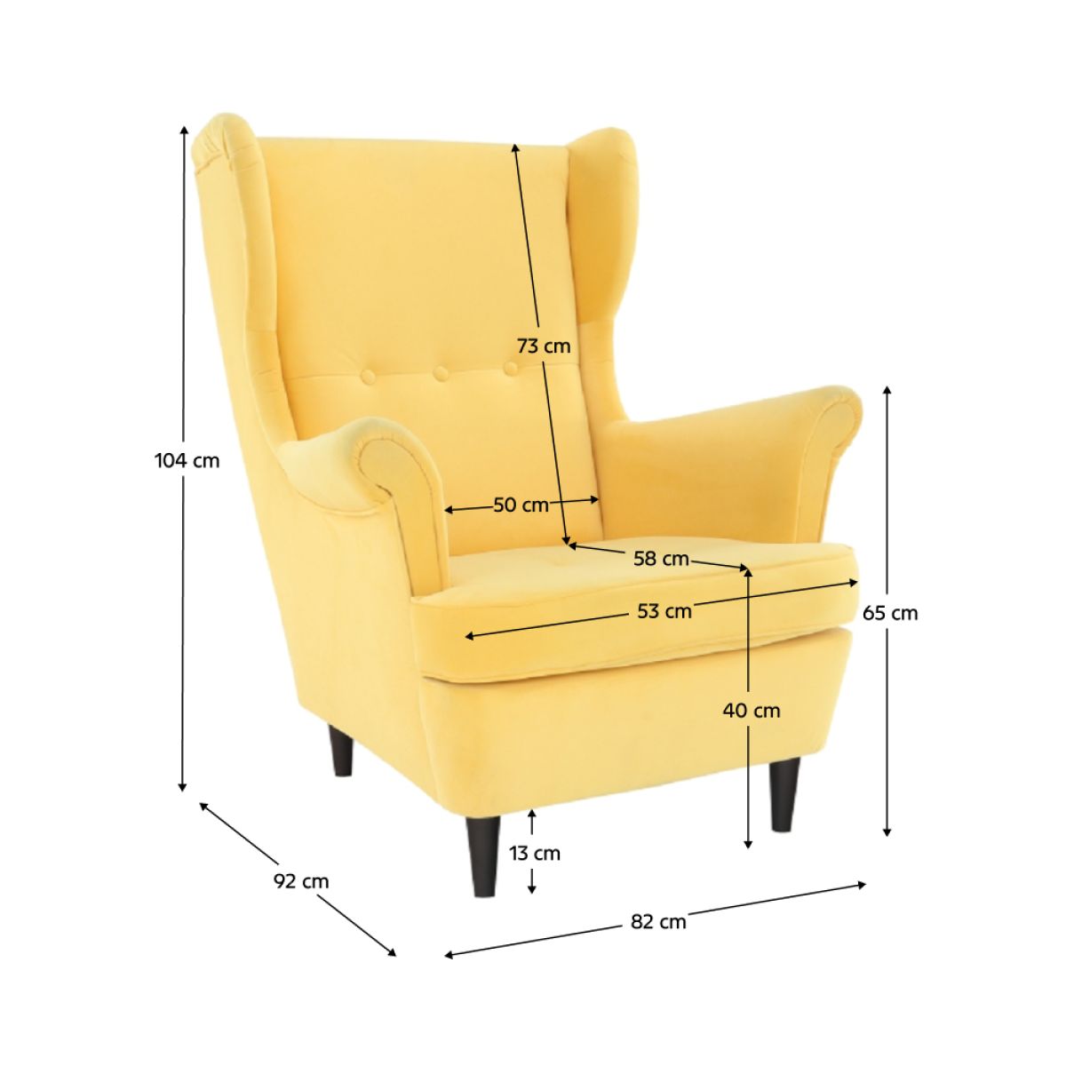 Material: material textil Trinity/lemn Rezistenţa materialului: 55 000 Martindale Culoare: galben/wenge Dimensiuni fotoliu (lxhxA): 82x104x92 cm Înălţime şezut: 40 cm Adâncime şezut: 58 cm Înălţime picioare: 13 cm Înălţimea spătarului: 73 cm Înălţimea de la sol până la cotieră: 65 cm Lăţimea scaunului: 53 cm Greutate susţinută: 120 kg Picioare din lemn Livrat demontat