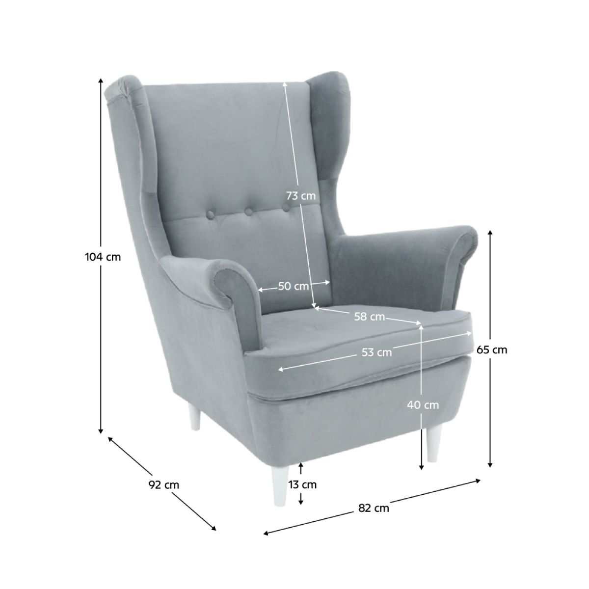 Material: material textil Trinity/lemn Rezistenţa materialului: 55 000 Martindale Culoare: gri deschis/alb Dimensiuni fotoliu (lxhxA): 82x104x92 cm Înălţime şezut: 40 cm Adâncime şezut: 58 cm Înălţime picioare: 13 cm Înălţimea spătarului: 73 cm Înălţimea de la sol până la cotieră: 65 cm Lăţimea scaunului:53 cm Picioare din lemn Livrat nemontat