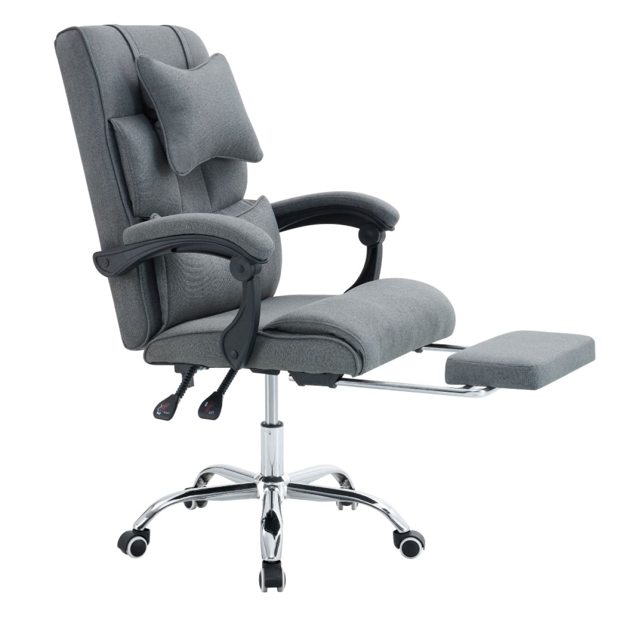 Material tapiţerie: material textil/metal Rezistenţa ţesăturii conform testului Martindale: 80.000 de cicluri de frecare Culoare: gri/crom Dimensiuni (LxAxÎ): 66x74-134x103-113 cm Înălţime scaun: 45-55 cm Adâncime scaun: 49 cm Lăţime scaun: 50 cm Înălţime spătar: 63 cm Lăţime spătar: 49 cm Capacitate de încărcare: 110 kg Cu spătar reglabil Cu cotiere Pernă în regiunea lombară şi cervicală Pernuţa pentru zona cervicală este detaşabilă Cea pentru zona lombară este ataşată de spătar Cu suport extensibil pentru picioare Mecanism de balansare Bază cromată Rotile universale Potrivit atât pentru pardoseli moi, cât şi pentru pardoseli dure Livrat dezasamblat