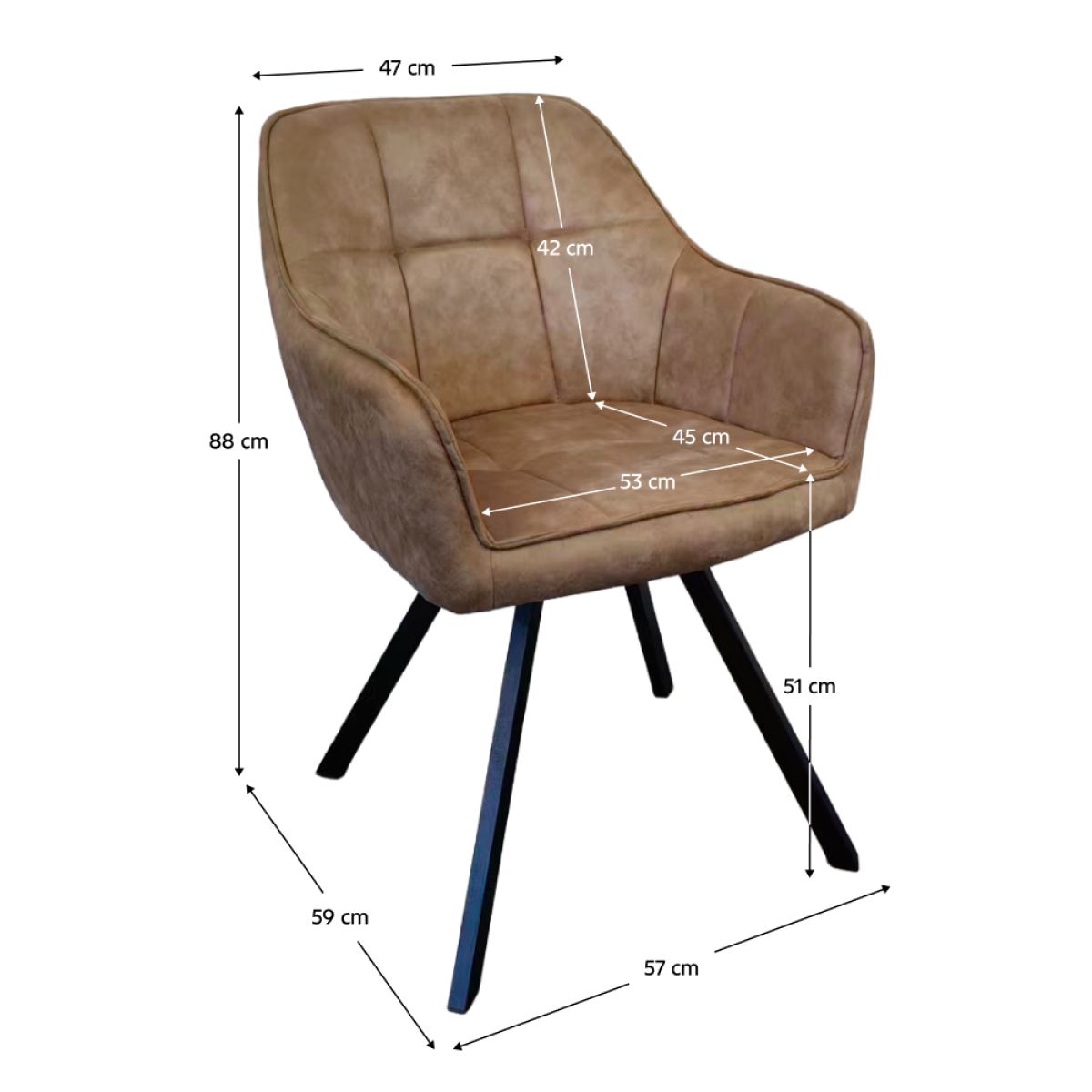 Material: ţesătură cu efect de piele periată/metal Rezistenţa ţesăturii la frecare conform testului Martindale: 68 000 de cicluri de frecare Culoare: gri maro/neagră Dimensiuni (lxAxh): 57x59x88 cm Înălţime părţii de şezut: 51 cm Adâncimea părţii de şezut: 45 cm Lăţimea părţii de şezut: 53 cm Lăţime spătar: 47 cm Înălţime spătar: 42 cm Portanţă: 100 kg Greutate: 6,35 kg Scaun pivotant De design Matlasat Livrat dezasamblat