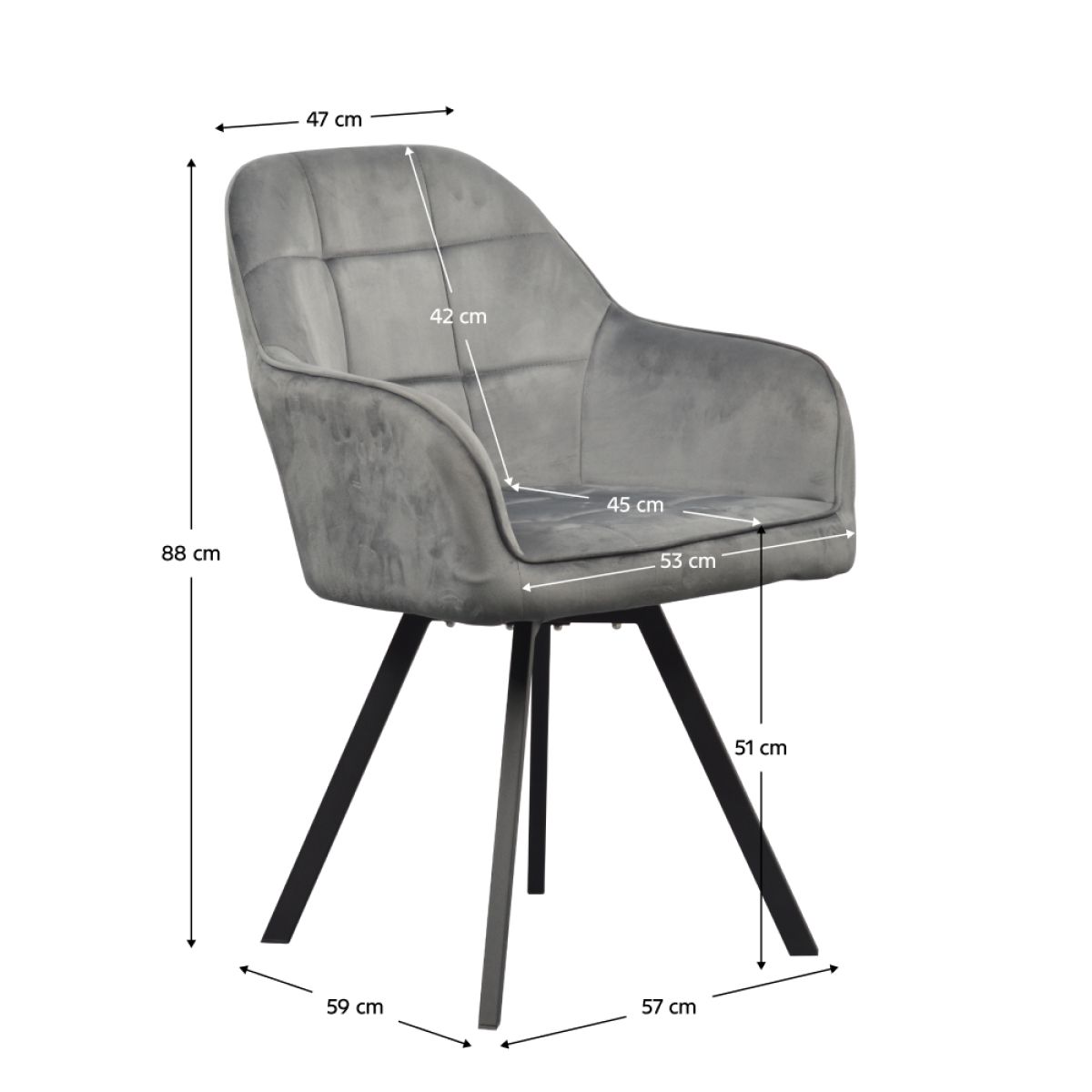 Material: ţesătură Velvet/metal Rezistenţa ţesăturii la frecare conform testului Martindale: 85 000 de cicluri de frecare Culoare: gri închis/neagră Dimensiuni (lxAxh): 57x59x85 cm Înălţime părţii de şezut: 51 cm Adâncimea părţii de şezut: 45 cm Lăţimea părţii de şezut: 43 cm Lăţime spătar: 35 cm Înălţime spătar: 40 cm Portanţă: 100 kg Greutate: 6,35 kg Scaun pivotant De design Matlasat Livrat dezasamblat