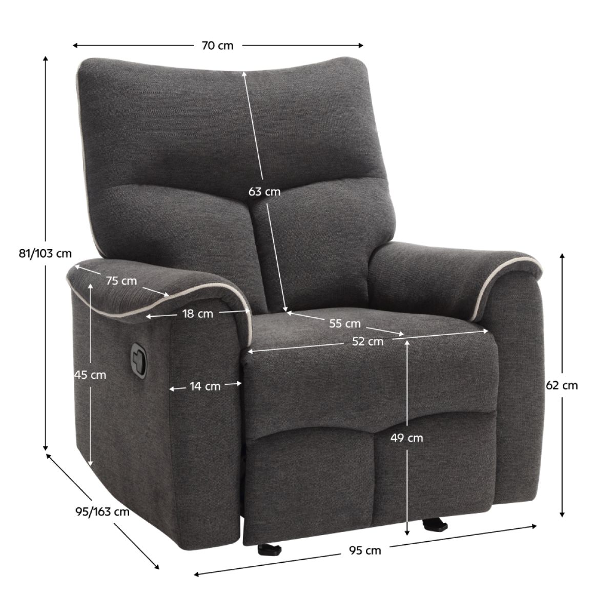 Material: ţesătură/oţel Culoare: gri închis/gri deschis Dimensiuni (lxAxh): 95x95-163x81-81 cm Înălţimea părţii de şezut: 49 cm Adâncimea părţii de şezut: 55 cm Lăţimea părţii de şezut: 52 cm, Lăţimea spatelui: 70 cm Înălţime spate: 63 cm Dimensiuni cotieră (lxAxh): 18x75x45 cm Portanţă: 110 kg Umplutură: spumă Poziţionabil Poziţionabil mecanic De relaxare Cusut decorativ Margini decorative Livrat dezasamblat