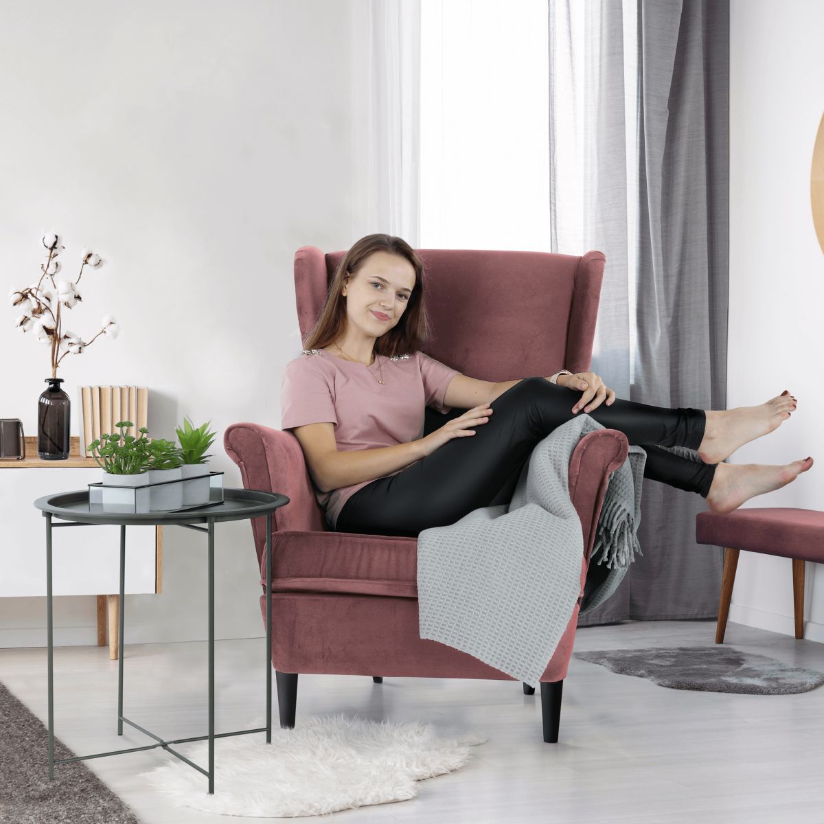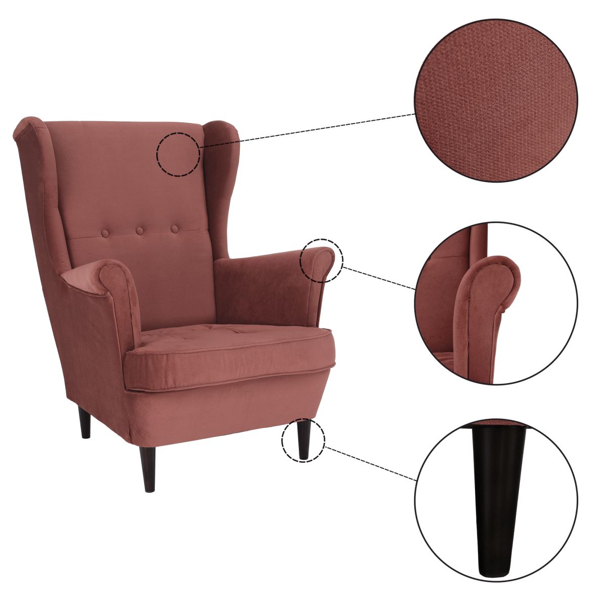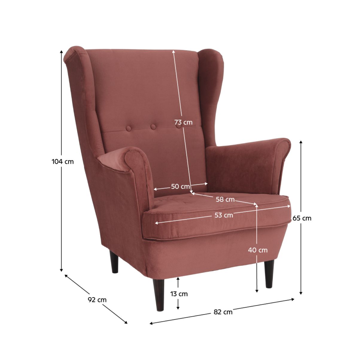 Material: material textil Kronos 29/lemn Rezistenţa materialului: 60 000 Martindale Culoare: roz antic/nuc Dimensiuni fotoliu (lxhxA): 82x104x92 cm Înălţime şezut: 40 cm Adâncime şezut: 58 cm Înălţimea spaţiului inferior de la podea: 13 cm Înălţimea spătarului: 73 cm Înălţimea de la sol până la cotieră: 65 cm Lăţimea scaunului: 53 cm Picioare din lemn Culoarea picioarelor poate varia Livrat nemontat
