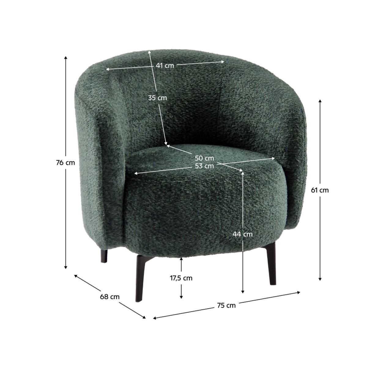 Material: ţesătură Abriamo Bouclé 09 Rezistenţa ţesăturii conform testului Martindale: 45.000 cicluri de frecare Dimensiuni (LxAxÎ): 75x68x76 cm Culoarea tapiţeriei: verde Umplutură: arcuri ondulate + spumă PUR T30 Material picioare: metal Culoarea picioarelor: neagră Înălţimea compartimentului inferior faţă de podea: 17,5 cm Înălţime spătar: 35 cm Lăţime spătar: 41 cm Înălţime scaun: 44 cm Adâncime scaun: 50 cm Lăţime scaun: 53 cm Înălţime cotieră: 61 cm Capacitate de încărcare: 120 kg De design Tapiţat integral ţesătură greu inflamabilă Livrat dezasamblat Posibilitatea de a alege dintre 6 nuanţe ale ţesăturii Abriamo Bouclé la preţul de 1.135 Lei. Pentru comenzi personalizate este necesară plata unui avans de 10% din suma totală. După achitarea avansului, comanda dumneavoastră va intra în producţie. Termenul de livrare este de 6-8 săptămâni.