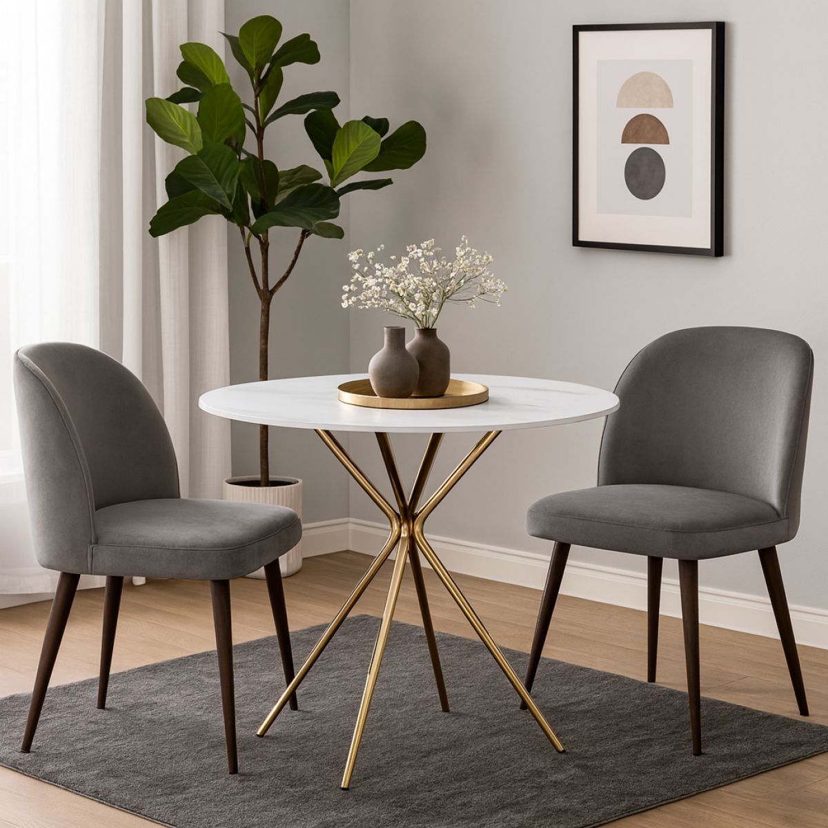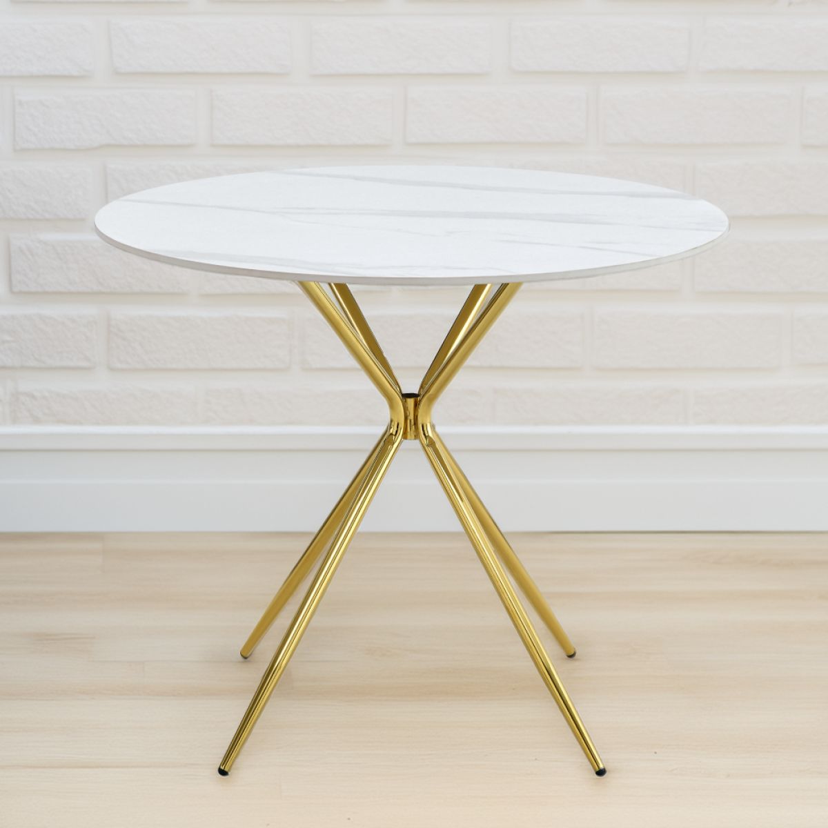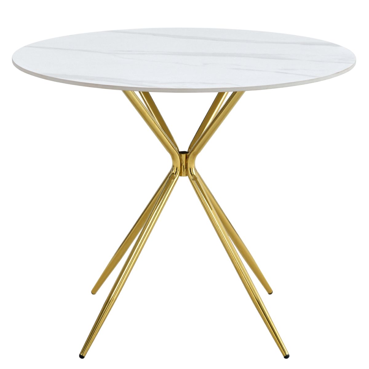 Material: placă de piatră/metal Culoare: marmură albă/gold crom auriu Dimensiuni (diametru x h): 90x75 cm Portanţa: 50 kg Grosimea blatului de piatră: 1,8 cm Rotund Pe picioare Practic Design modern Fără funcţia de extindere Se livrează dezasamblat