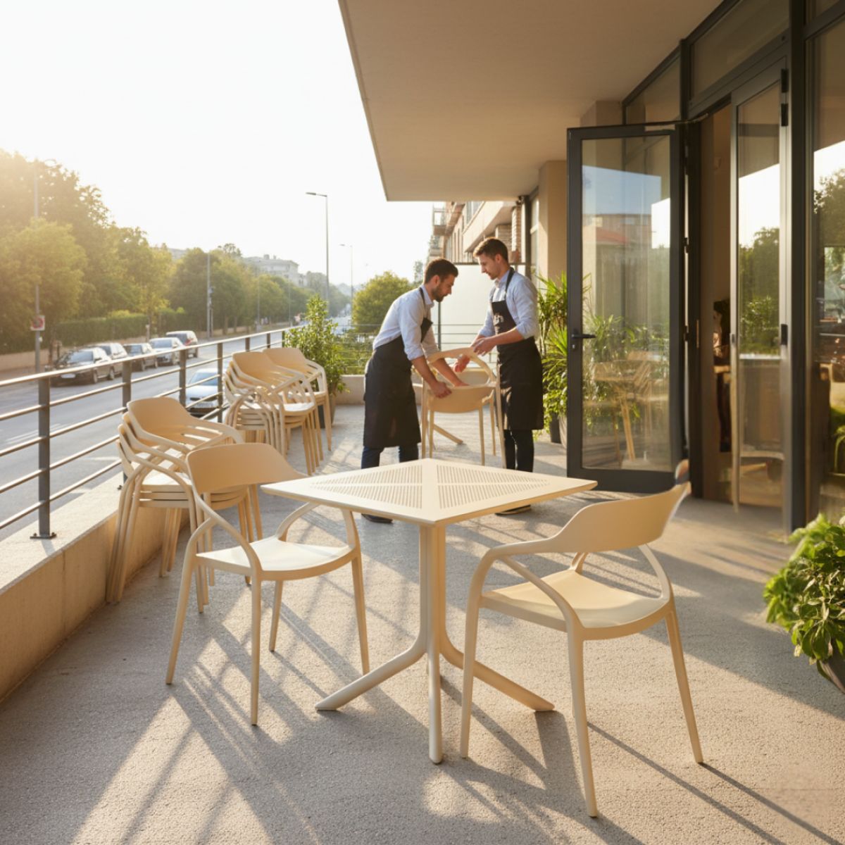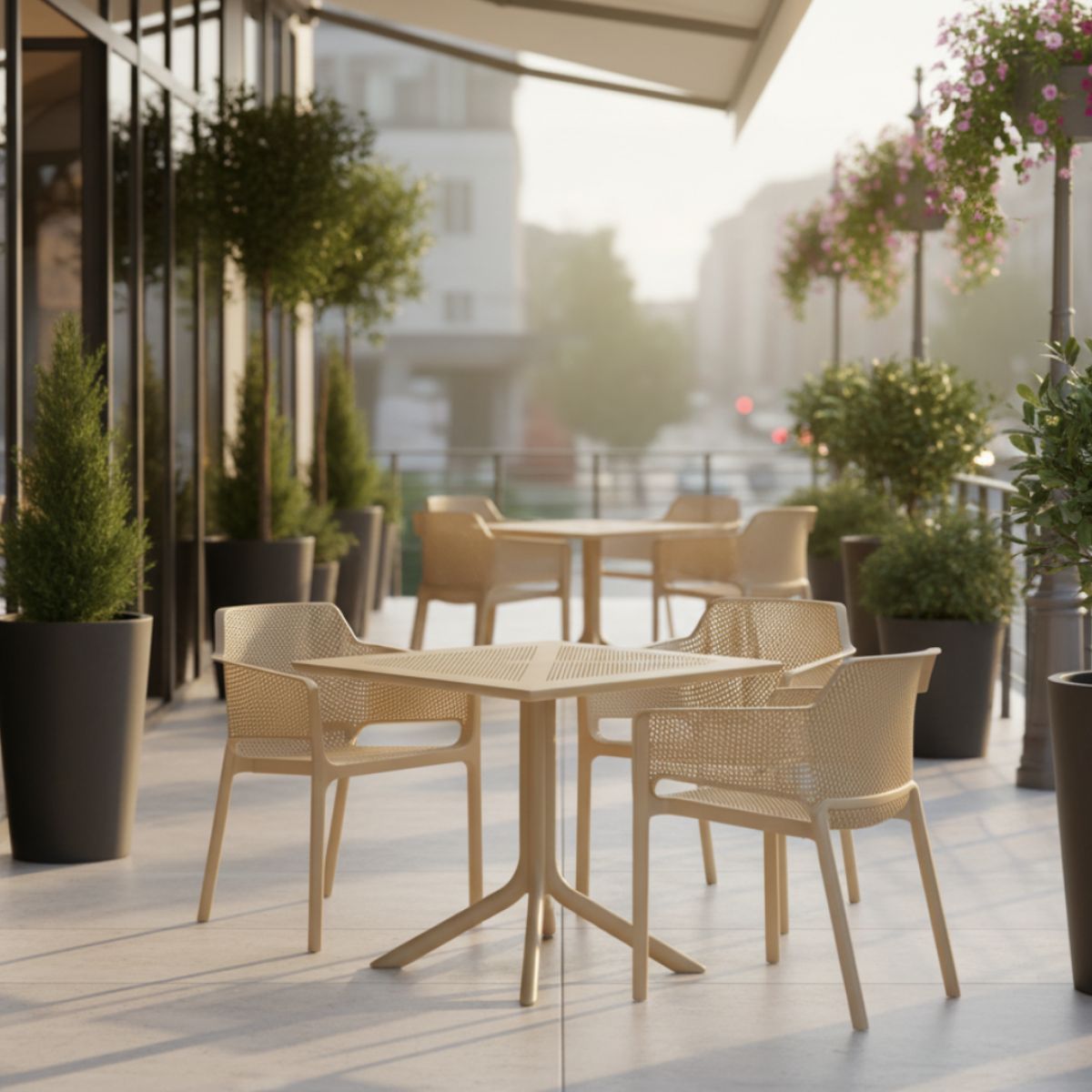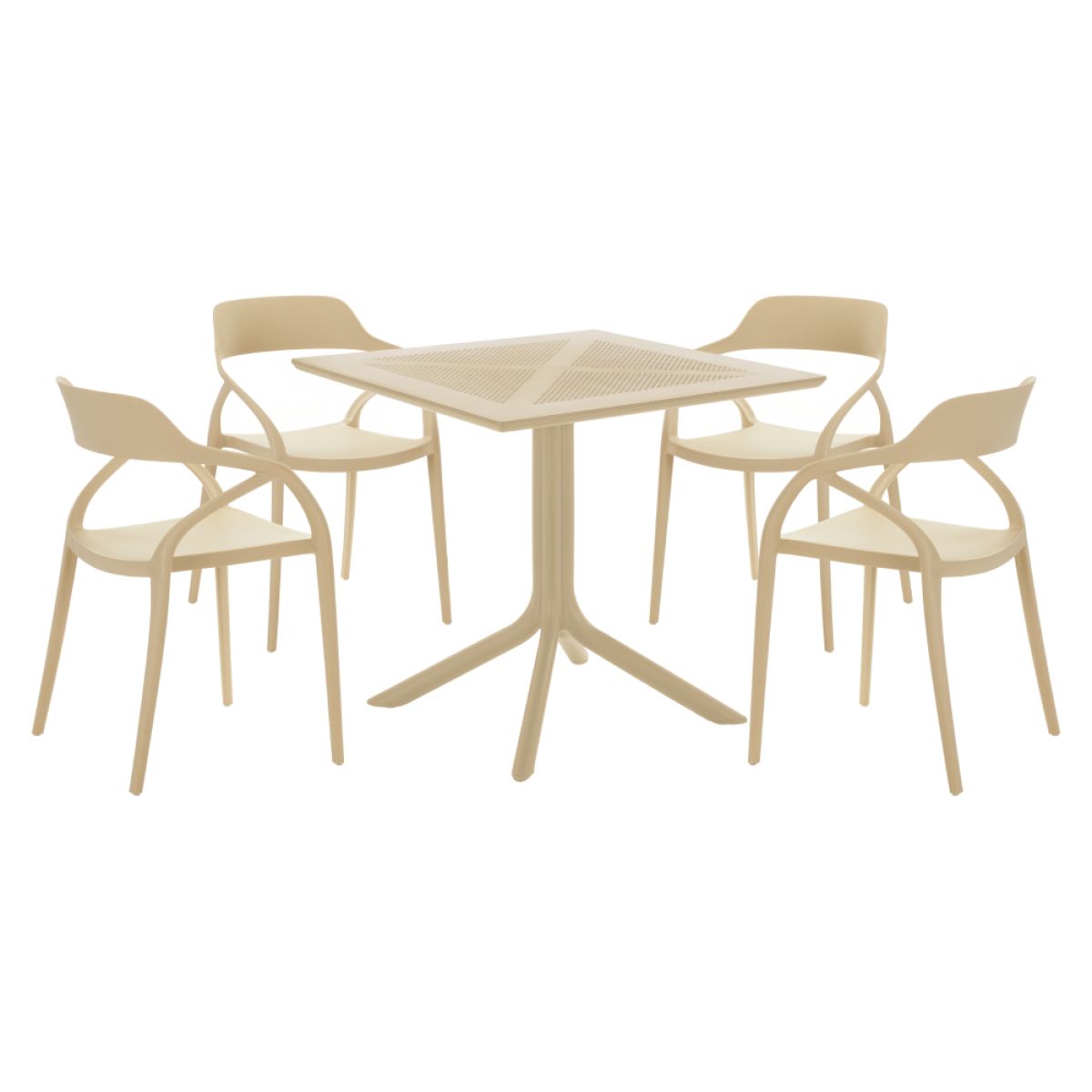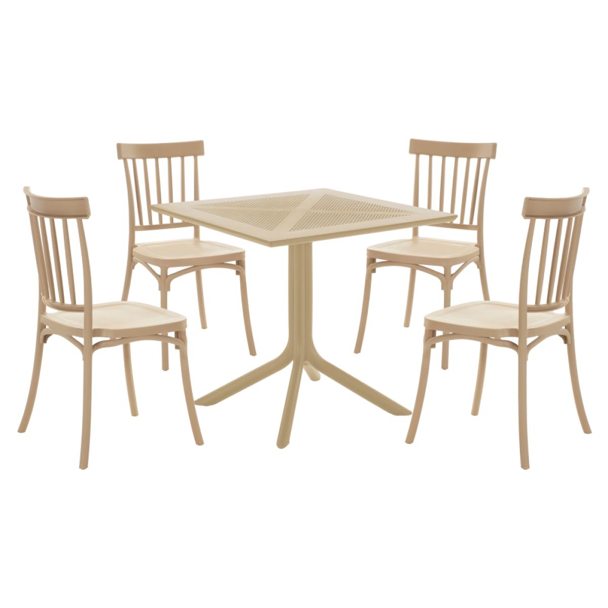 Material: plastic Culoare: gri-maro Taupe Dimensiuni (LxAxÎ): 79,5x79,5x74,5 cm Capacitate de încărcare: 50 kg Greutate: 10,5 kg Simplă Practică Pe picioare Masă de dining / grădină Potrivită pentru interior şi exterior Masă de dining pentru 4 persoane Livrată dezasamblată