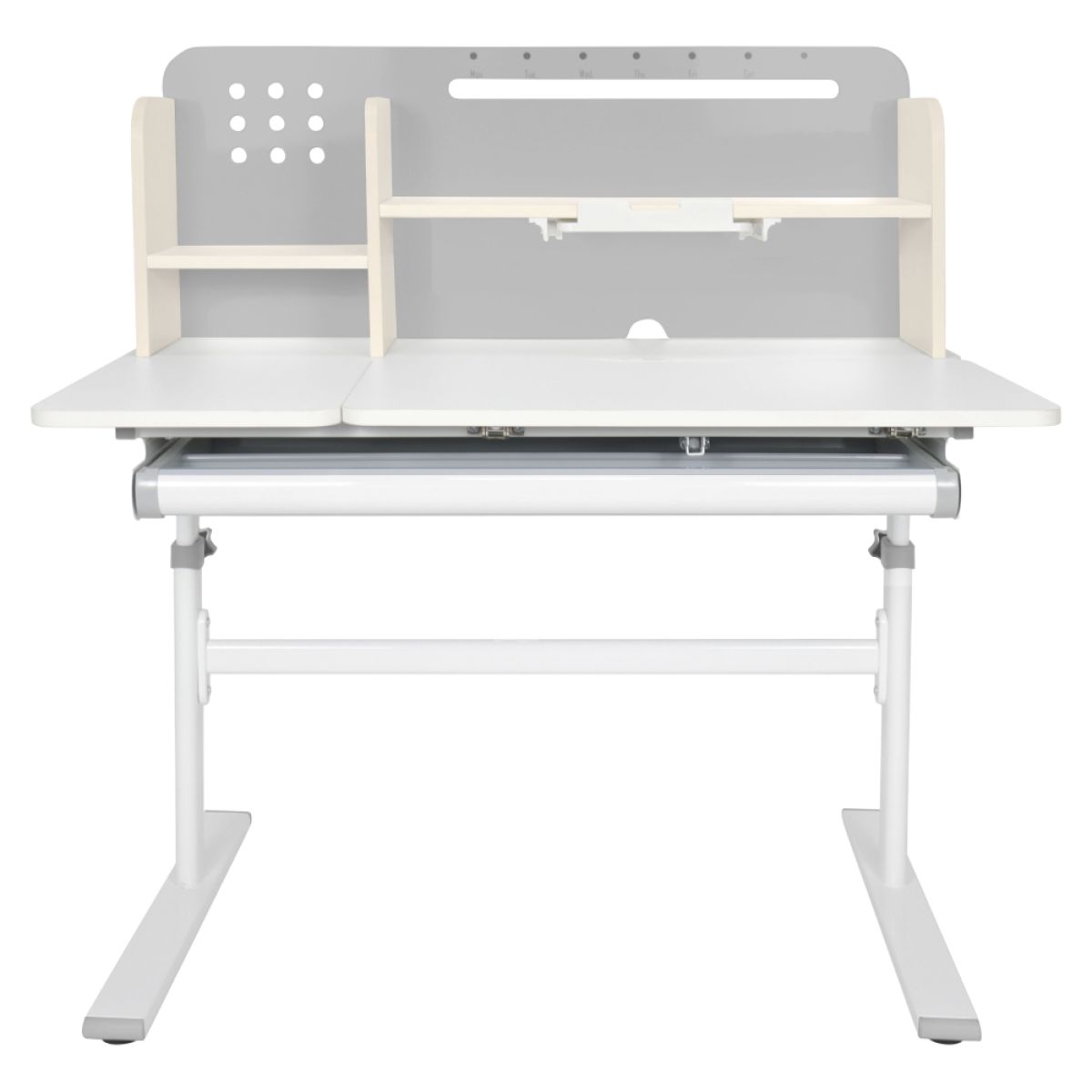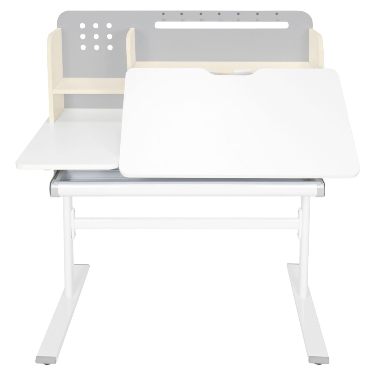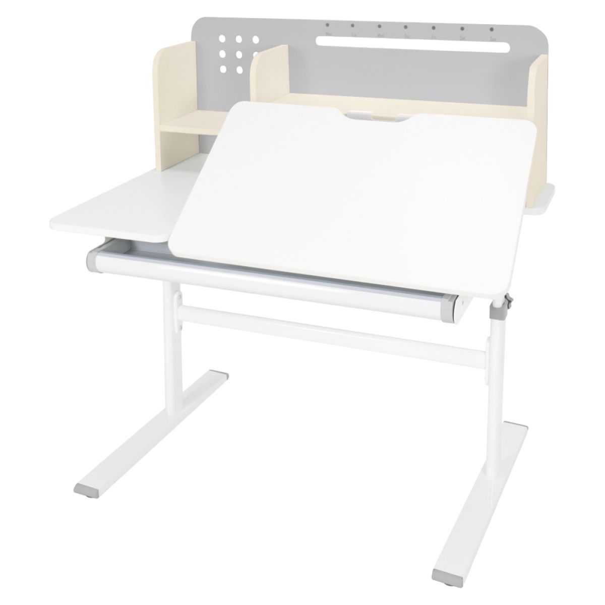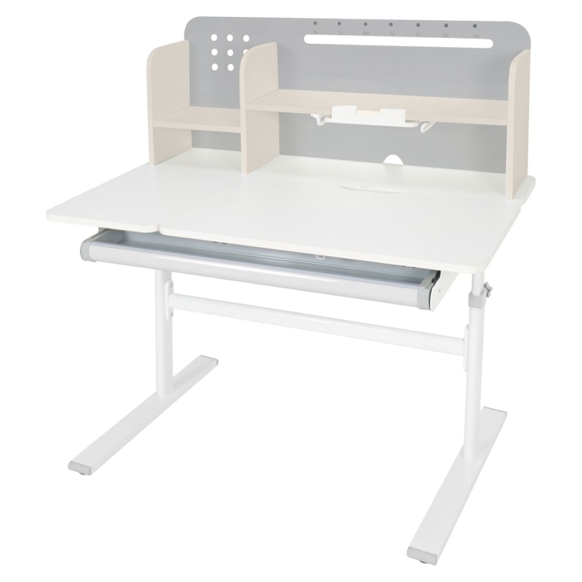 Material: MDF înfoliat / plastic / metal Grosimea materialului MDF: 1,5 cm Culoare: gri/alb Blatul mesei este cu margini ABS Dimensiunile mesei (lxAxh): 100x60x91,4-111,4 cm Dimensiunile bazei (lxA): 89x61 cm Adâncimea blatului mesei: 40 cm Înălţimea blatului de lucru: 55-75 cm Înclinare reglabilă a blatului de lucru Înclinare a blatului de lucru: 0-40 Lăţime reglabilă a blatului: 70 cm Portanţă masă: 70 kg Înălţime reglabilă a mesei Reglarea manuală a înălţimii mesei cu o manivelă Posibilitatea de a monta mânerul pe partea dreaptă sau stângă Înălţimea mesei şi înclinarea suprafeţei de lucru pot fi reglate cu ajutorul pistonului de gaz şi al pârghiei Sertar spaţios cu compartimente Portanţa sertarului: 10 kg Panoul din spate include poliţe, un suport pentru cărţi şi un orificiu pentru trecerea cablurilor Dimensiuni suport pentru cărţi (lxh): 23,3x12 cm Bandă magnetică cu marcaj de zi Potrivit de la 3 la 14 ani Pentru copii şi adolescenţi la o înălţime de 100 - 175 cm Livrat dezasamblat