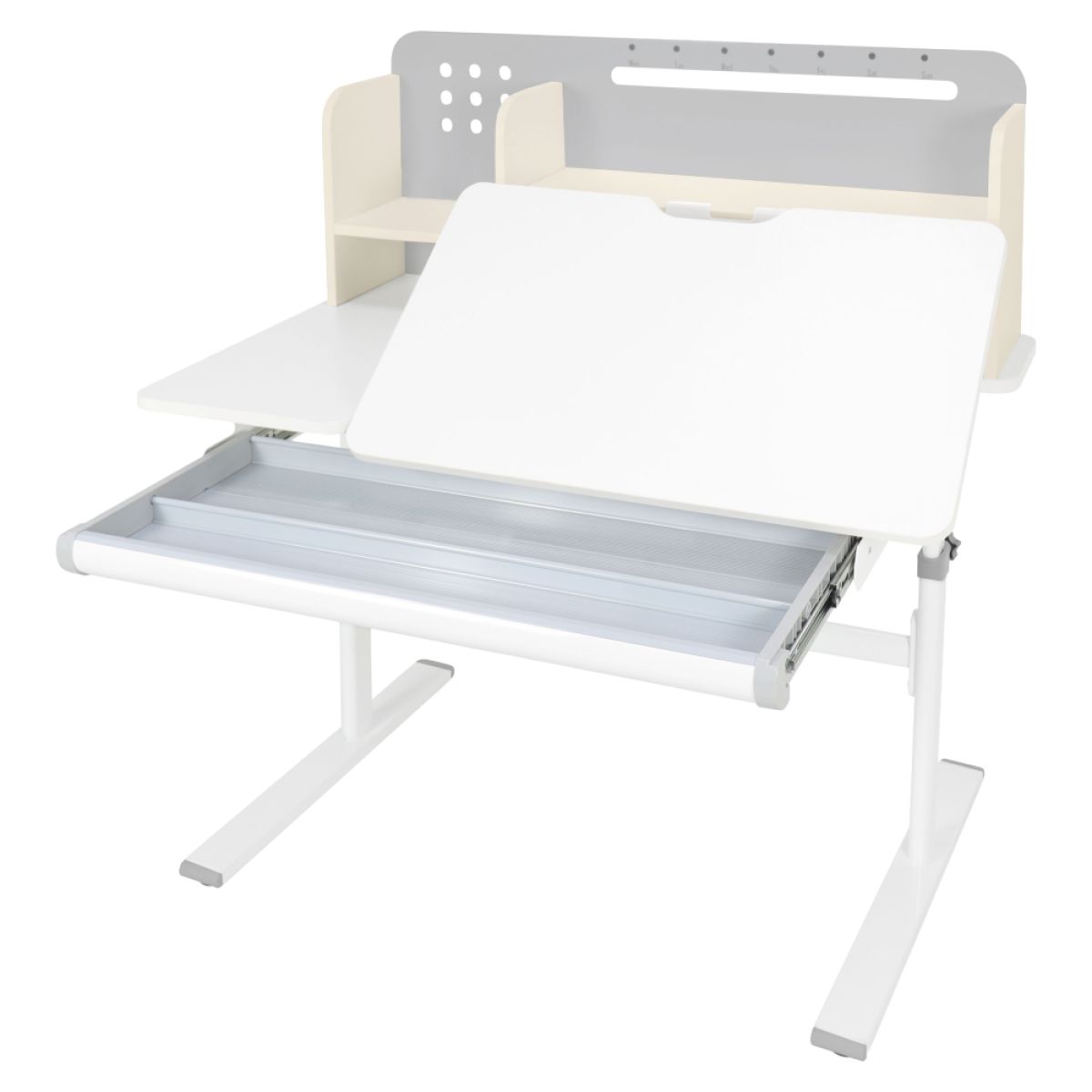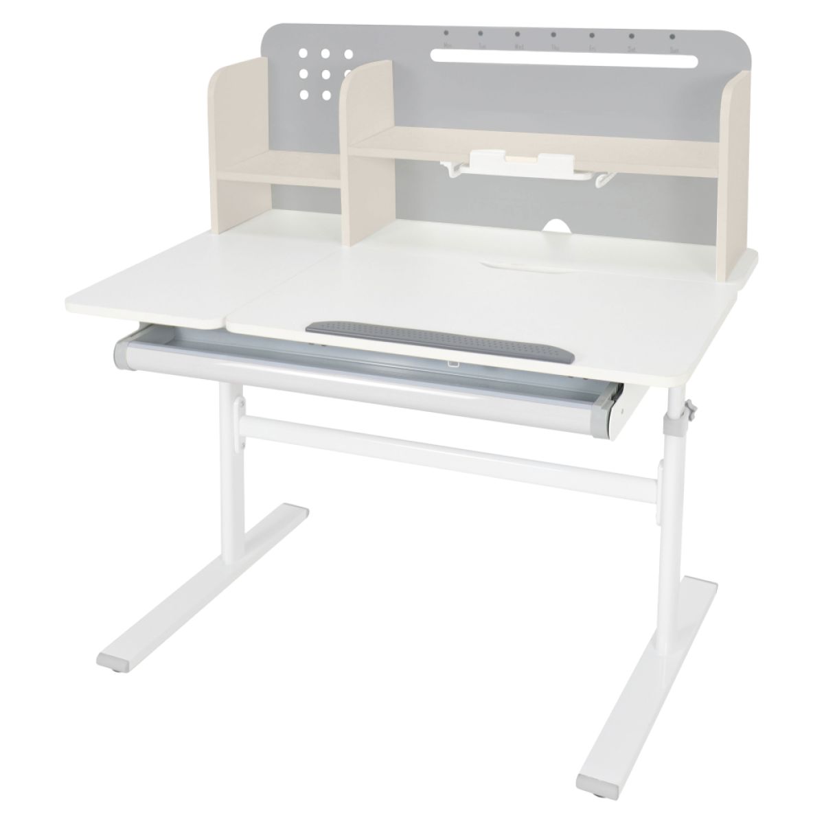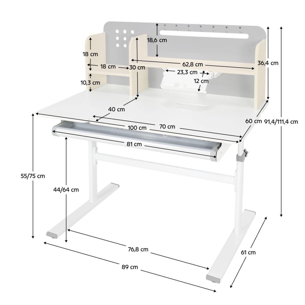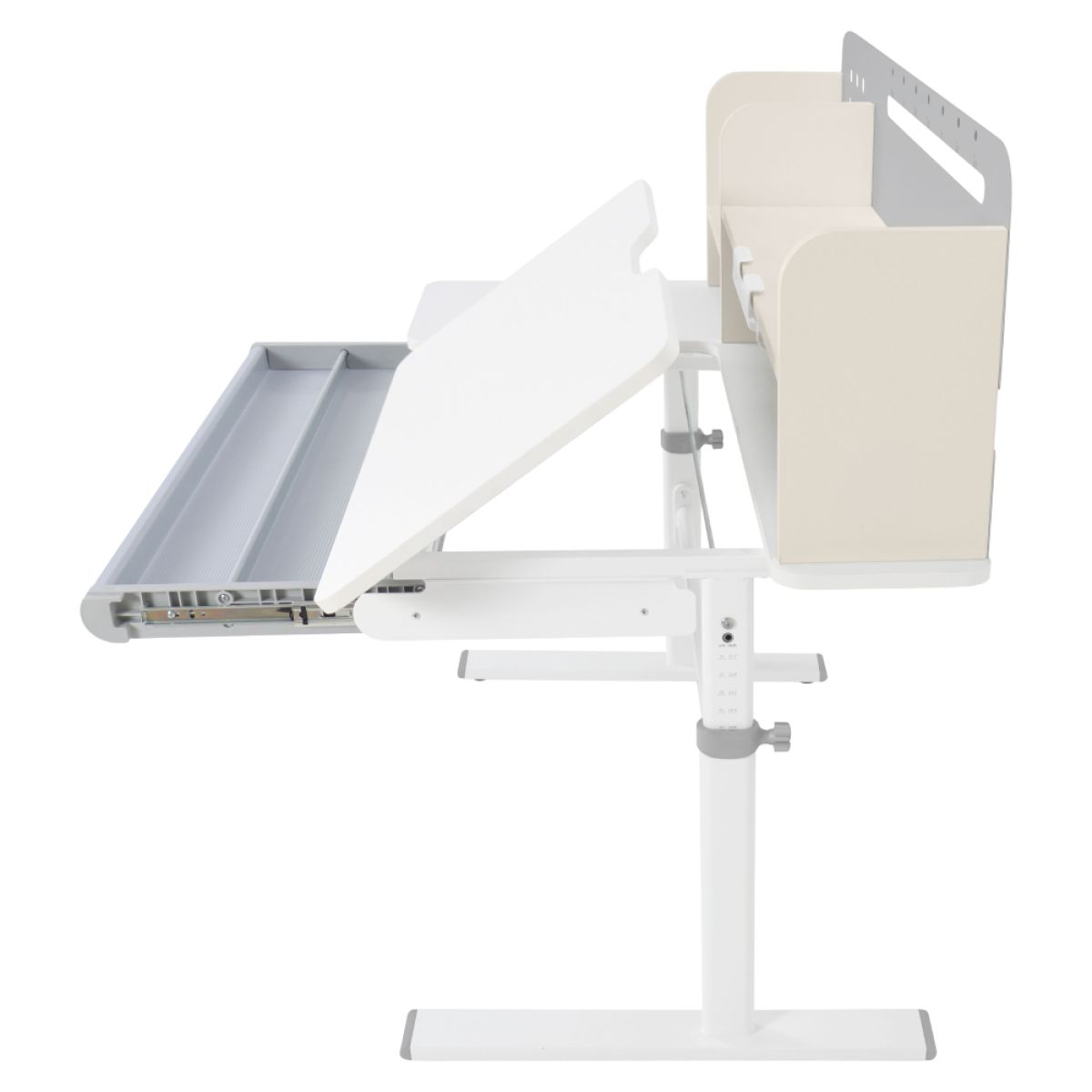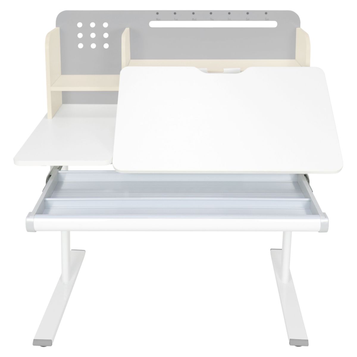 Material: MDF înfoliat / plastic / metal Grosimea materialului MDF: 1,5 cm Culoare: gri/alb Blatul mesei este cu margini ABS Dimensiunile mesei (lxAxh): 100x60x91,4-111,4 cm Dimensiunile bazei (lxA): 89x61 cm Adâncimea blatului mesei: 40 cm Înălţimea blatului de lucru: 55-75 cm Înclinare reglabilă a blatului de lucru Înclinare a blatului de lucru: 0-40 Lăţime reglabilă a blatului: 70 cm Portanţă masă: 70 kg Înălţime reglabilă a mesei Reglarea manuală a înălţimii mesei cu o manivelă Posibilitatea de a monta mânerul pe partea dreaptă sau stângă Înălţimea mesei şi înclinarea suprafeţei de lucru pot fi reglate cu ajutorul pistonului de gaz şi al pârghiei Sertar spaţios cu compartimente Portanţa sertarului: 10 kg Panoul din spate include poliţe, un suport pentru cărţi şi un orificiu pentru trecerea cablurilor Dimensiuni suport pentru cărţi (lxh): 23,3x12 cm Bandă magnetică cu marcaj de zi Potrivit de la 3 la 14 ani Pentru copii şi adolescenţi la o înălţime de 100 - 175 cm Livrat dezasamblat