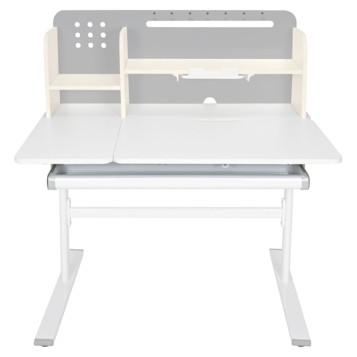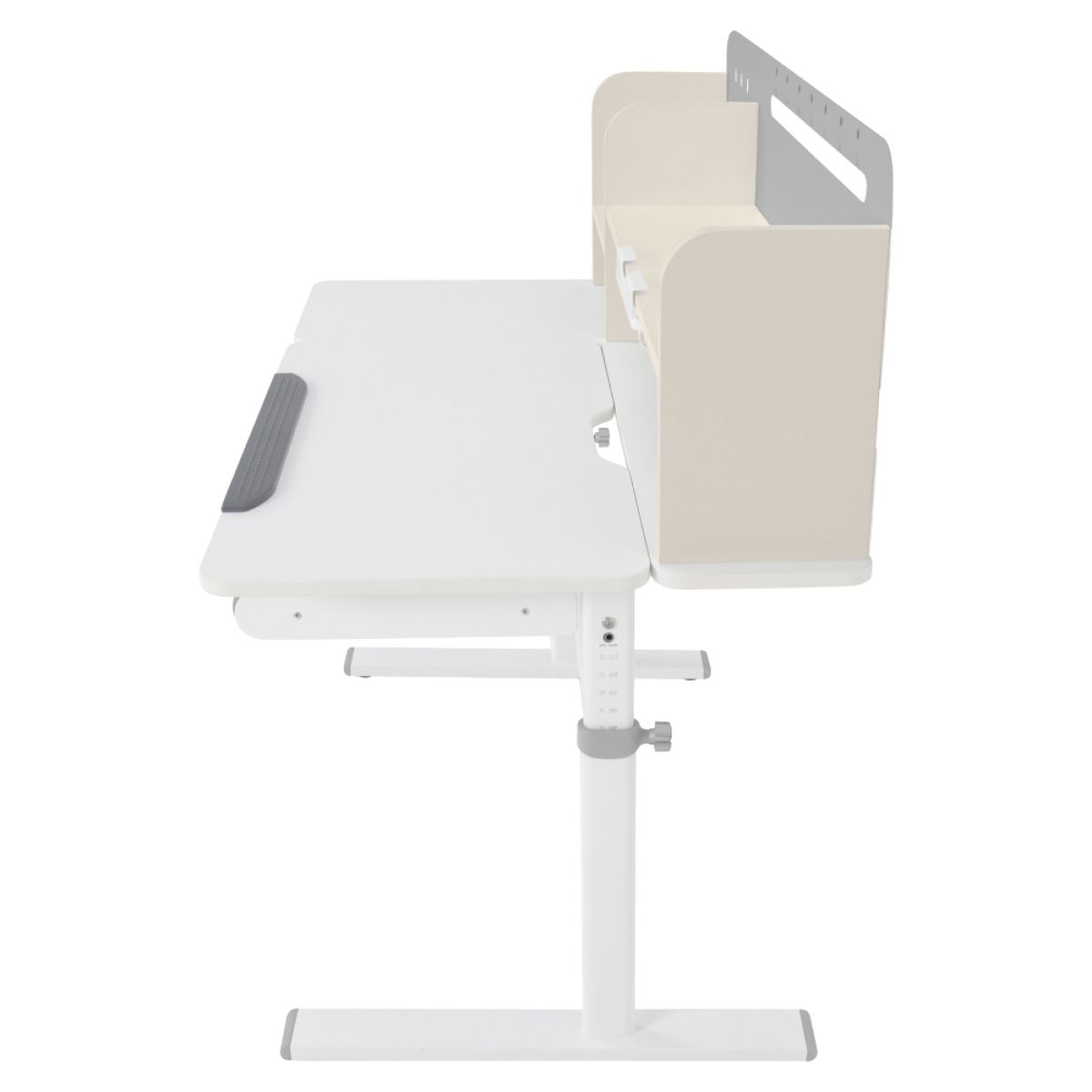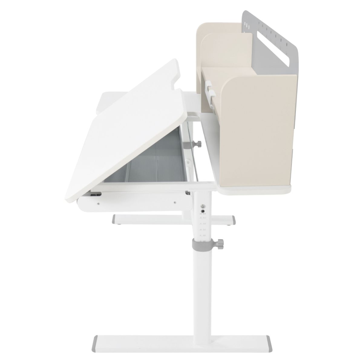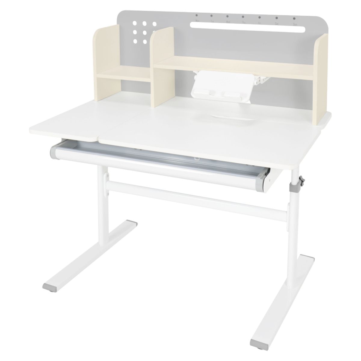 Material: MDF înfoliat / plastic / metal Grosimea materialului MDF: 1,5 cm Culoare: gri/alb Blatul mesei este cu margini ABS Dimensiunile mesei (lxAxh): 100x60x91,4-111,4 cm Dimensiunile bazei (lxA): 89x61 cm Adâncimea blatului mesei: 40 cm Înălţimea blatului de lucru: 55-75 cm Înclinare reglabilă a blatului de lucru Înclinare a blatului de lucru: 0-40 Lăţime reglabilă a blatului: 70 cm Portanţă masă: 70 kg Înălţime reglabilă a mesei Reglarea manuală a înălţimii mesei cu o manivelă Posibilitatea de a monta mânerul pe partea dreaptă sau stângă Înălţimea mesei şi înclinarea suprafeţei de lucru pot fi reglate cu ajutorul pistonului de gaz şi al pârghiei Sertar spaţios cu compartimente Portanţa sertarului: 10 kg Panoul din spate include poliţe, un suport pentru cărţi şi un orificiu pentru trecerea cablurilor Dimensiuni suport pentru cărţi (lxh): 23,3x12 cm Bandă magnetică cu marcaj de zi Potrivit de la 3 la 14 ani Pentru copii şi adolescenţi la o înălţime de 100 - 175 cm Livrat dezasamblat