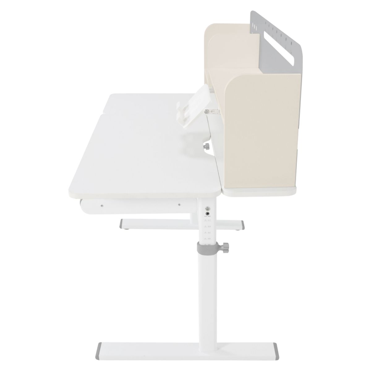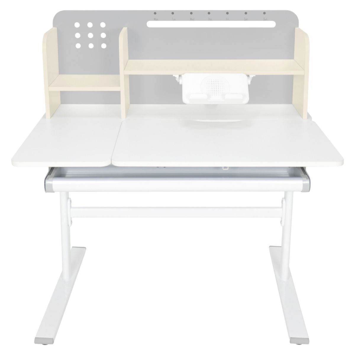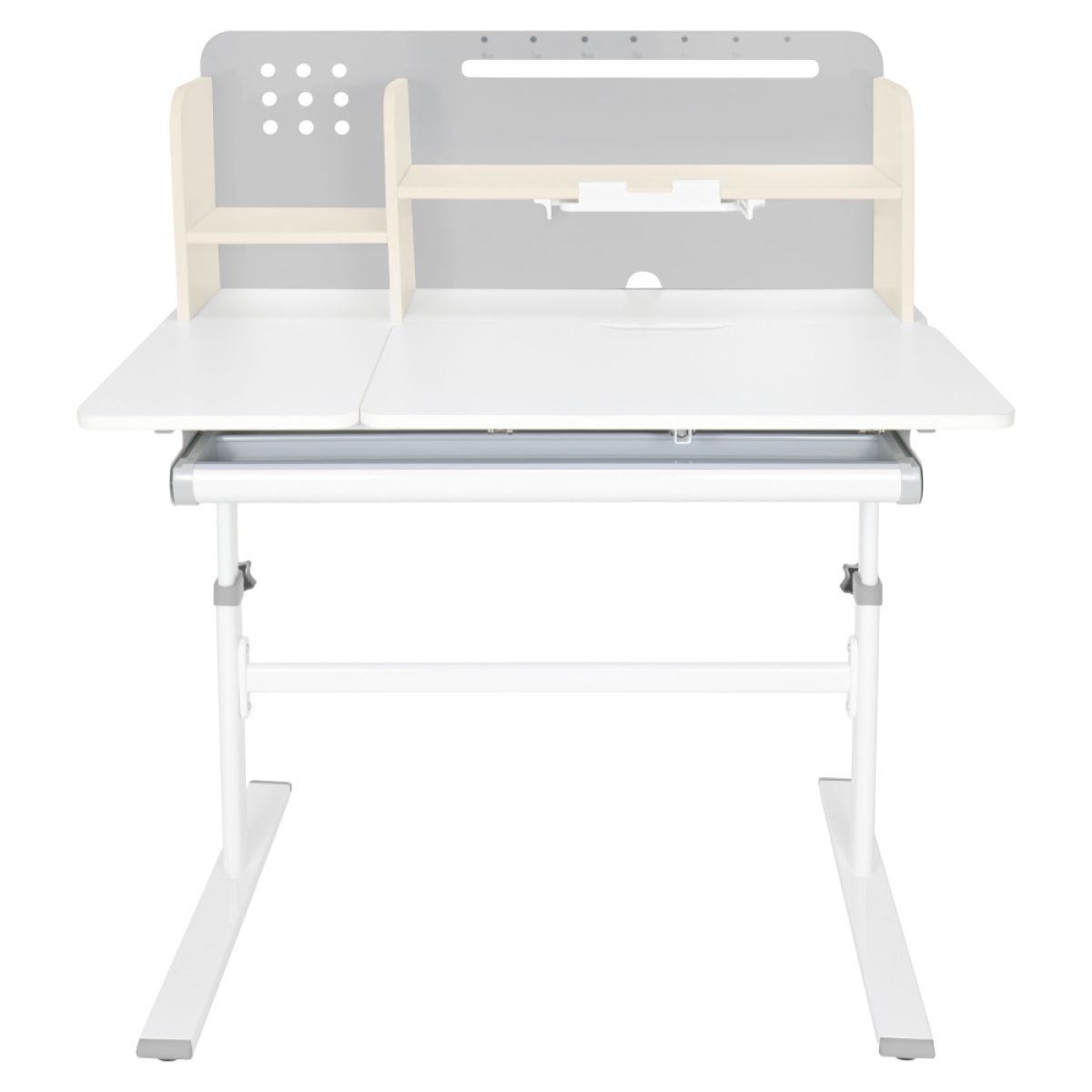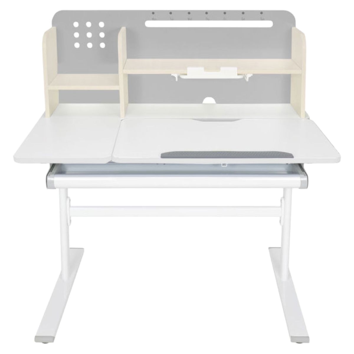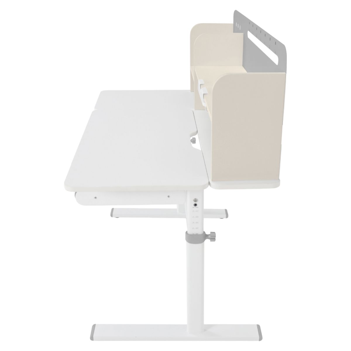 Material: MDF înfoliat / plastic / metal Grosimea materialului MDF: 1,5 cm Culoare: gri/alb Blatul mesei este cu margini ABS Dimensiunile mesei (lxAxh): 100x60x91,4-111,4 cm Dimensiunile bazei (lxA): 89x61 cm Adâncimea blatului mesei: 40 cm Înălţimea blatului de lucru: 55-75 cm Înclinare reglabilă a blatului de lucru Înclinare a blatului de lucru: 0-40 Lăţime reglabilă a blatului: 70 cm Portanţă masă: 70 kg Înălţime reglabilă a mesei Reglarea manuală a înălţimii mesei cu o manivelă Posibilitatea de a monta mânerul pe partea dreaptă sau stângă Înălţimea mesei şi înclinarea suprafeţei de lucru pot fi reglate cu ajutorul pistonului de gaz şi al pârghiei Sertar spaţios cu compartimente Portanţa sertarului: 10 kg Panoul din spate include poliţe, un suport pentru cărţi şi un orificiu pentru trecerea cablurilor Dimensiuni suport pentru cărţi (lxh): 23,3x12 cm Bandă magnetică cu marcaj de zi Potrivit de la 3 la 14 ani Pentru copii şi adolescenţi la o înălţime de 100 - 175 cm Livrat dezasamblat