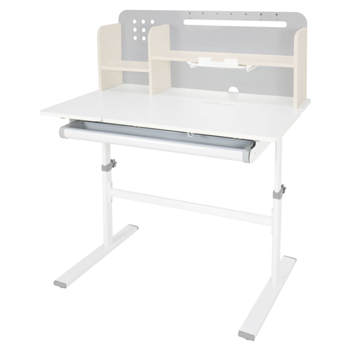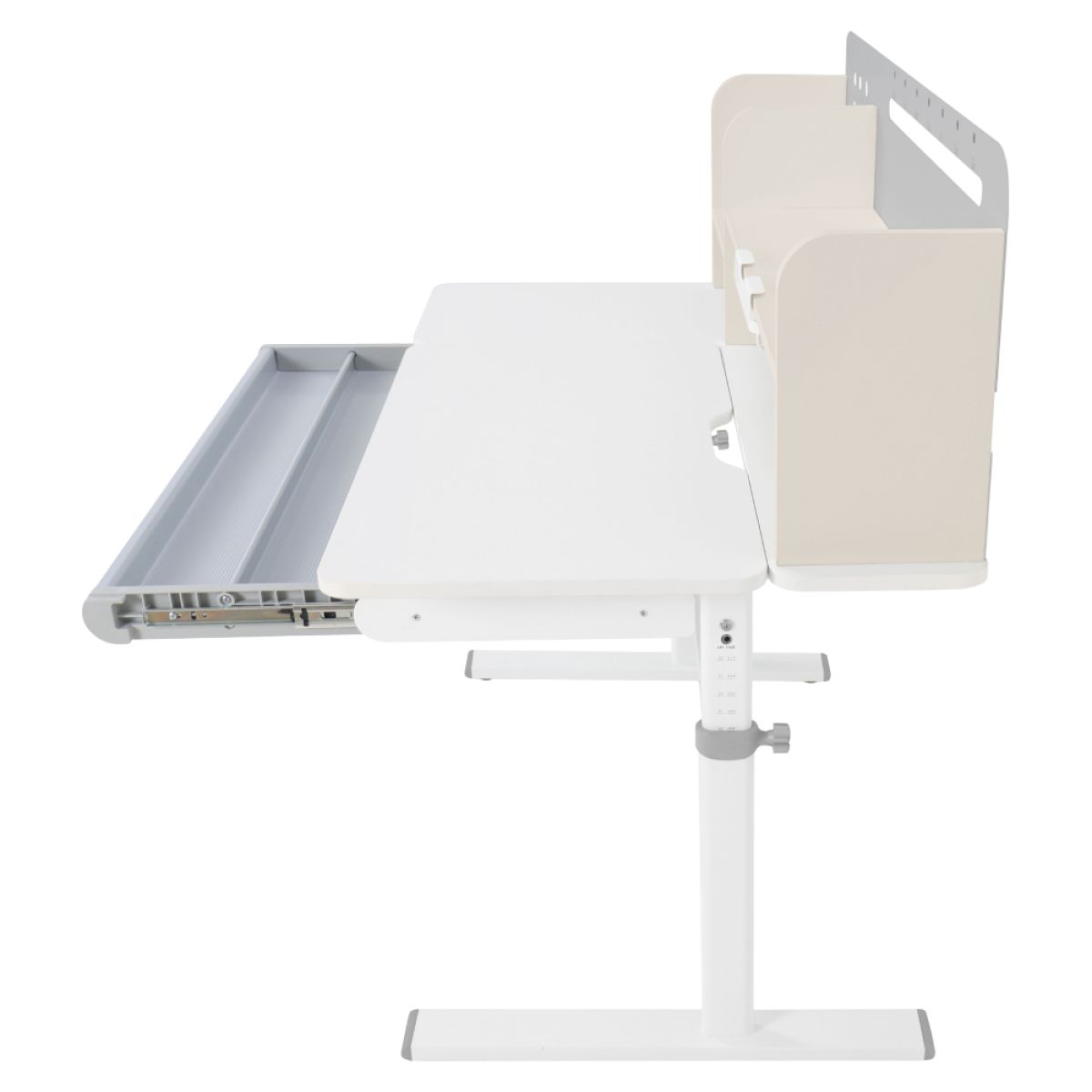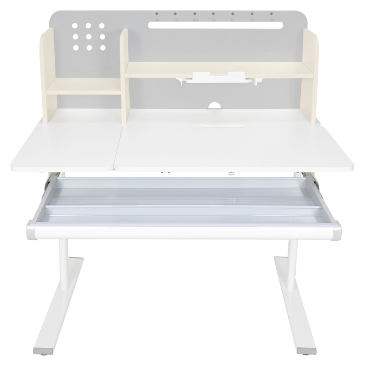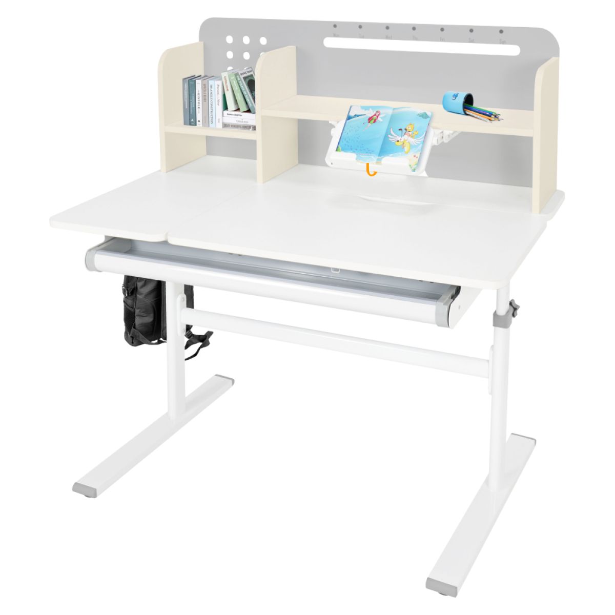 Material: MDF înfoliat / plastic / metal Grosimea materialului MDF: 1,5 cm Culoare: gri/alb Blatul mesei este cu margini ABS Dimensiunile mesei (lxAxh): 100x60x91,4-111,4 cm Dimensiunile bazei (lxA): 89x61 cm Adâncimea blatului mesei: 40 cm Înălţimea blatului de lucru: 55-75 cm Înclinare reglabilă a blatului de lucru Înclinare a blatului de lucru: 0-40 Lăţime reglabilă a blatului: 70 cm Portanţă masă: 70 kg Înălţime reglabilă a mesei Reglarea manuală a înălţimii mesei cu o manivelă Posibilitatea de a monta mânerul pe partea dreaptă sau stângă Înălţimea mesei şi înclinarea suprafeţei de lucru pot fi reglate cu ajutorul pistonului de gaz şi al pârghiei Sertar spaţios cu compartimente Portanţa sertarului: 10 kg Panoul din spate include poliţe, un suport pentru cărţi şi un orificiu pentru trecerea cablurilor Dimensiuni suport pentru cărţi (lxh): 23,3x12 cm Bandă magnetică cu marcaj de zi Potrivit de la 3 la 14 ani Pentru copii şi adolescenţi la o înălţime de 100 - 175 cm Livrat dezasamblat