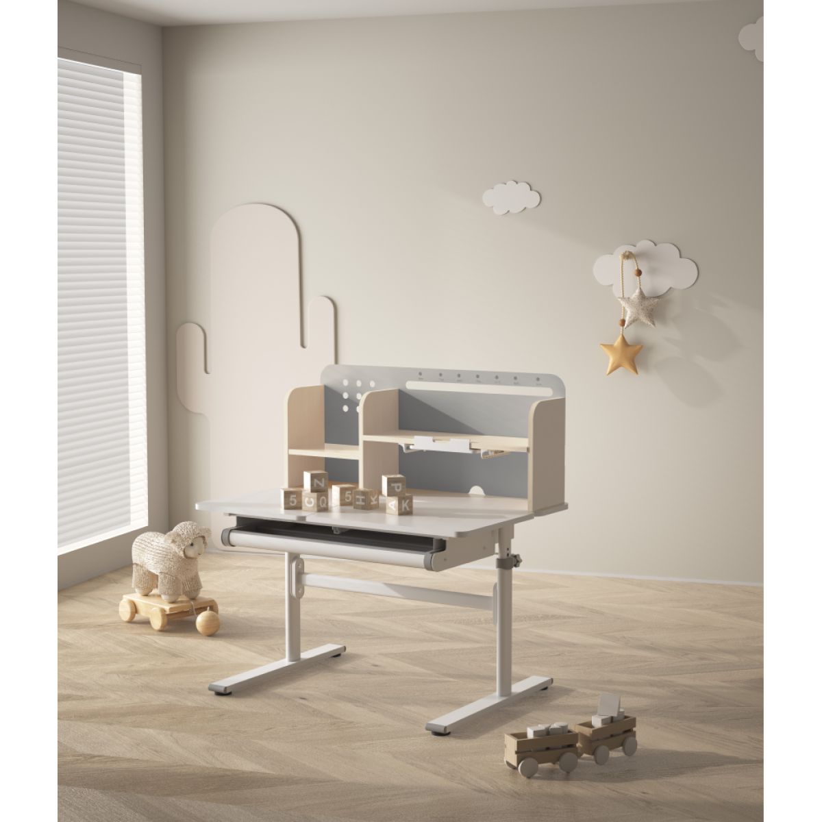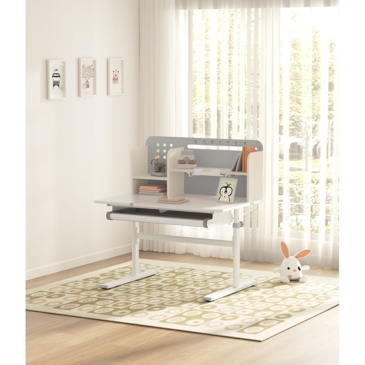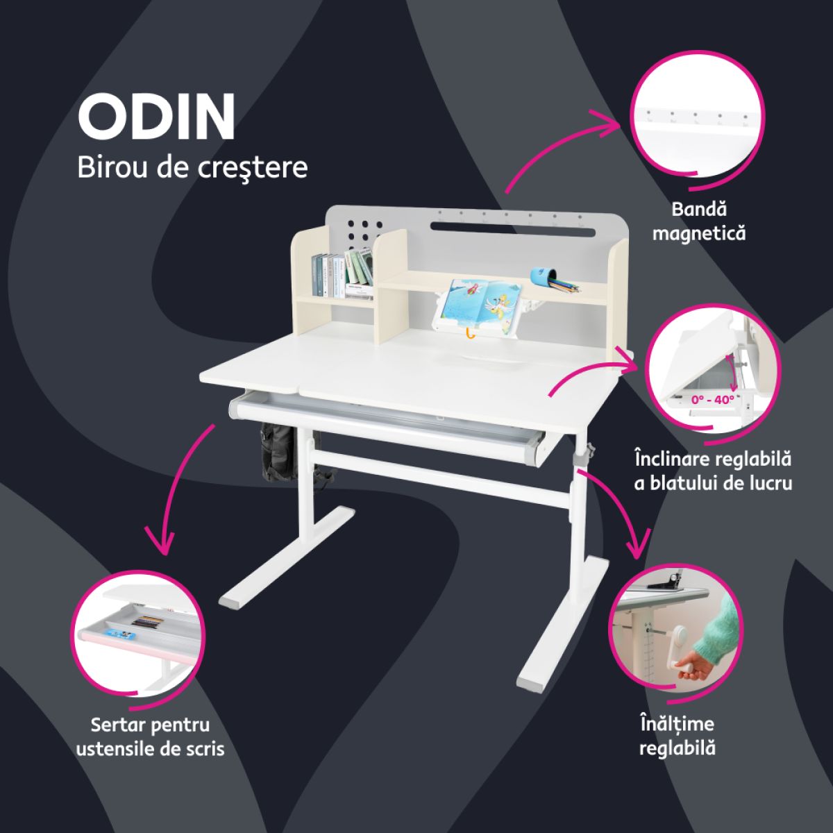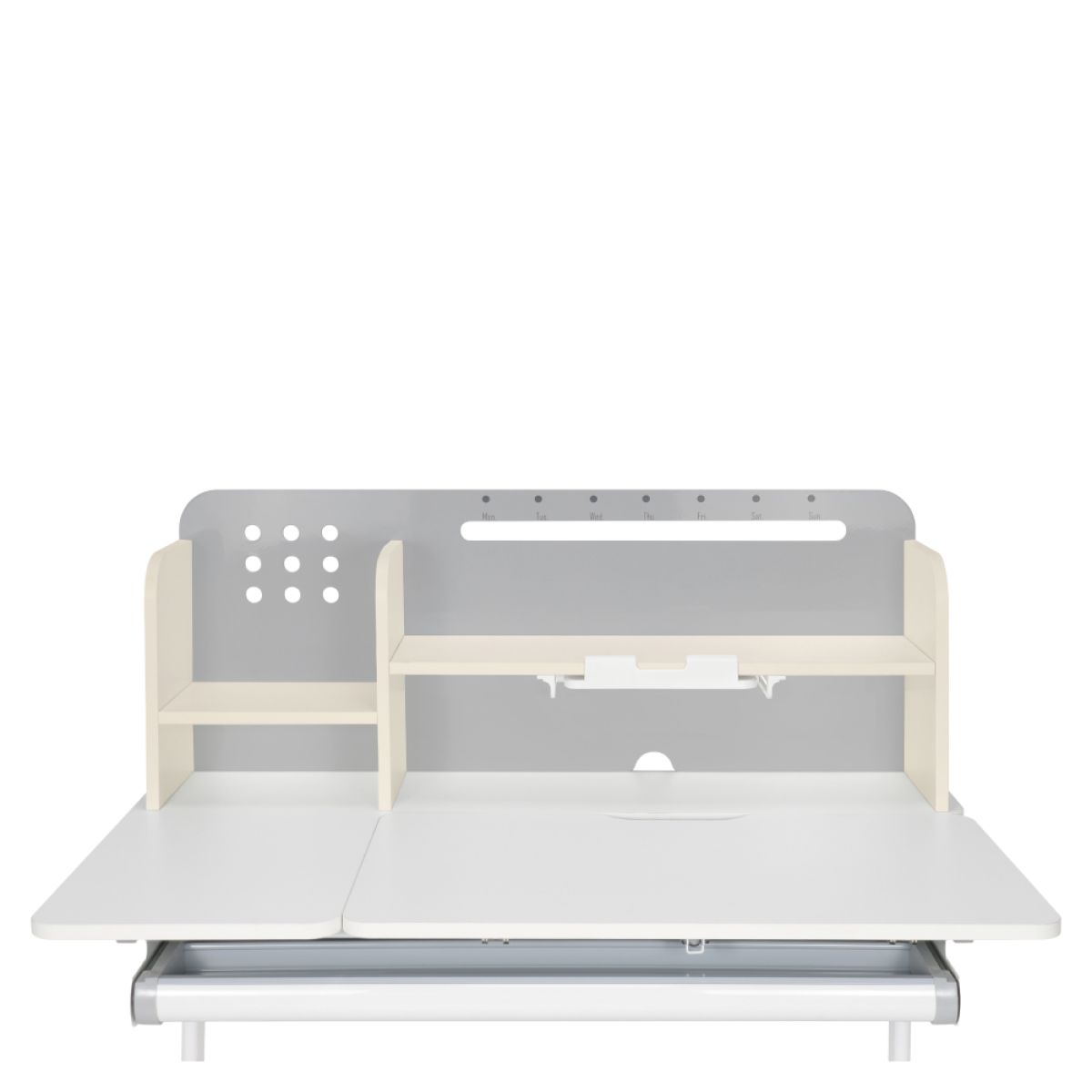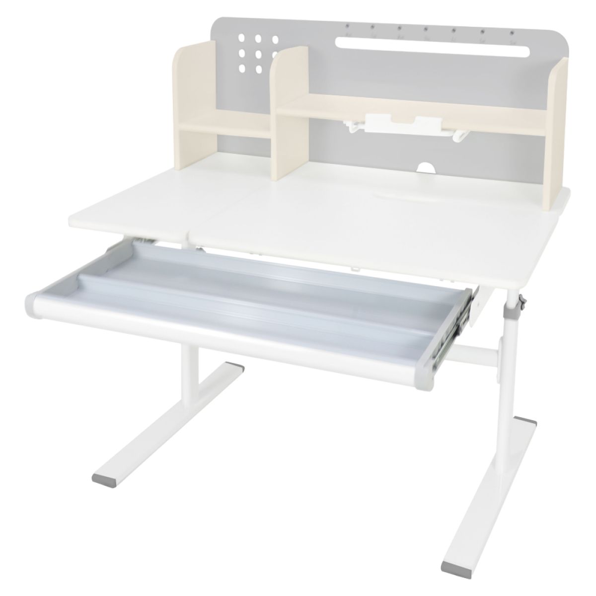 Material: MDF înfoliat / plastic / metal Grosimea materialului MDF: 1,5 cm Culoare: gri/alb Blatul mesei este cu margini ABS Dimensiunile mesei (lxAxh): 100x60x91,4-111,4 cm Dimensiunile bazei (lxA): 89x61 cm Adâncimea blatului mesei: 40 cm Înălţimea blatului de lucru: 55-75 cm Înclinare reglabilă a blatului de lucru Înclinare a blatului de lucru: 0-40 Lăţime reglabilă a blatului: 70 cm Portanţă masă: 70 kg Înălţime reglabilă a mesei Reglarea manuală a înălţimii mesei cu o manivelă Posibilitatea de a monta mânerul pe partea dreaptă sau stângă Înălţimea mesei şi înclinarea suprafeţei de lucru pot fi reglate cu ajutorul pistonului de gaz şi al pârghiei Sertar spaţios cu compartimente Portanţa sertarului: 10 kg Panoul din spate include poliţe, un suport pentru cărţi şi un orificiu pentru trecerea cablurilor Dimensiuni suport pentru cărţi (lxh): 23,3x12 cm Bandă magnetică cu marcaj de zi Potrivit de la 3 la 14 ani Pentru copii şi adolescenţi la o înălţime de 100 - 175 cm Livrat dezasamblat