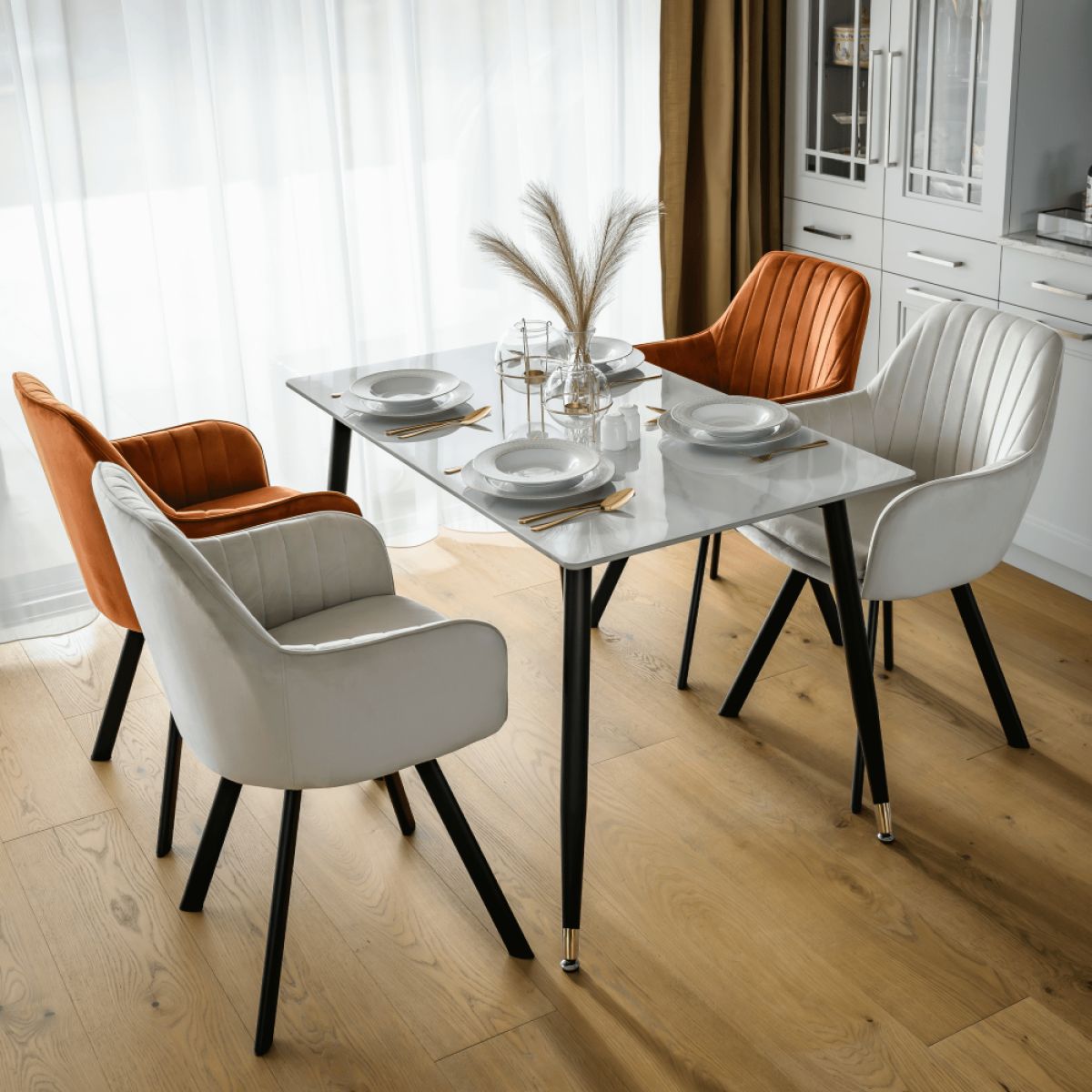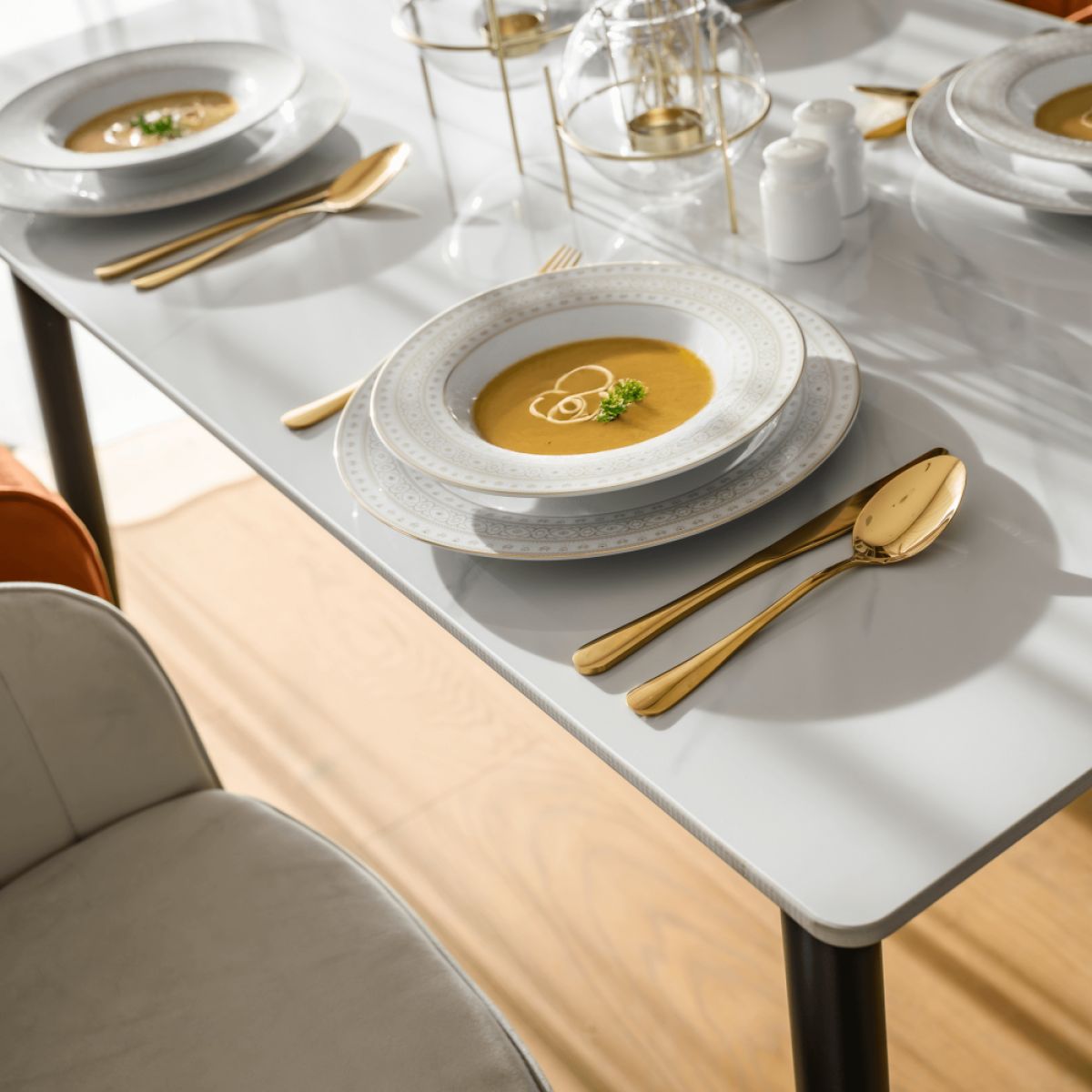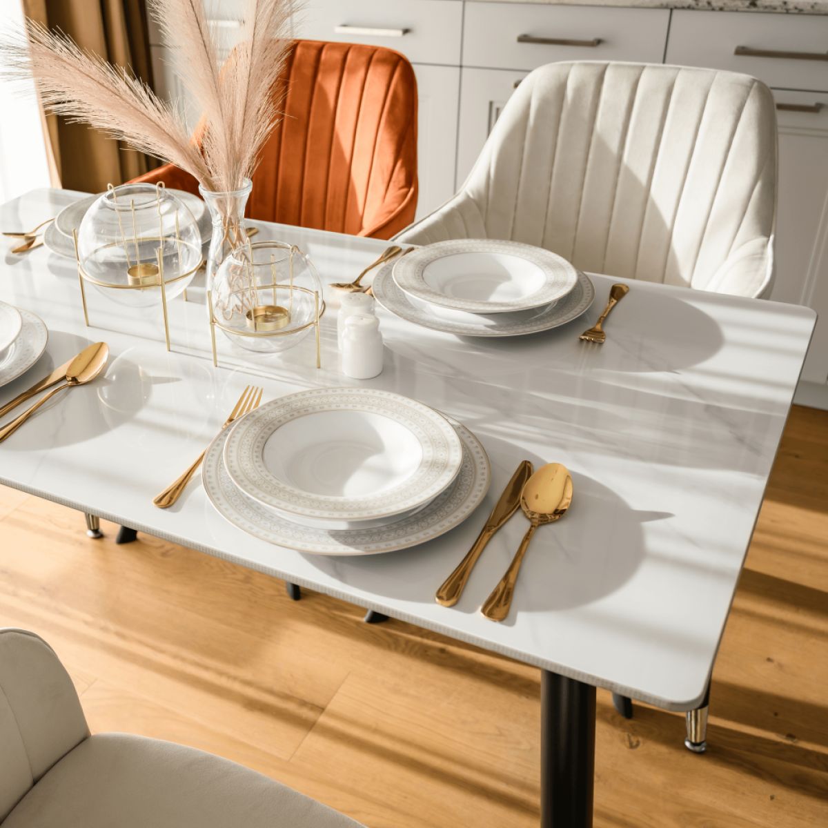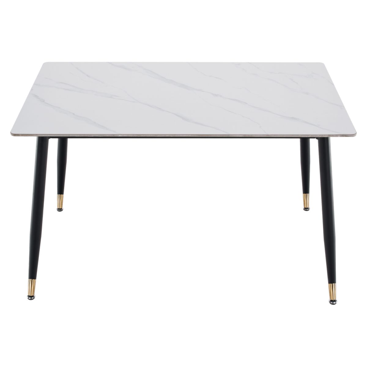 Material: piatră/oţel Culoare: marmură albă/neagră/aurie Dimensiuni (Lxlxh): 121x71x73 cm Grosimea blatului de piatră: 1,07 cm Portanţă: 50 kg Practic Design modern Potrivit pentru 4-6 persoane Livrat dezasamblat