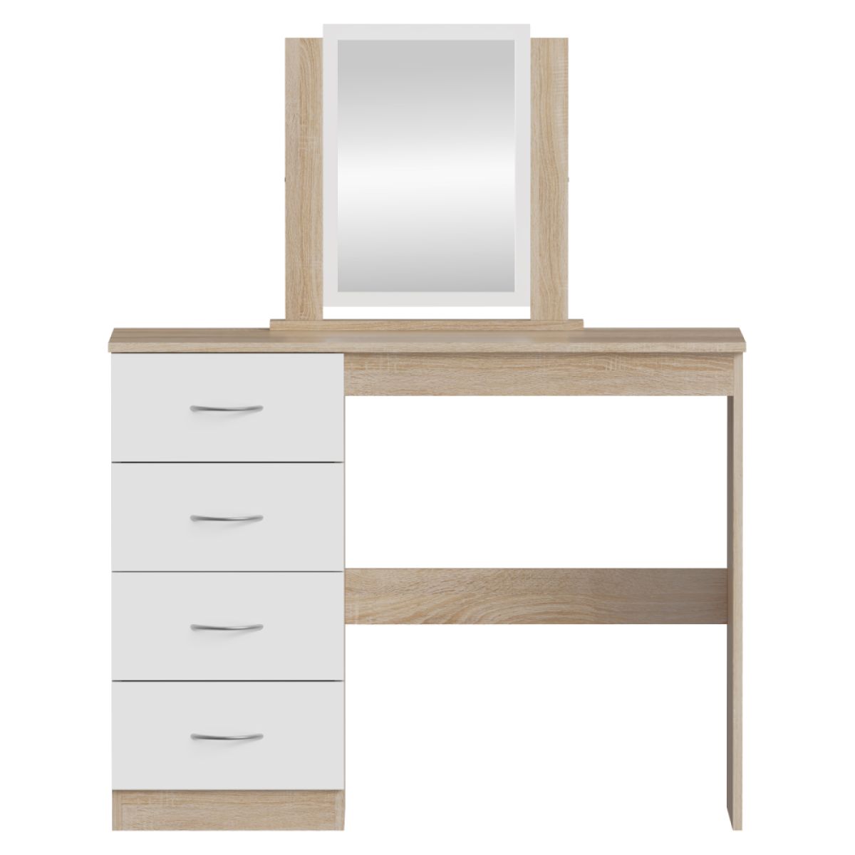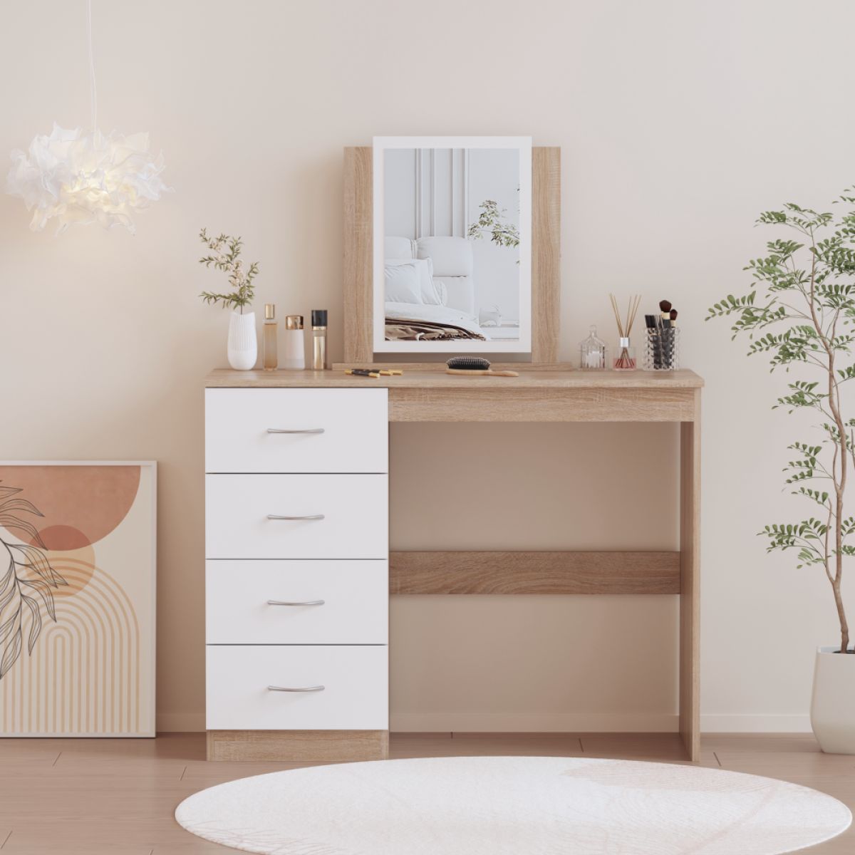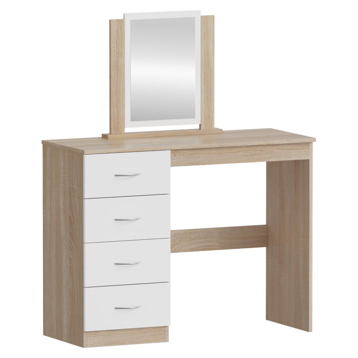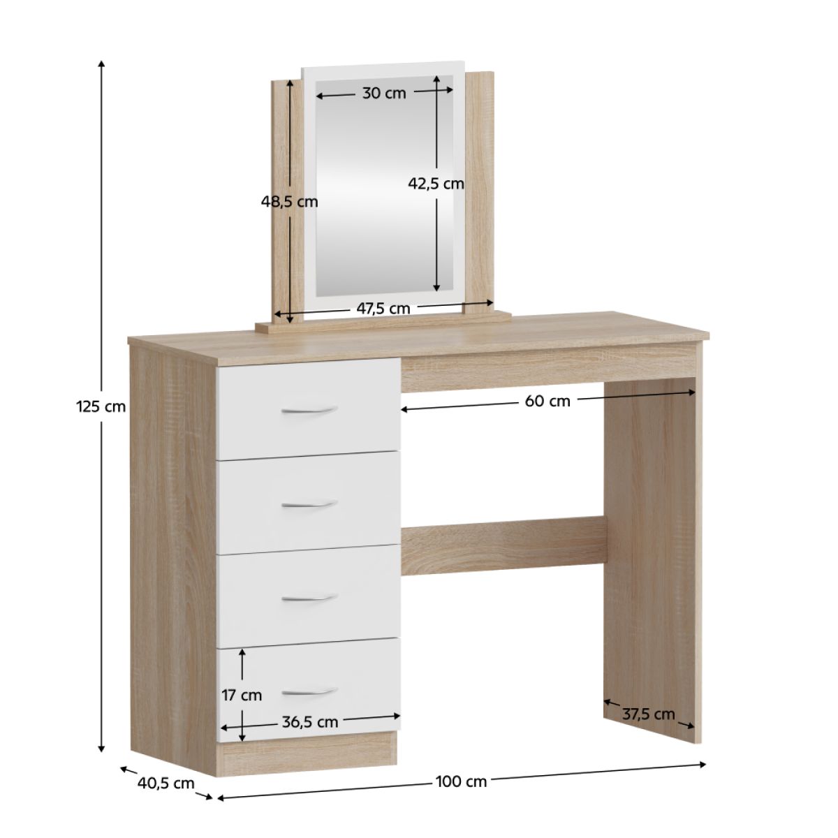 Material: MDF laminat Culoare: stejar sonoma/alb Dimensiuni (lxAxh): 100x40,5x125 cm Grosimea materialului: 1,7 cm Cu spaţiu de depozitare 4 sertare Dimensiunile sertarelor (Lxh): 36,5x17 cm Portanţă sertar: 15 kg Portanţa blatului superior: 55 kg Cu mânere Material mâner: plastic Culoare mâner: argintiu Cu oglindă Dimensiuni oglindă (Lxh): 30x42,5 cm Design modern Livrat dezasamblat
