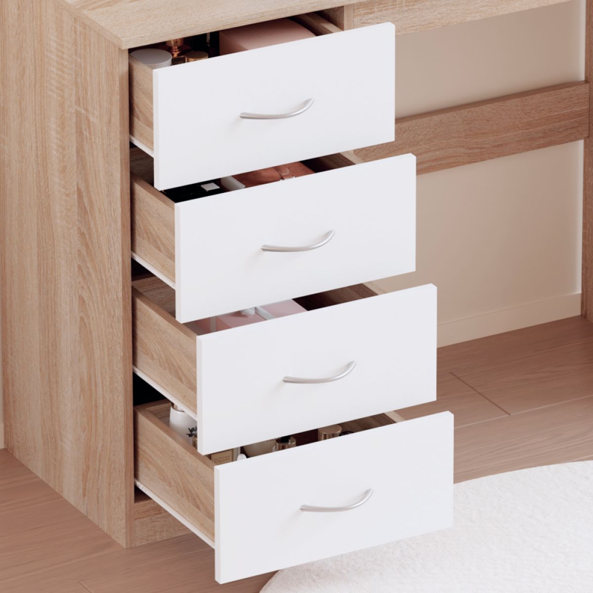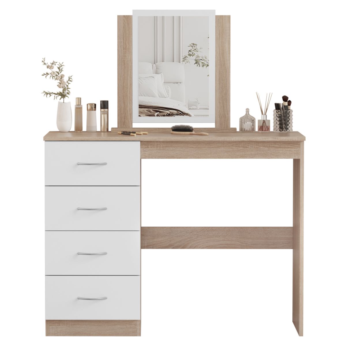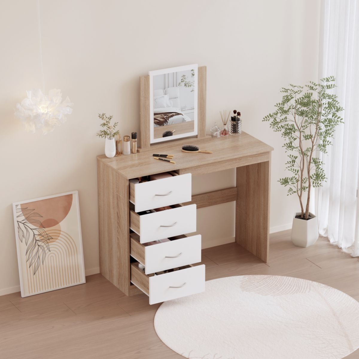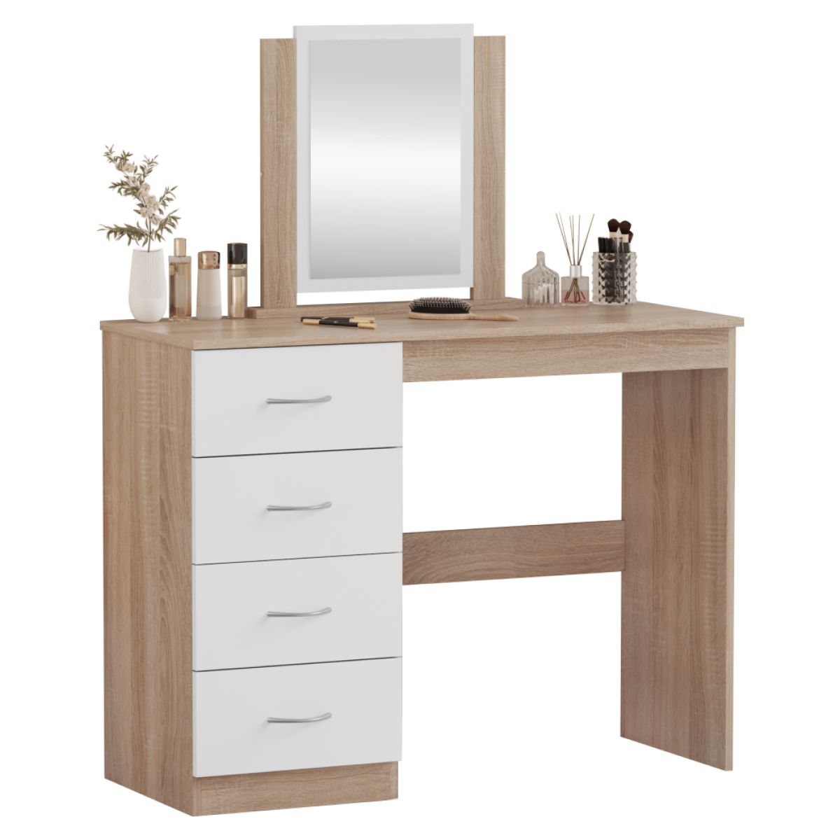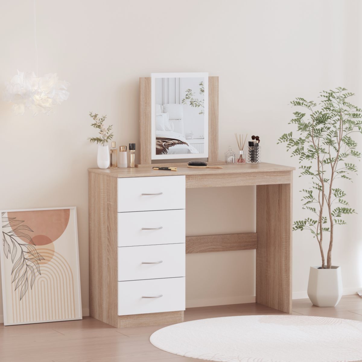 Material: MDF laminat Culoare: stejar sonoma/alb Dimensiuni (lxAxh): 100x40,5x125 cm Grosimea materialului: 1,7 cm Cu spaţiu de depozitare 4 sertare Dimensiunile sertarelor (Lxh): 36,5x17 cm Portanţă sertar: 15 kg Portanţa blatului superior: 55 kg Cu mânere Material mâner: plastic Culoare mâner: argintiu Cu oglindă Dimensiuni oglindă (Lxh): 30x42,5 cm Design modern Livrat dezasamblat